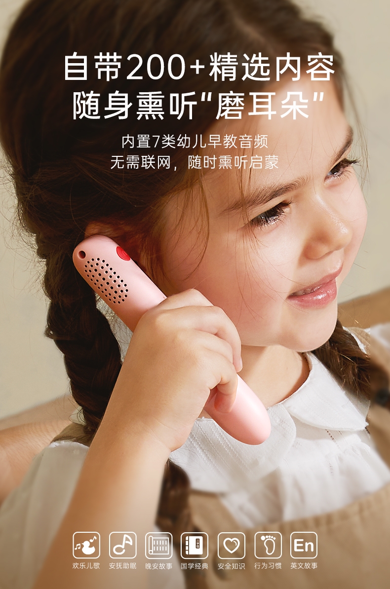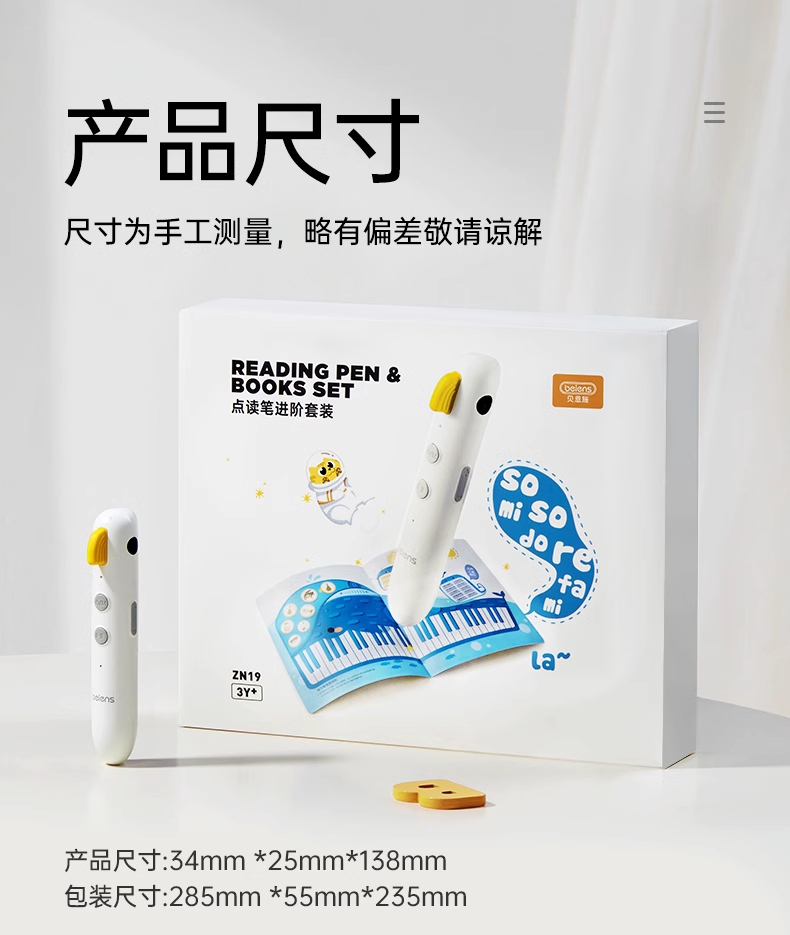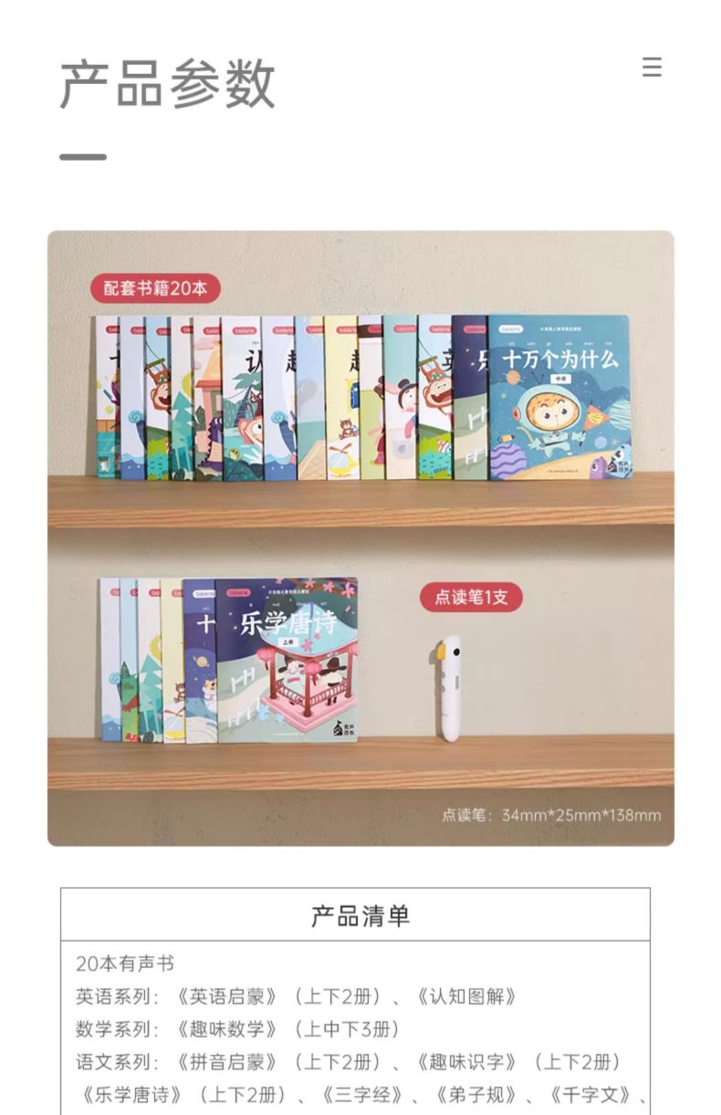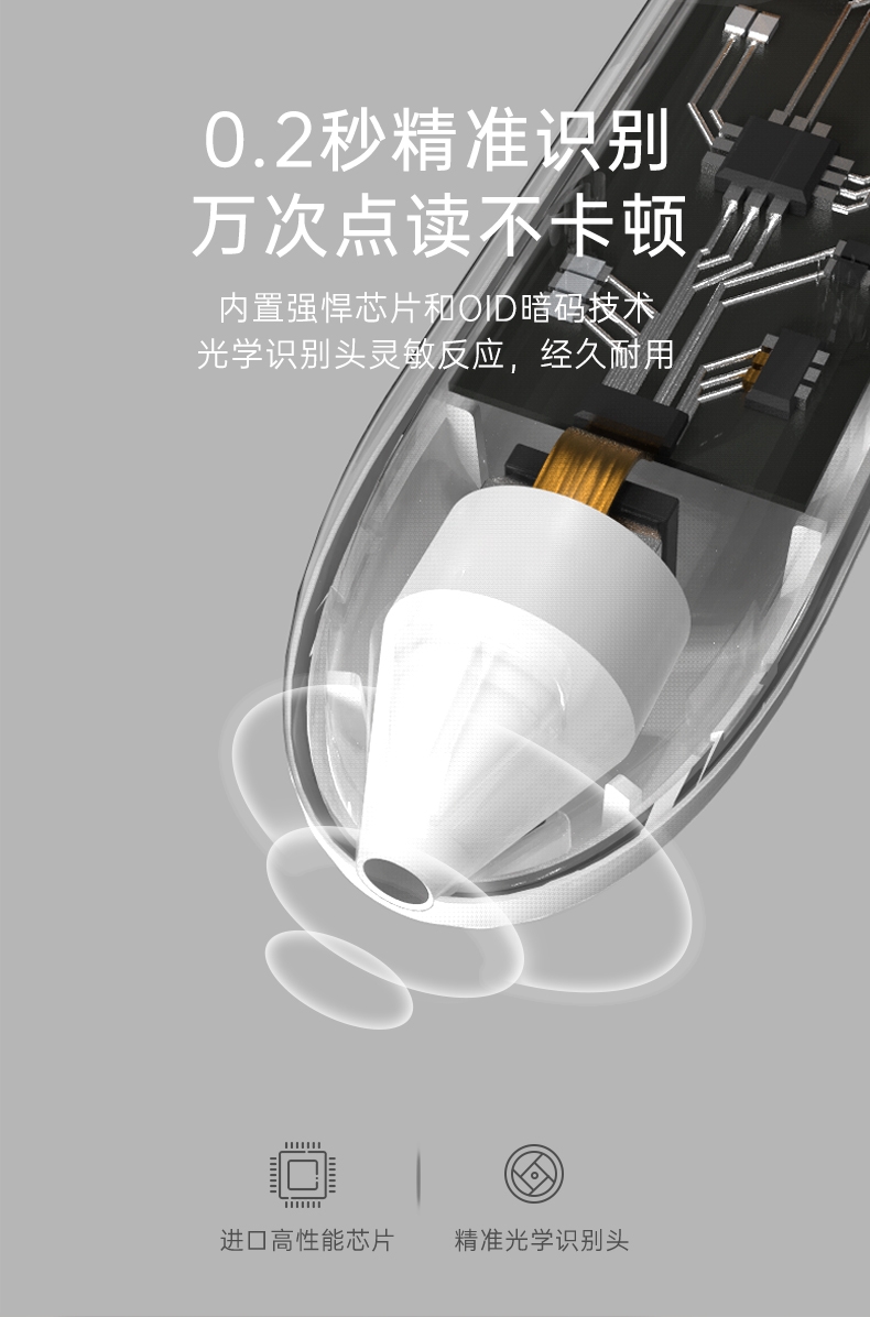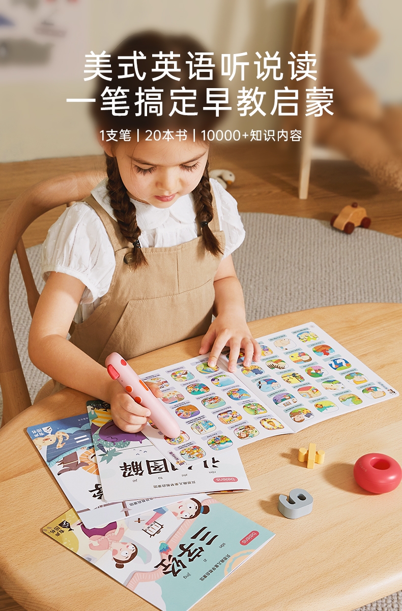 研发更小体积更适合儿童;精准识别,清晰指向收音;人声清晰响亮,配套点读资源丰富