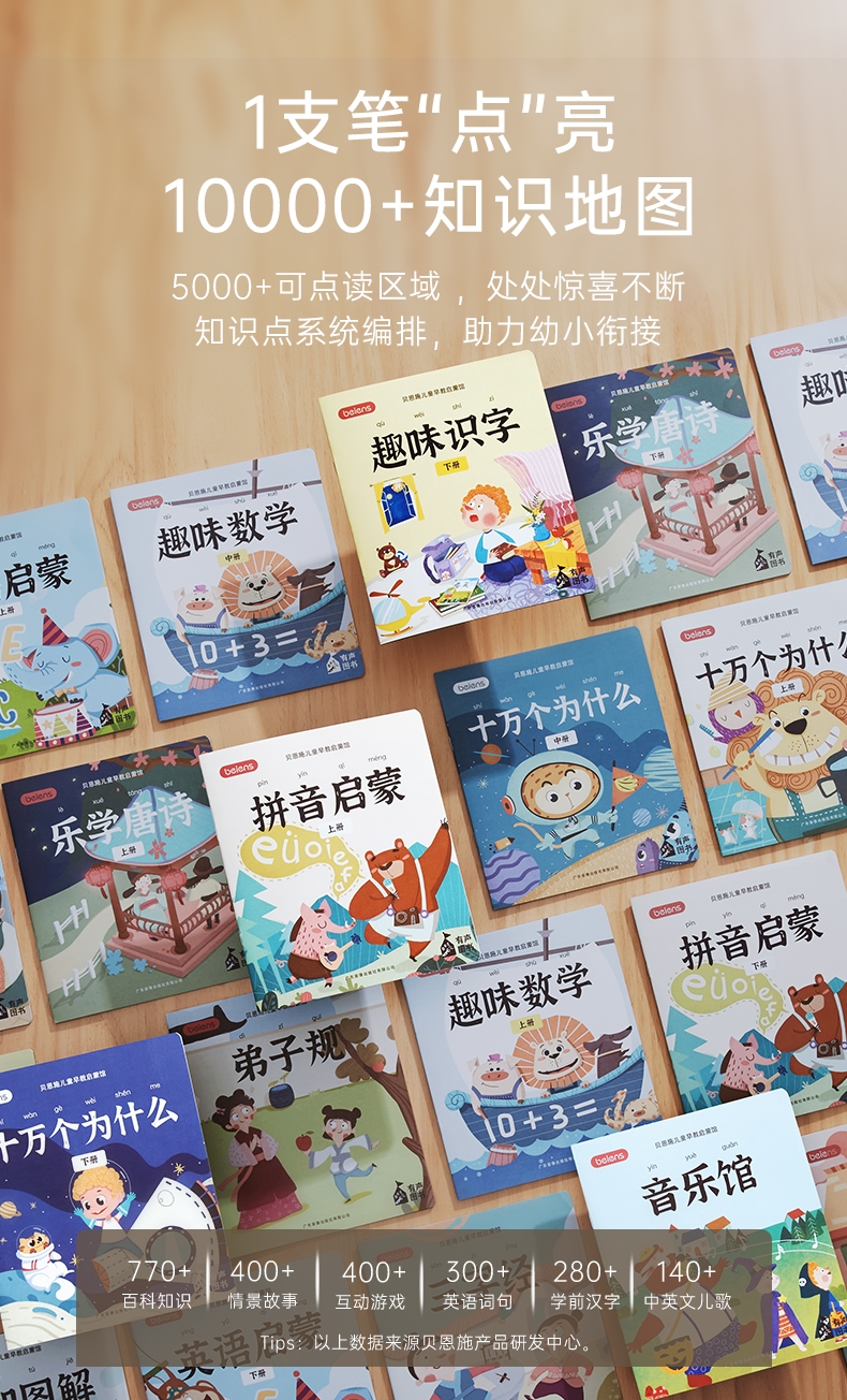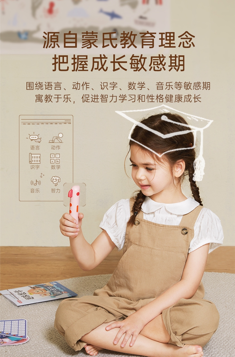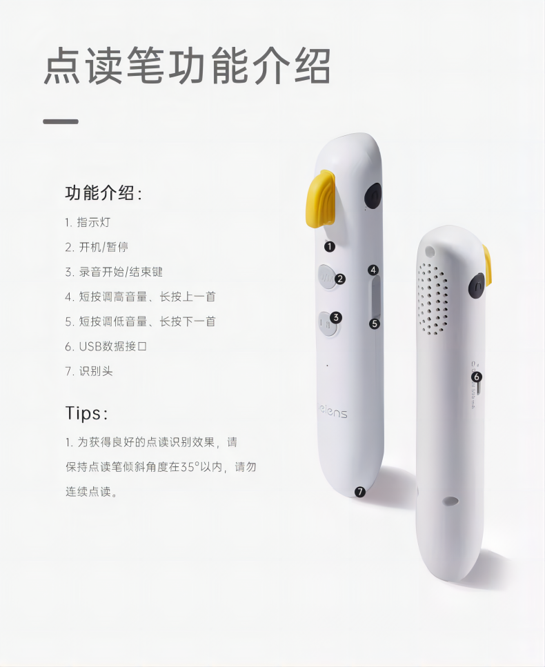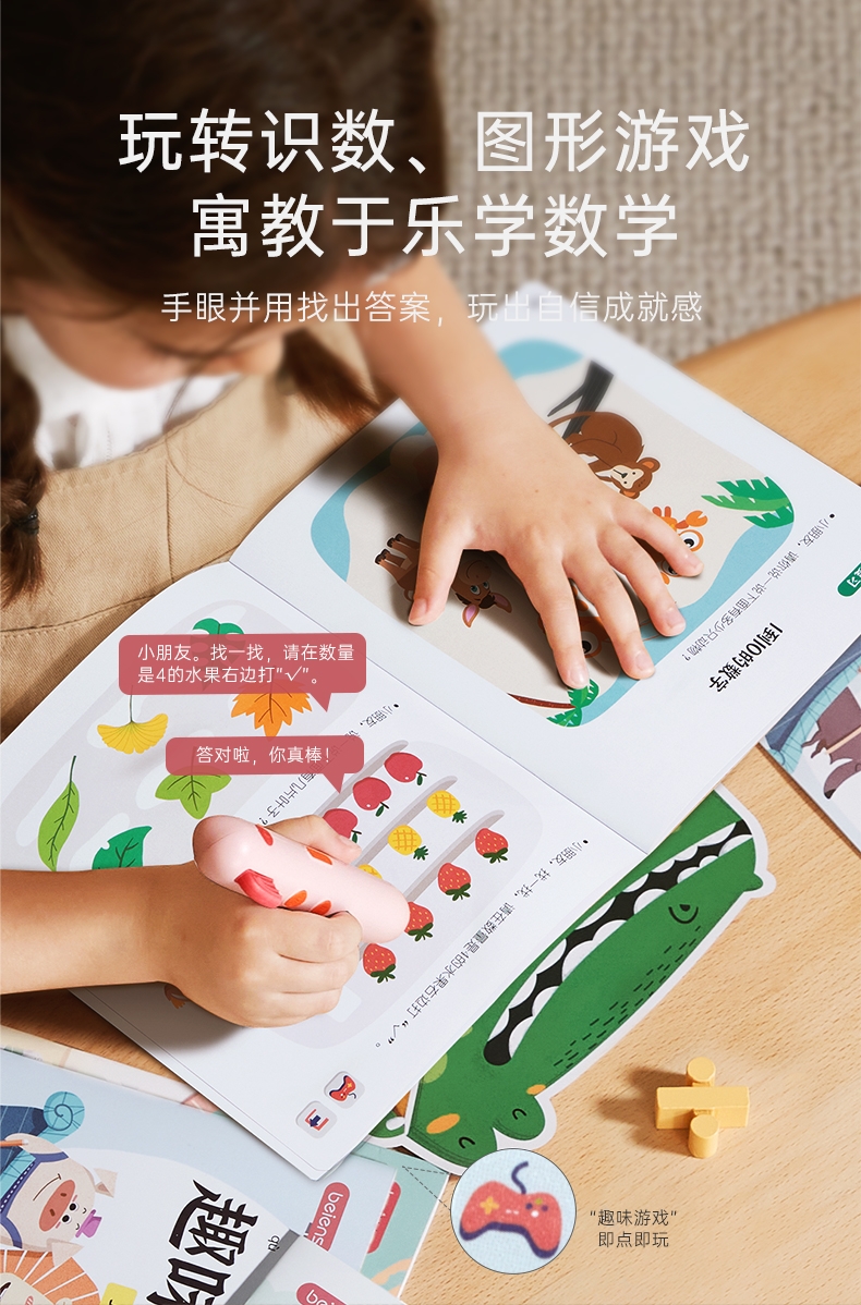 研发更小体积更适合儿童;精准识别,清晰指向收音;人声清晰响亮,配套点读资源丰富