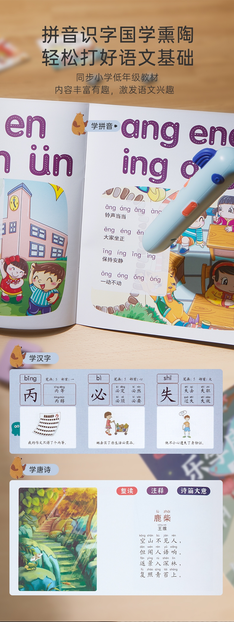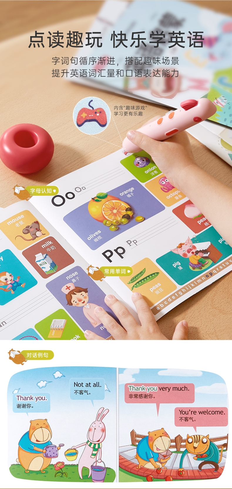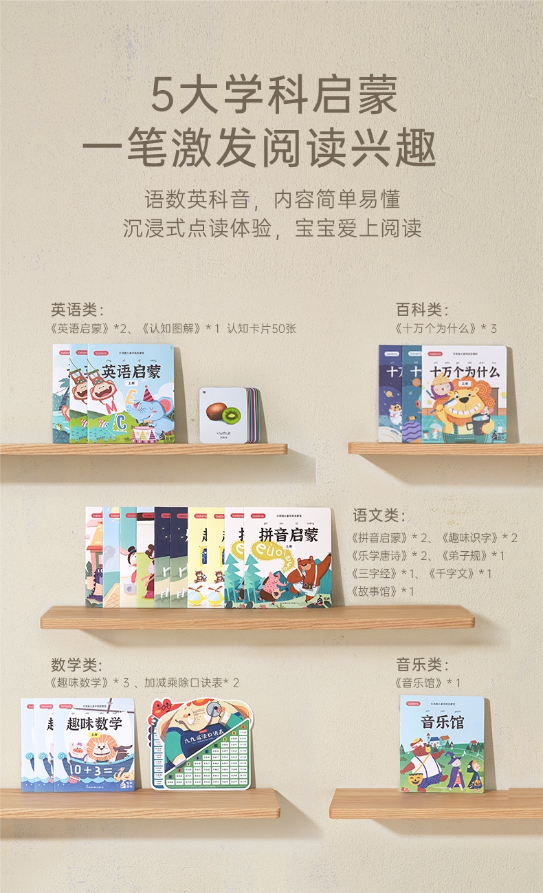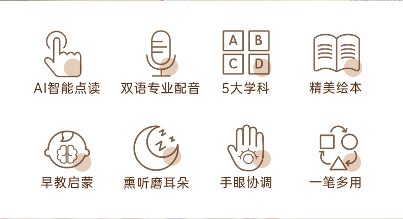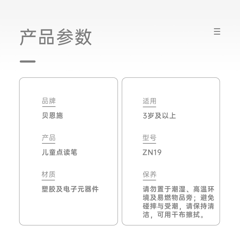 研发更小体积更适合儿童;精准识别,清晰指向收音;人声清晰响亮,配套点读资源丰富