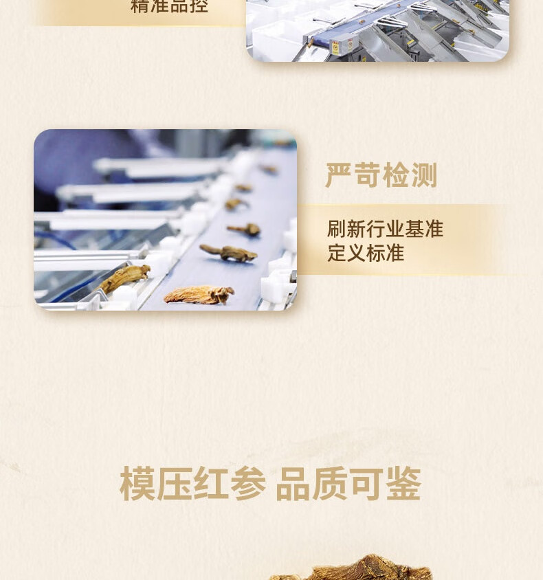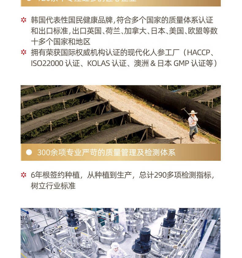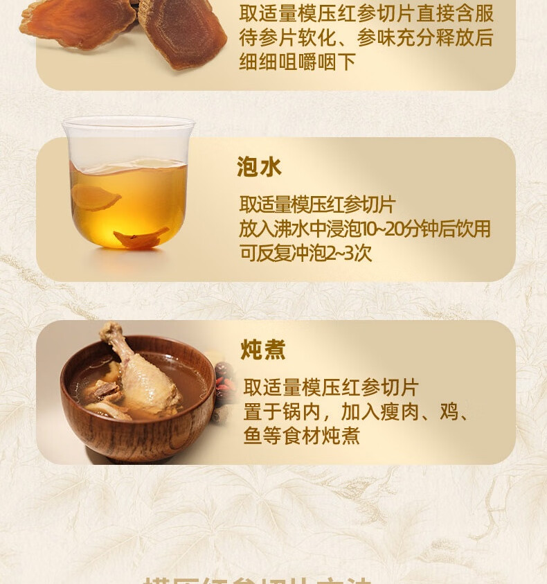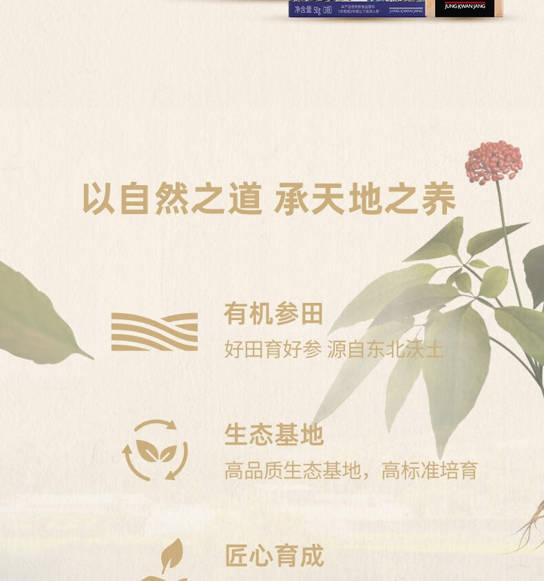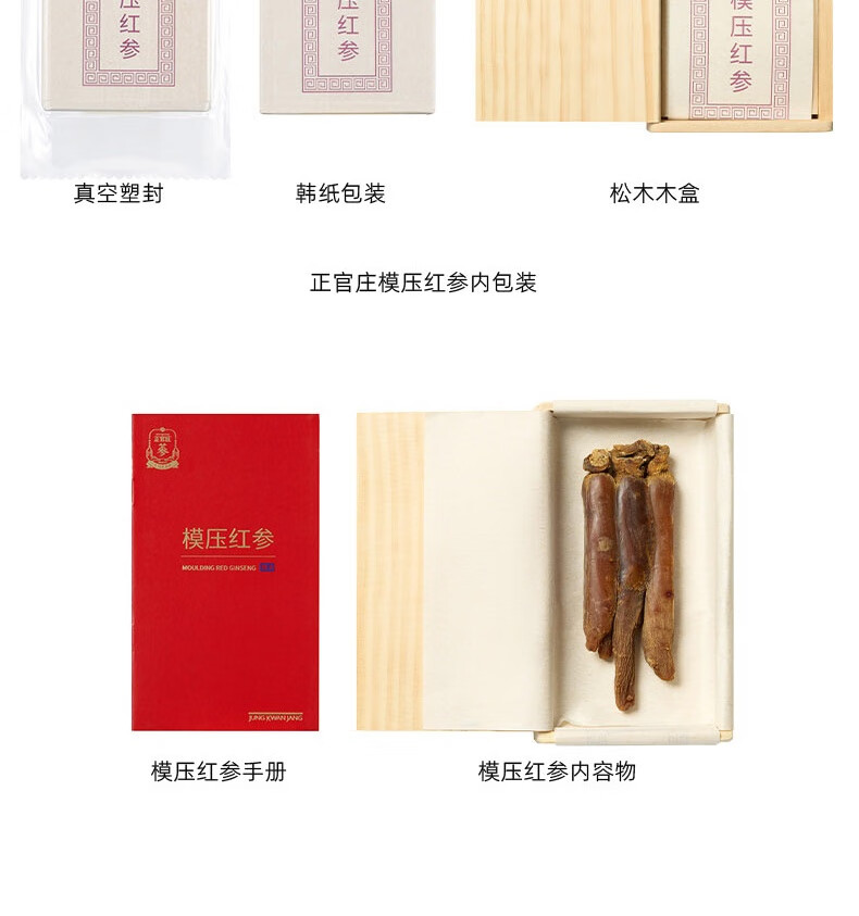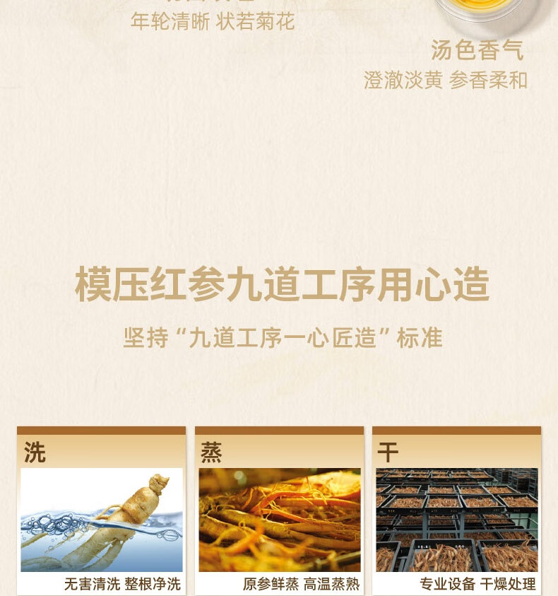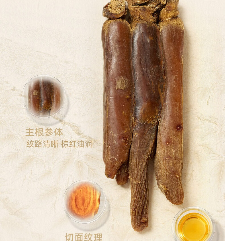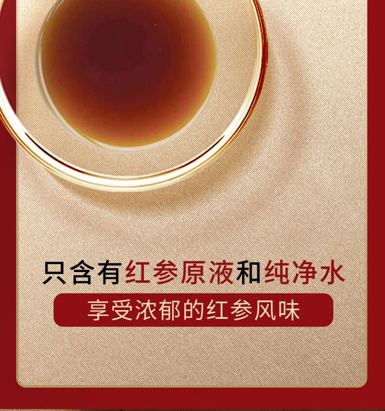 整根模压,根根精华;主根参体纹路清晰,棕红油润;纯净水中的100%红参原液,每包含量3.0