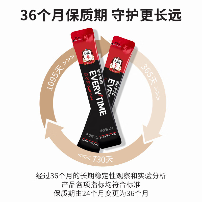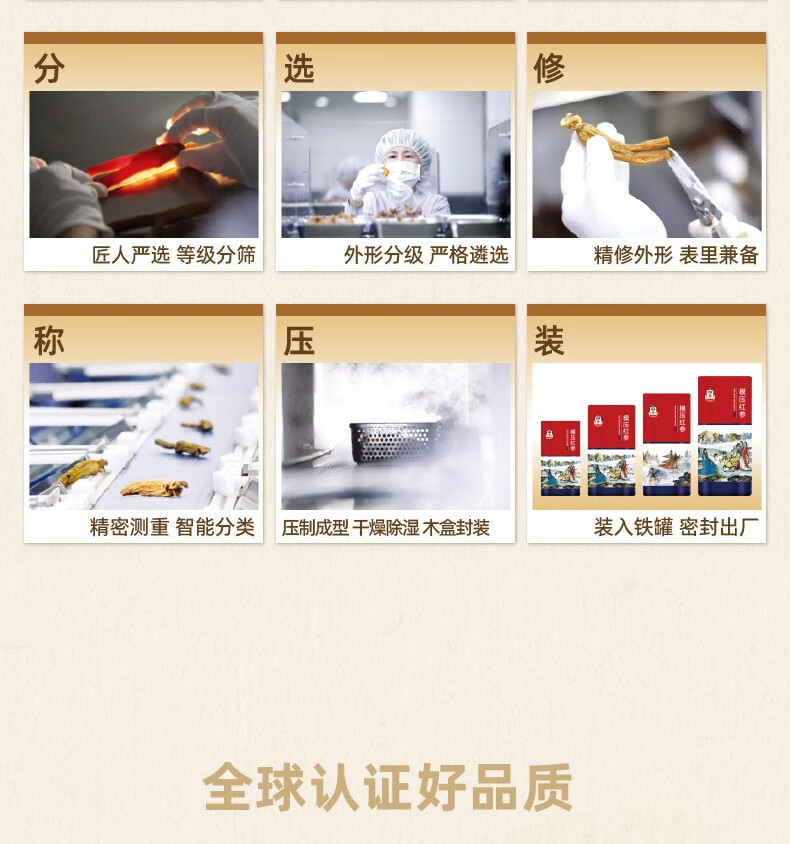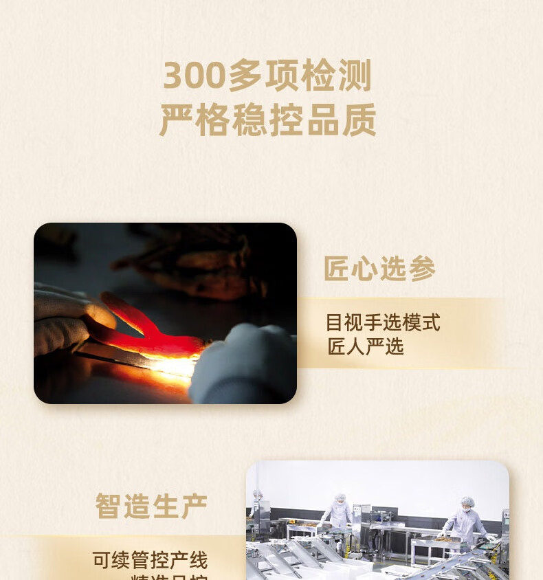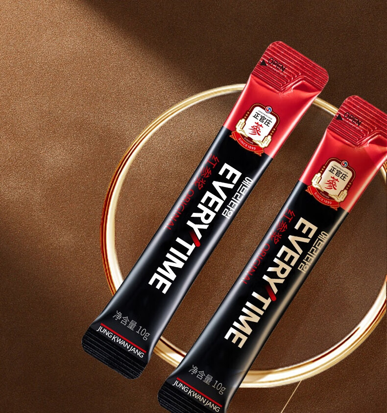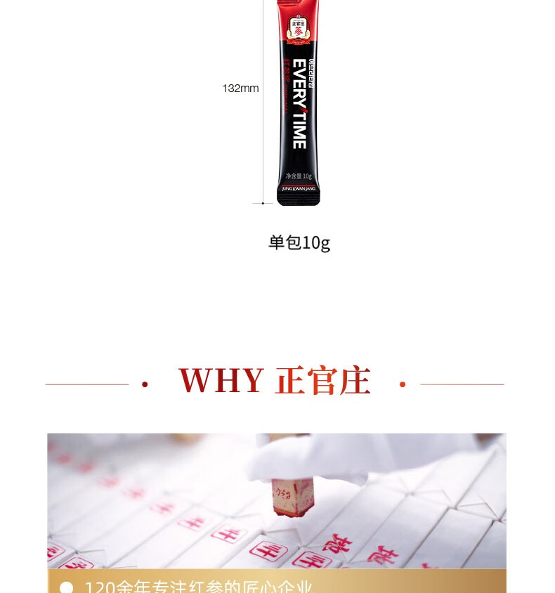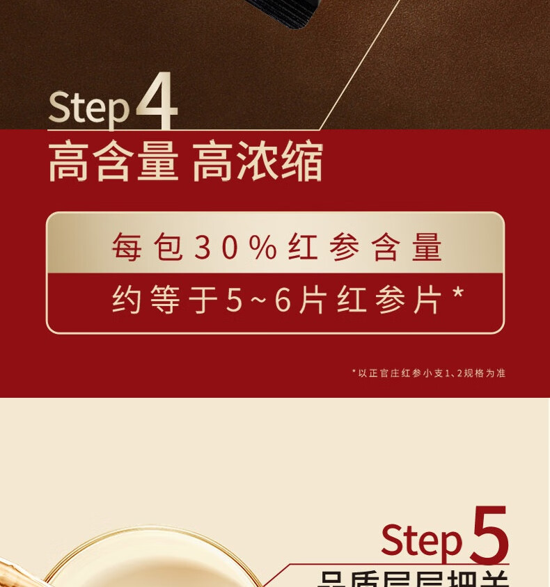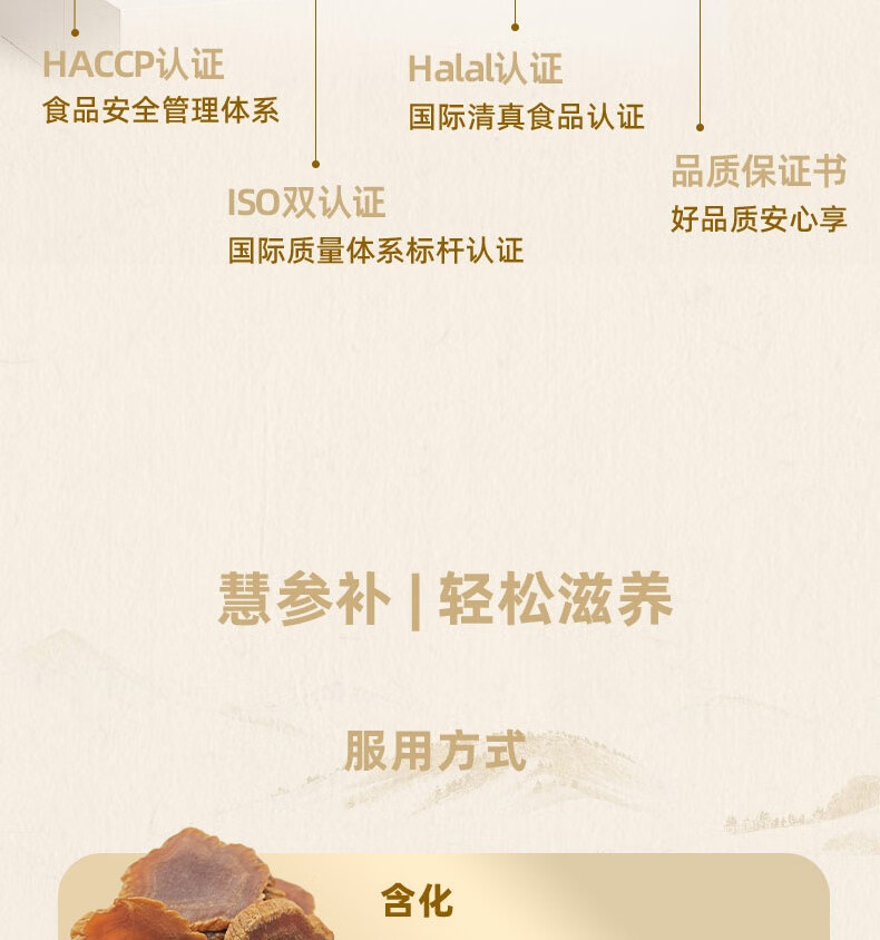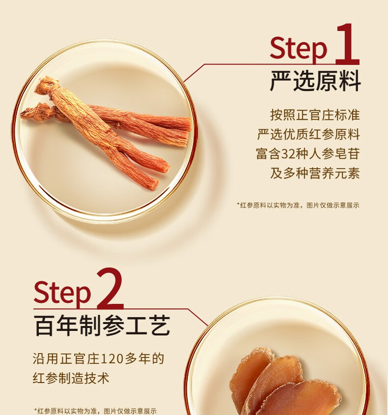 整根模压,根根精华;主根参体纹路清晰,棕红油润;纯净水中的100%红参原液,每包含量3.0