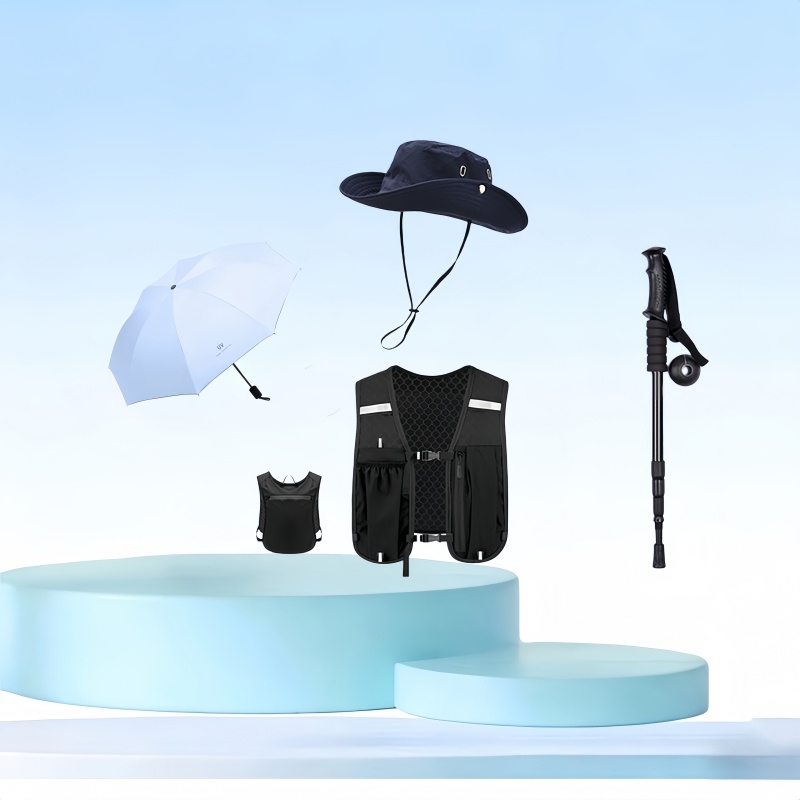 组合形式:(防晒帽马甲背包登山杖雨伞)