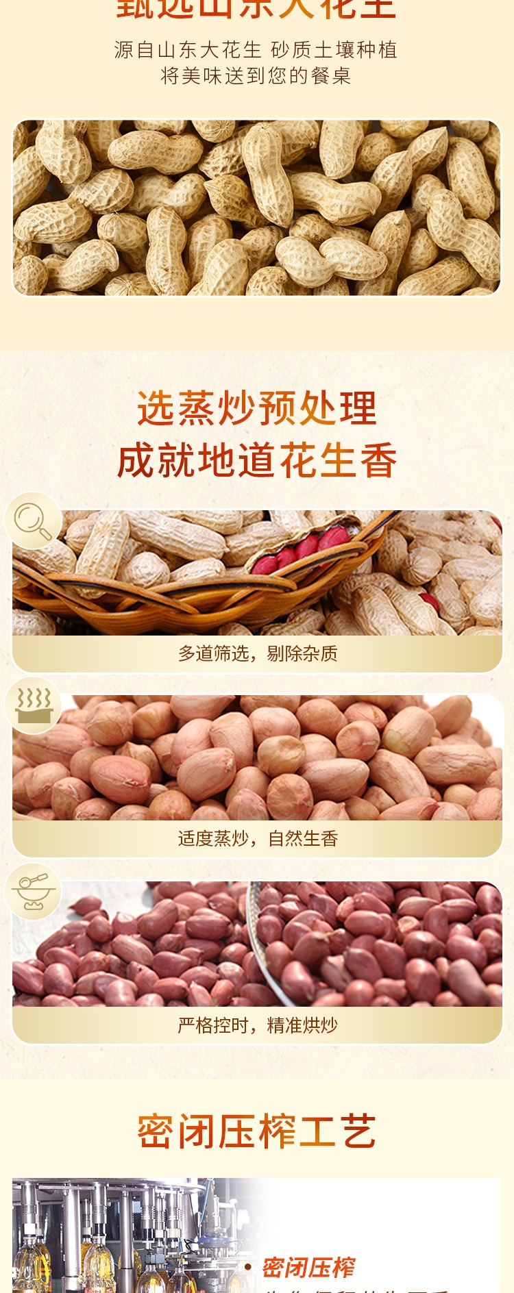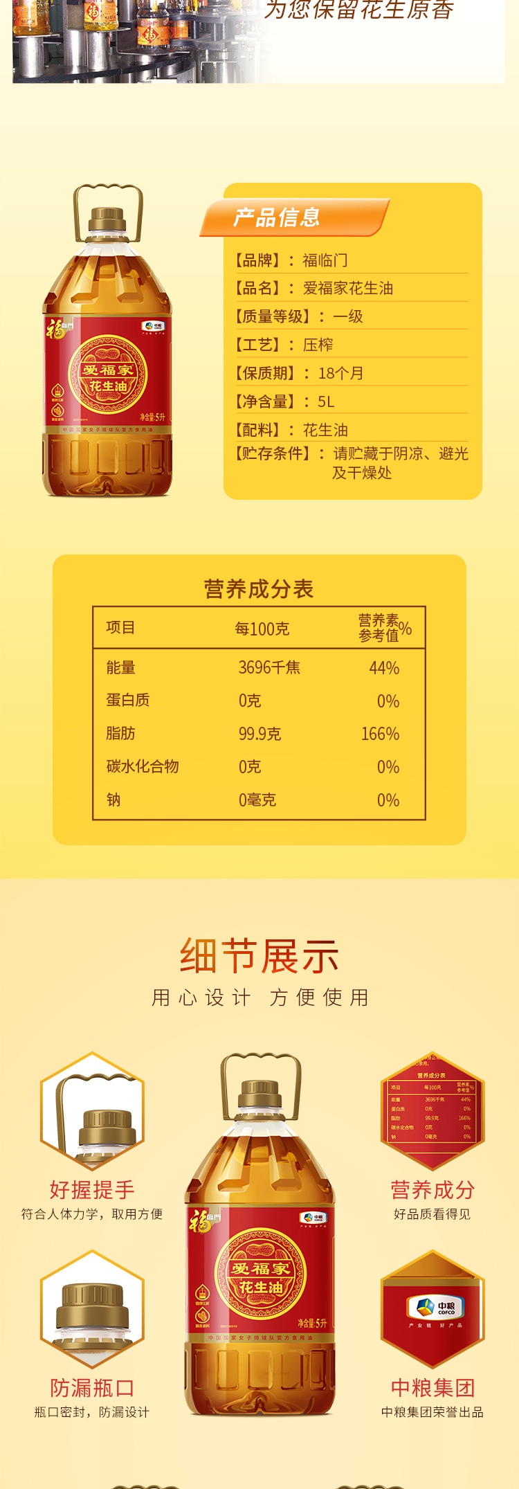非转基因花生原料,物理压榨保留自然醇香;品质烟点高,煎炒烹炸少油烟更健康;大容量家庭装,经济实惠满足日常所需