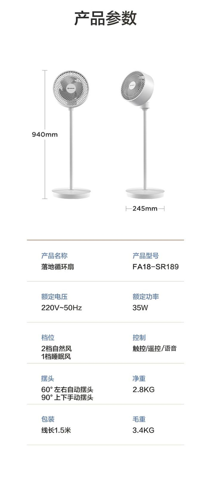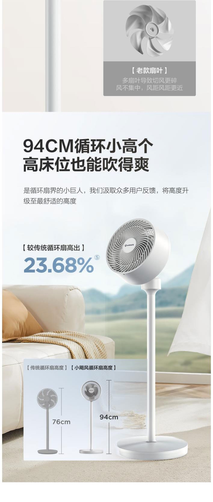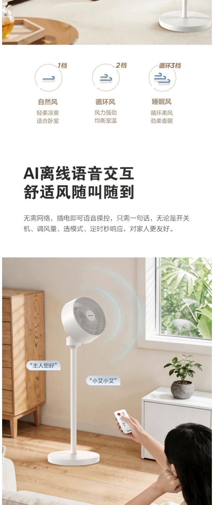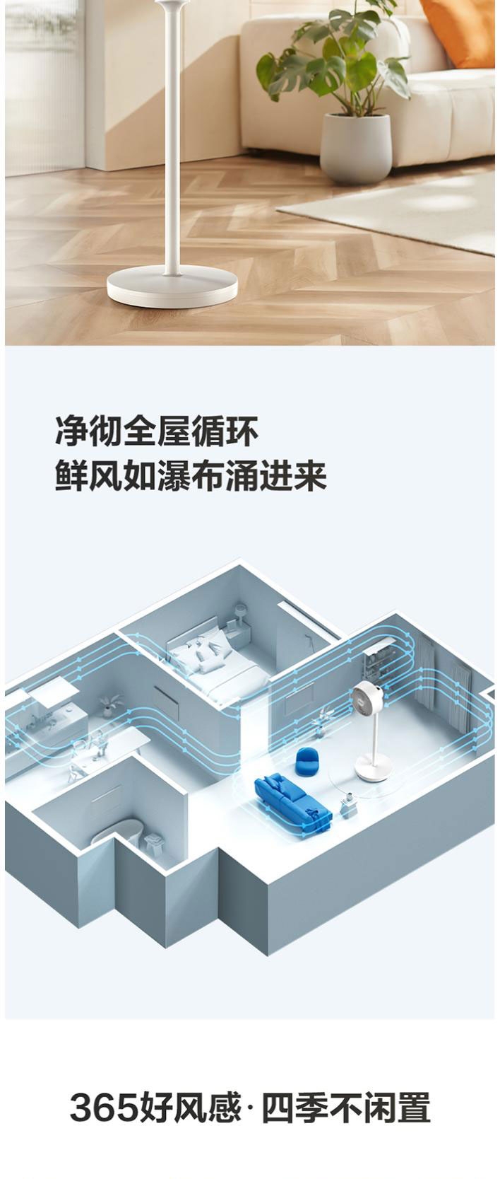 AI语音控制,“芯闪”语音系统,语音控制快如闪电;左右110°自动摆头,上下90°手动摆头;【94CM身高】颀长身姿,送风范围更广
