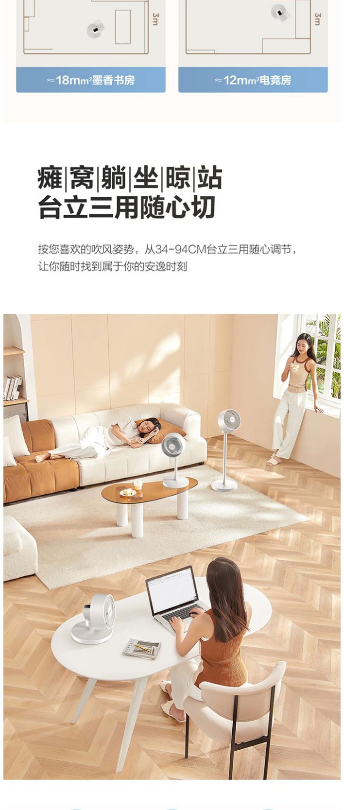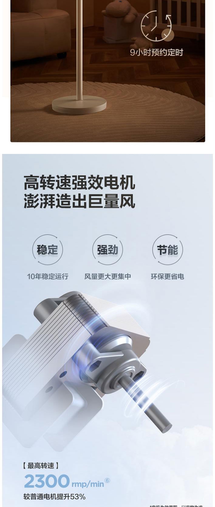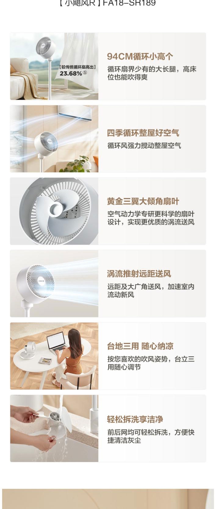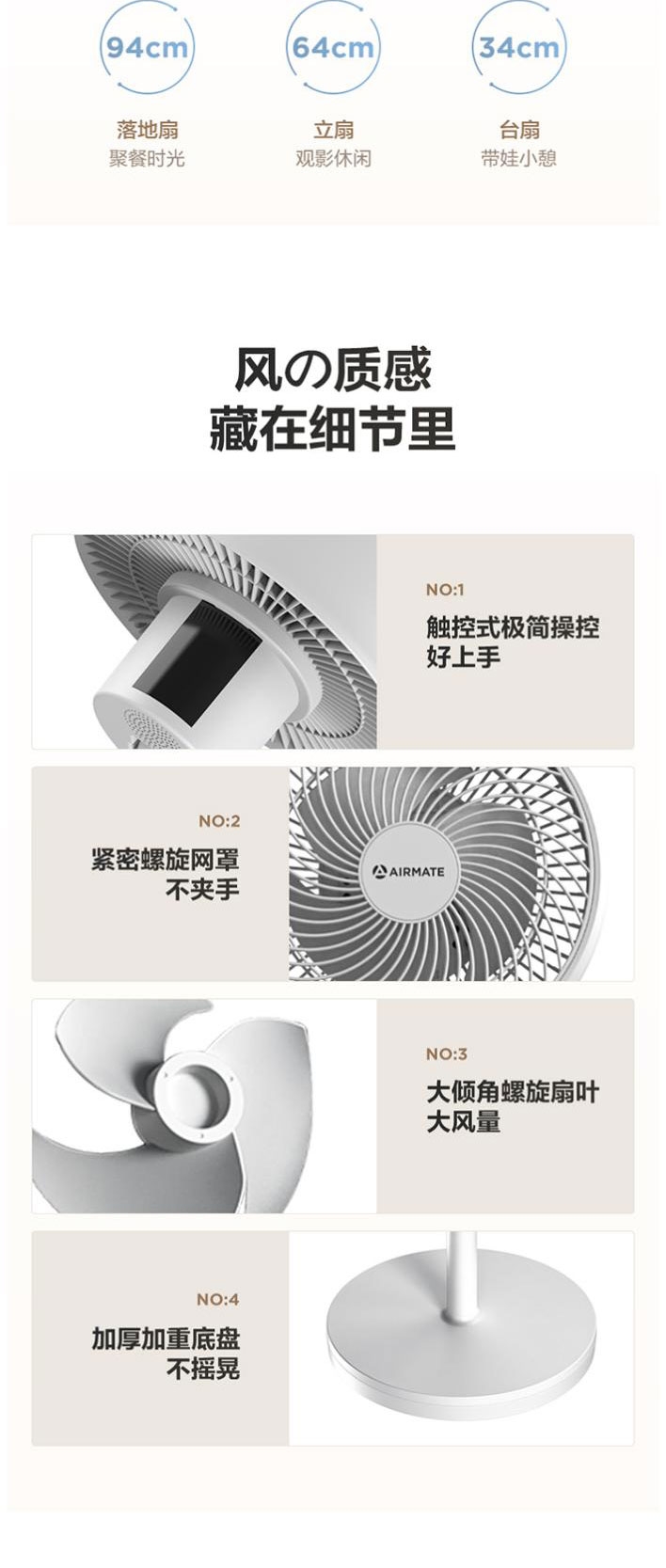 AI语音控制,“芯闪”语音系统,语音控制快如闪电;左右110°自动摆头,上下90°手动摆头;【94CM身高】颀长身姿,送风范围更广
