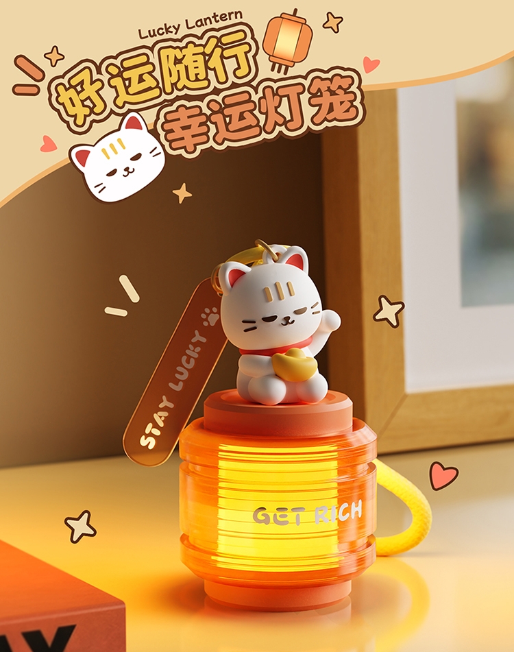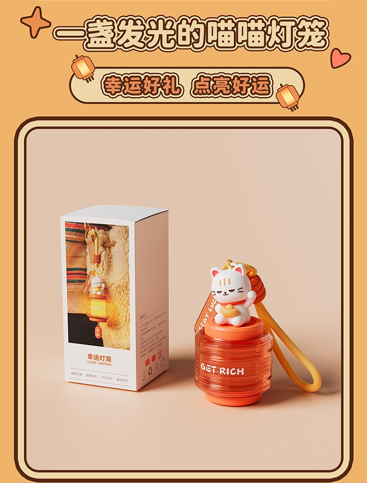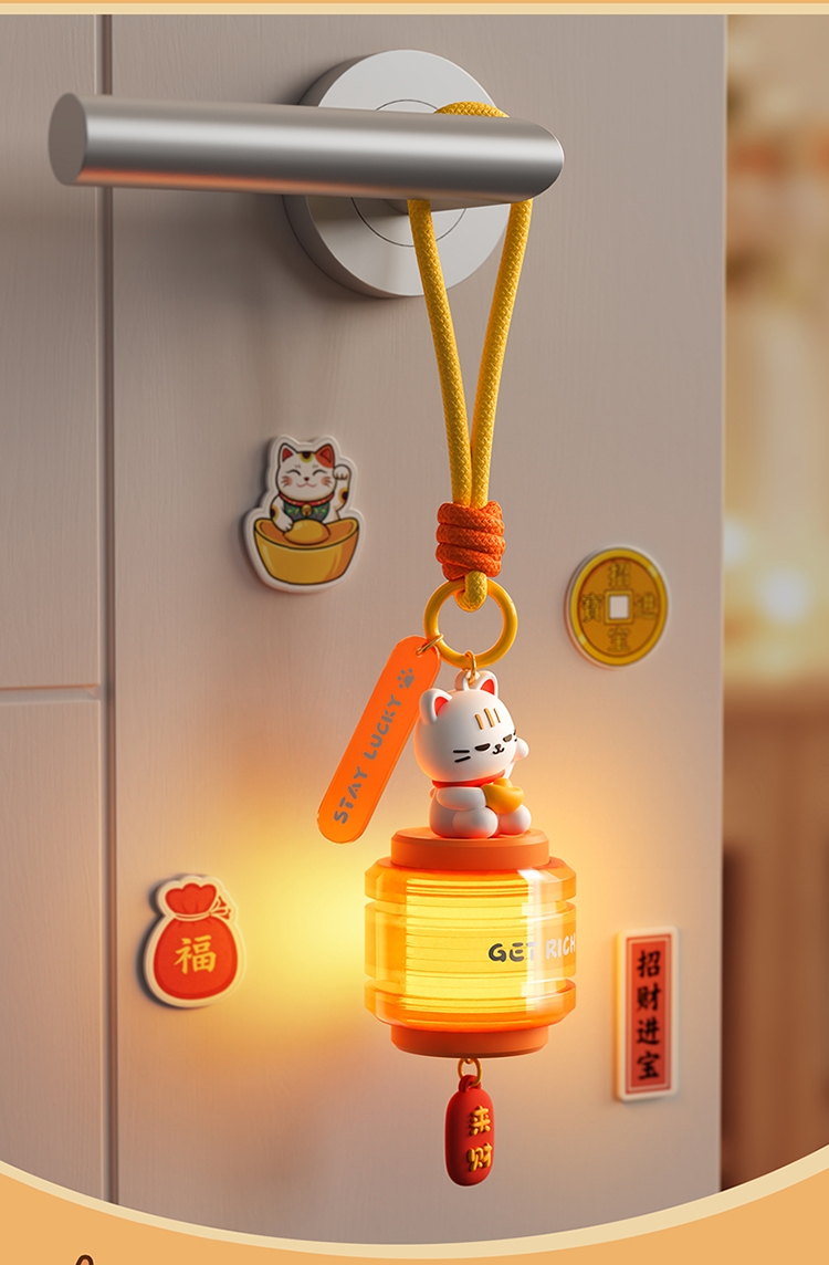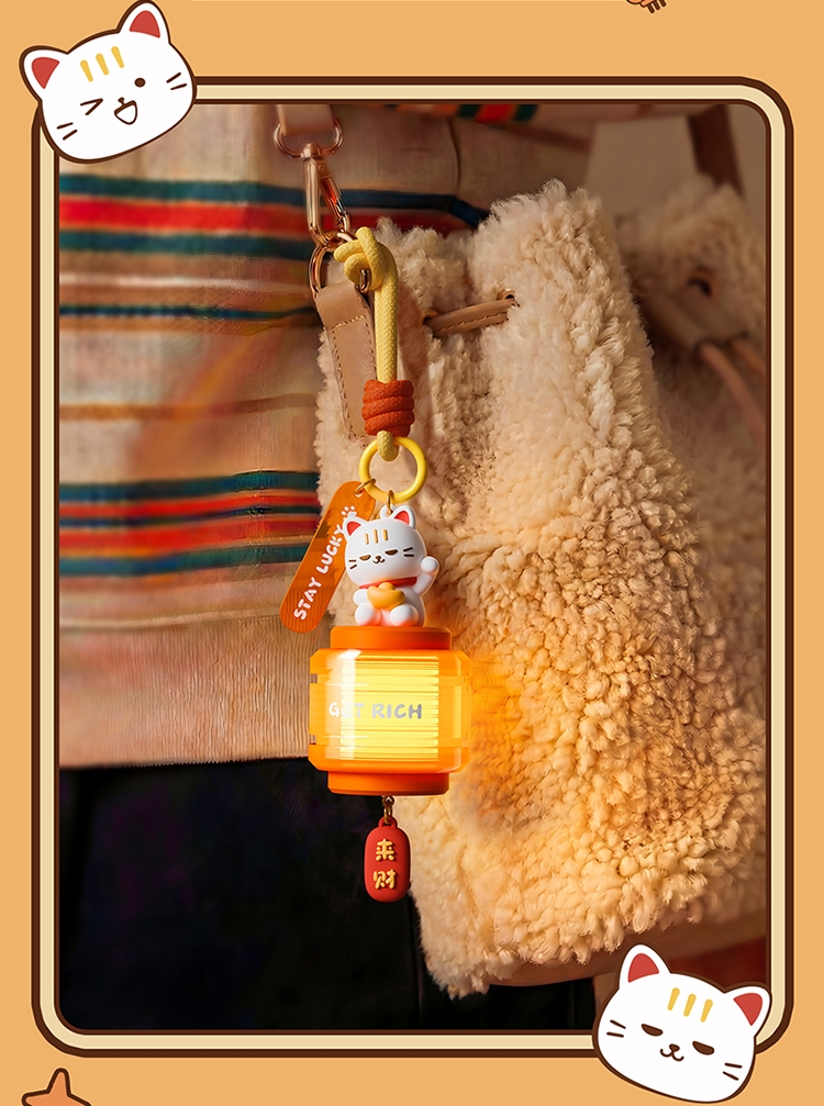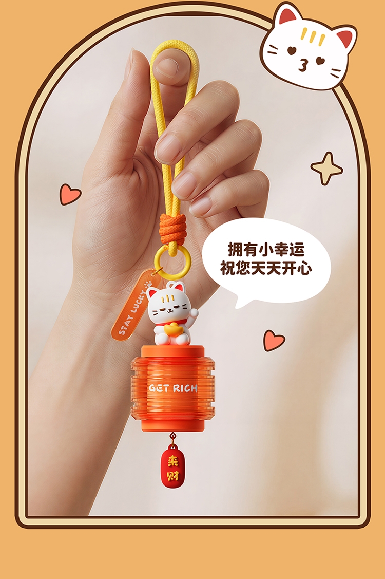 萌趣招财猫 + 国风灯笼造型,颜值直接拉满;暖光柔光不刺眼,挂在哪都是氛围感神器;「GET RICH」+「来财」双 buff 加持,; 可挂包、挂门、挂床头,一物多用超实用