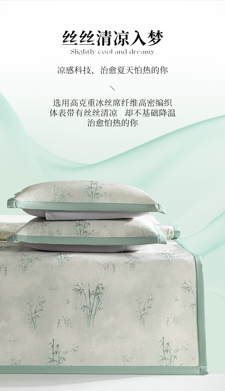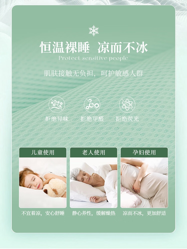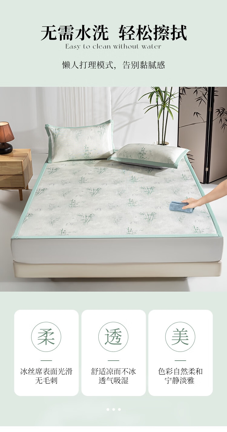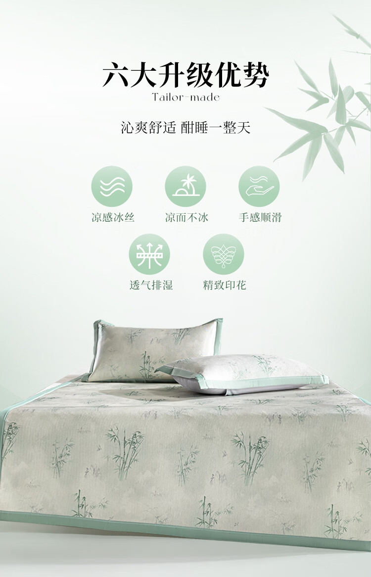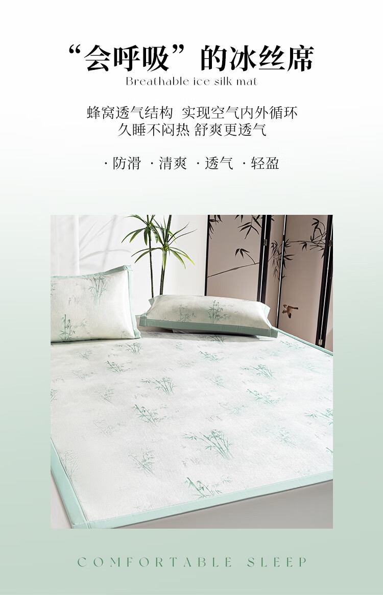 席面细腻滑润,透气性好;冰丝席凉而不冰,可在空调房内使用;健康安全,无论老人还是儿童都可以使用