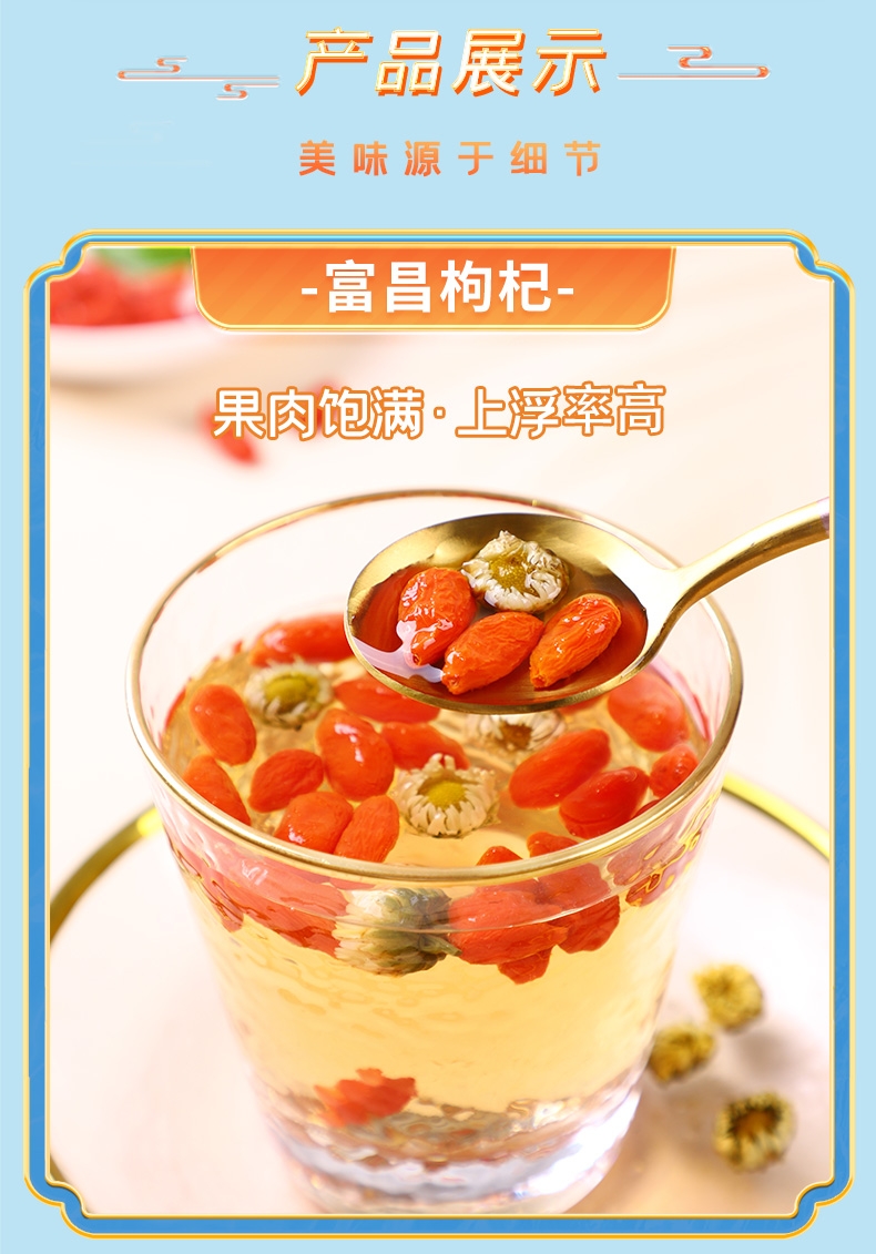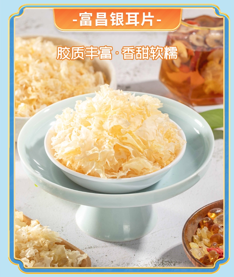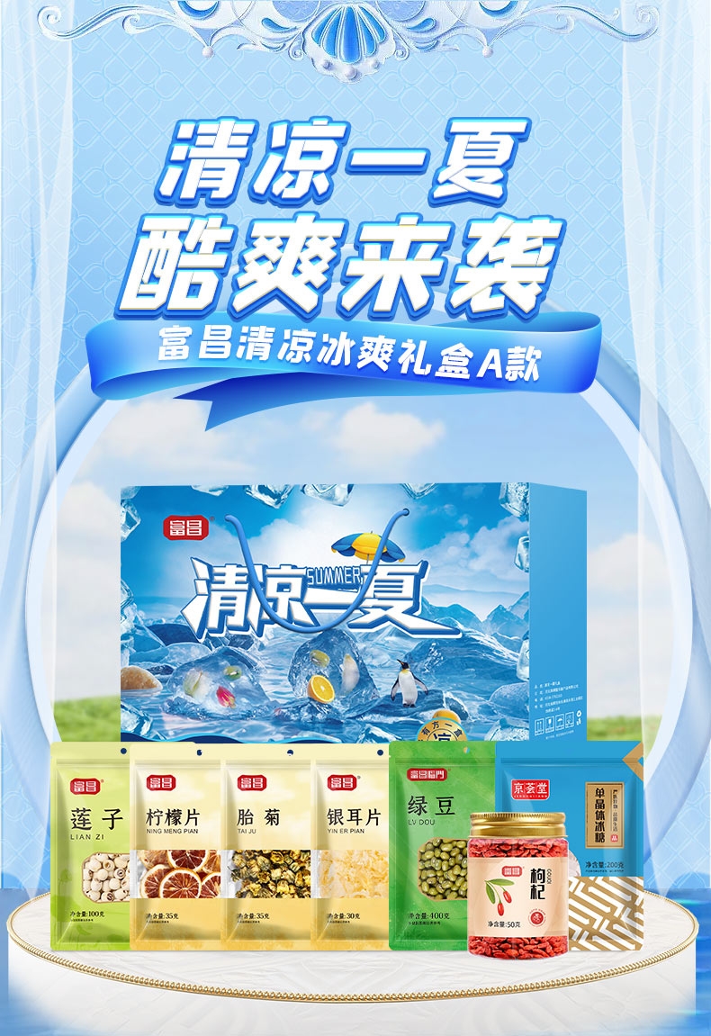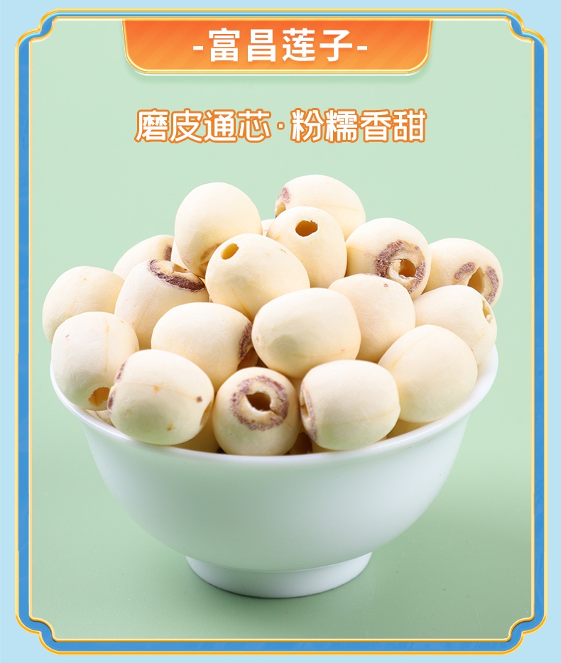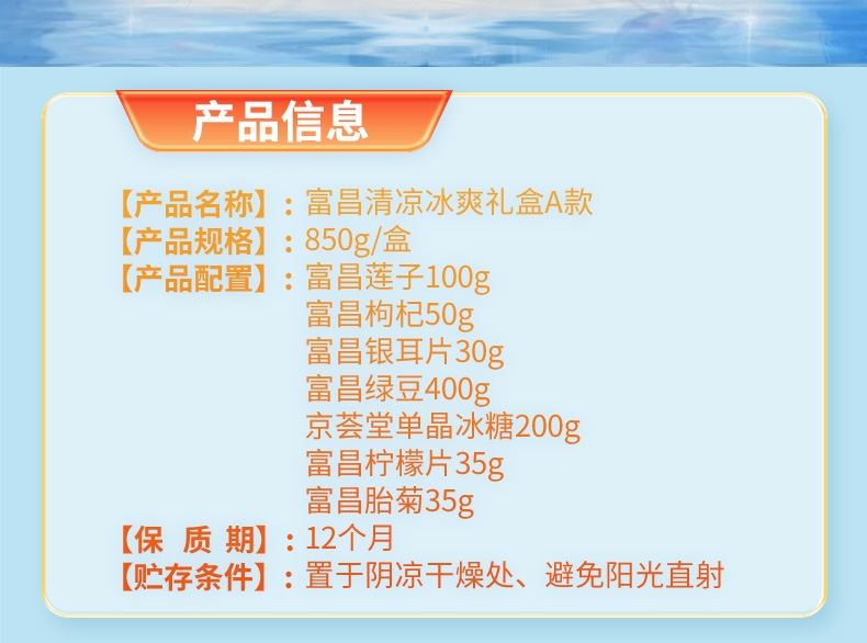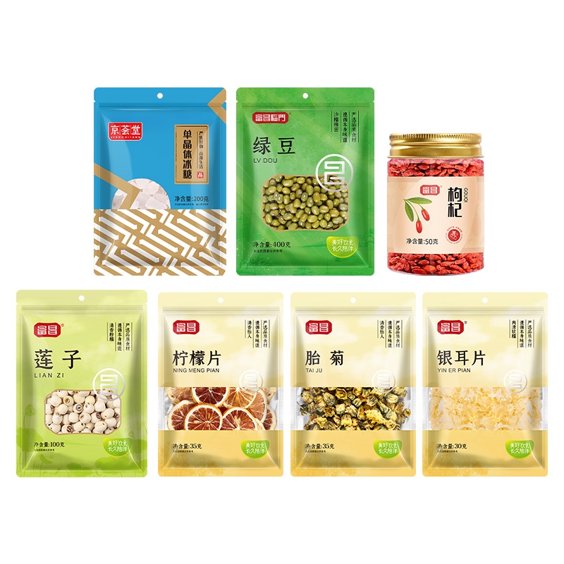 配置清单:富昌莲子100g 富昌枸杞50g 富昌银耳片30g 富昌绿豆400g 京荟堂单晶冰糖200g 富昌柠檬片35g 富昌胎菊35g