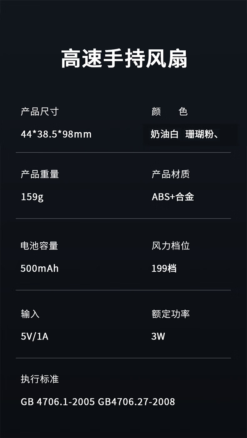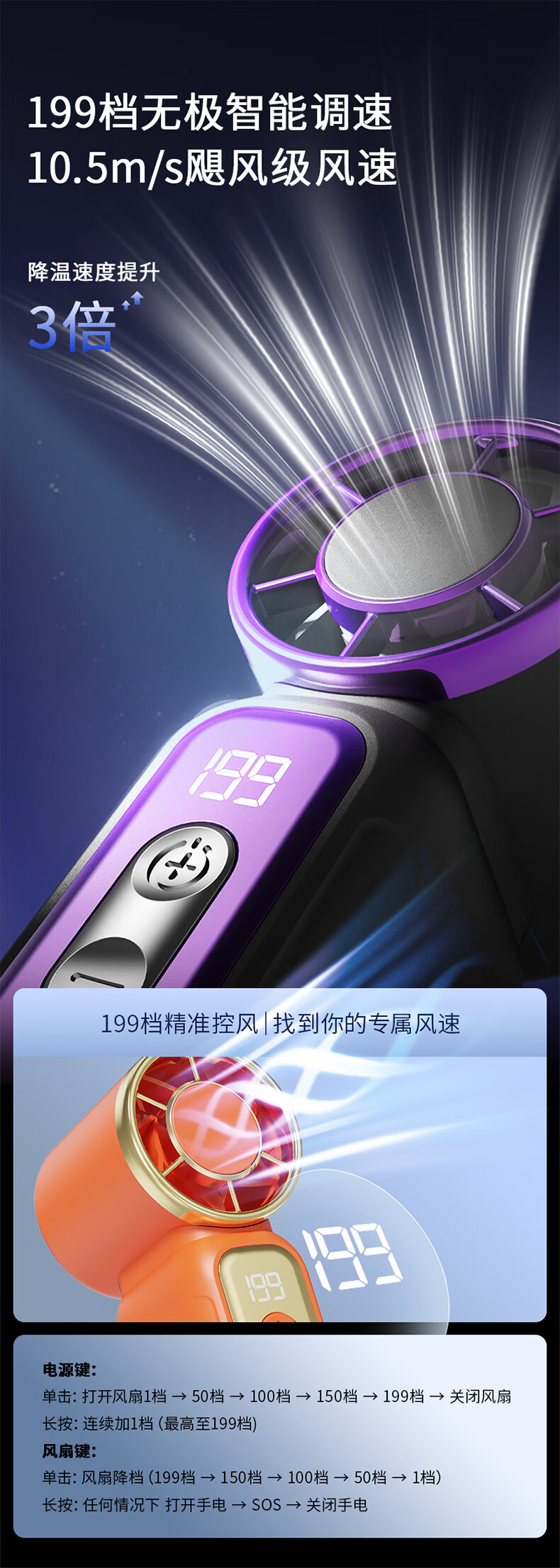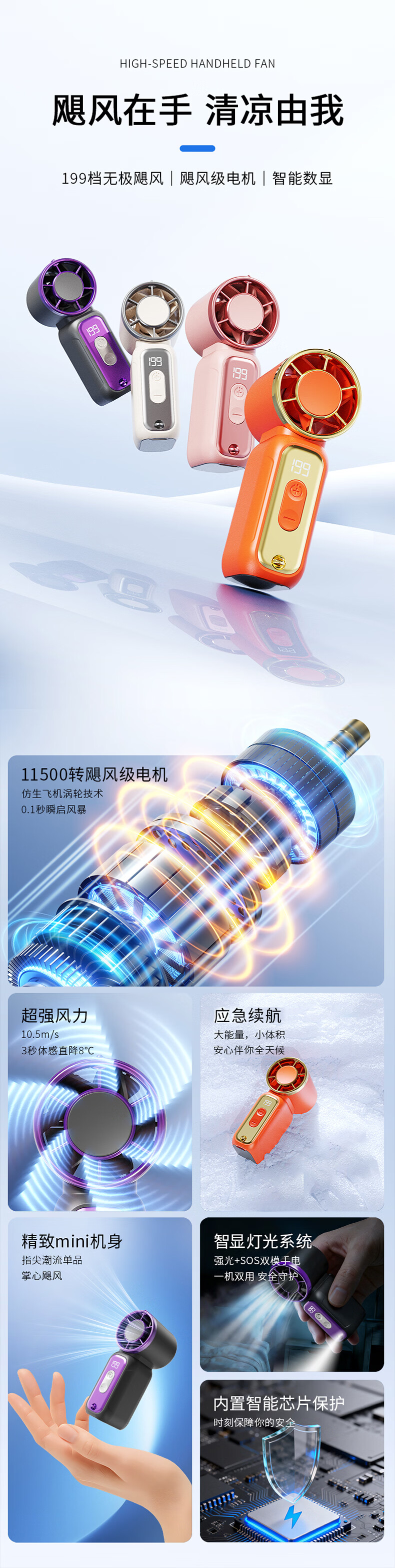产品风量199档可调;风力强劲,简洁时尚;产品小巧携带方便,可定制企业LOGO