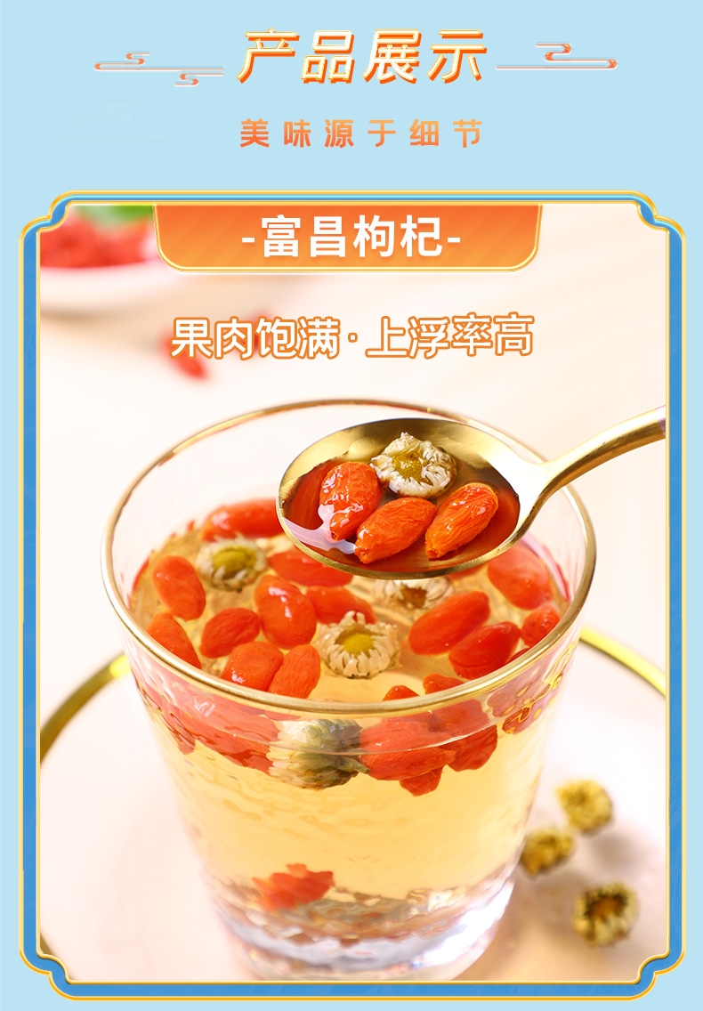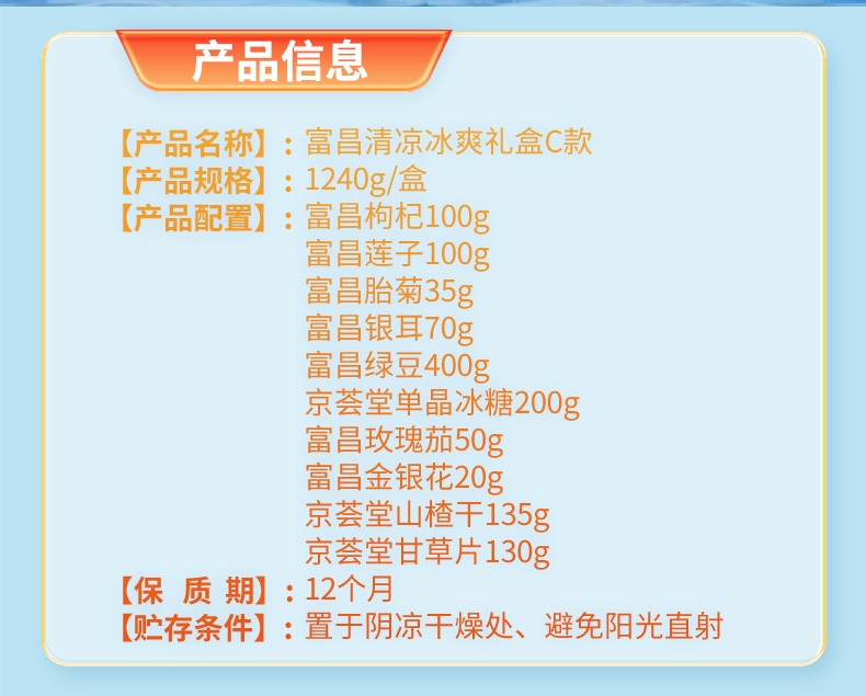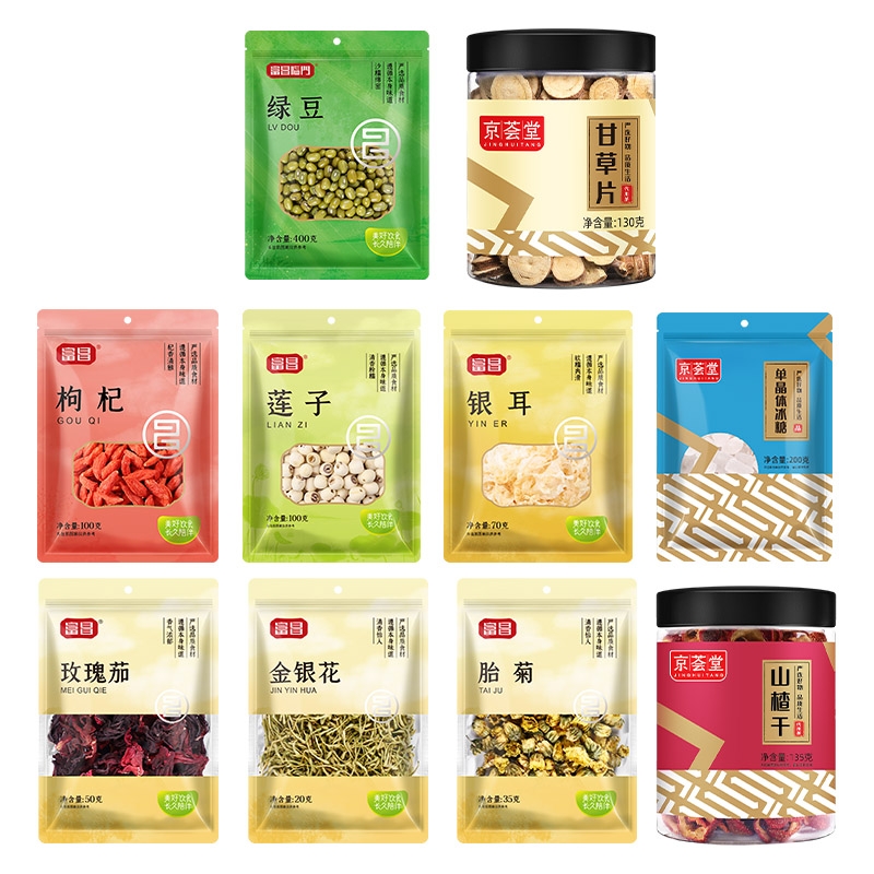 配置清单:富昌枸杞100g 富昌莲子100g 富昌胎菊35g 富昌银耳70g 富昌绿豆400g 京荟堂单晶冰糖200g 富昌玫瑰茄50g 富昌金银花20g 京荟堂山楂干135g 京荟堂甘草片130g