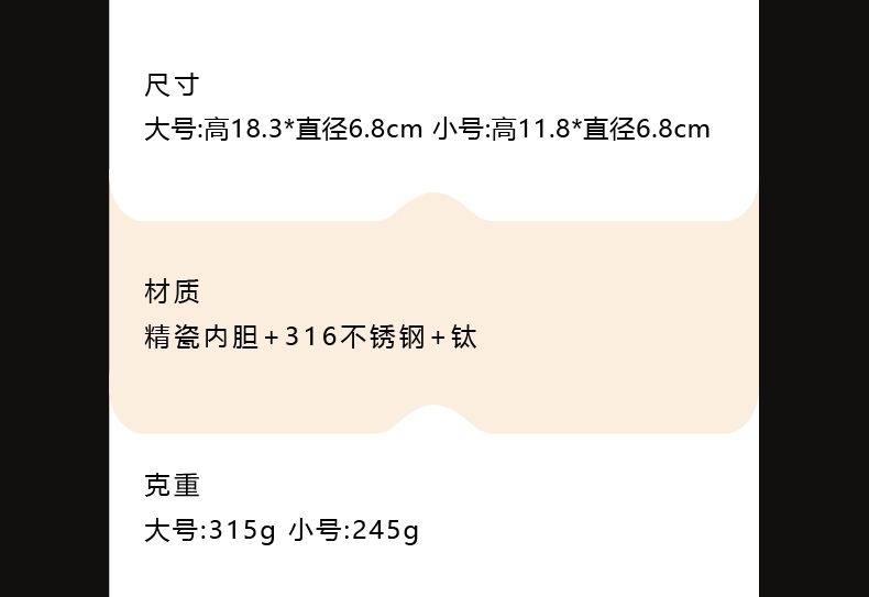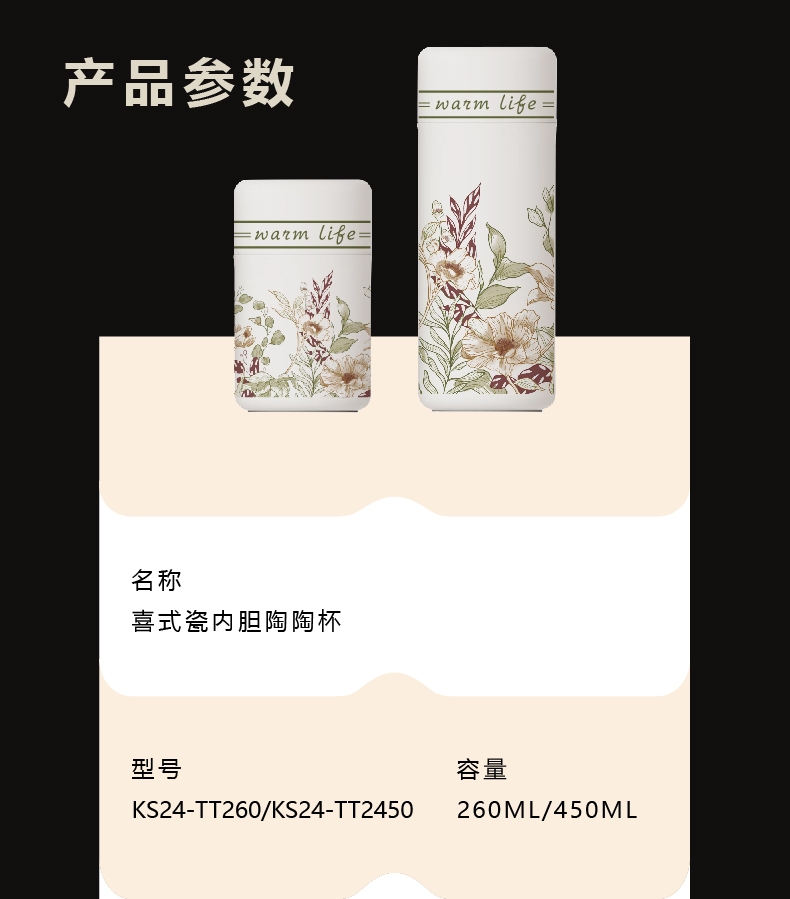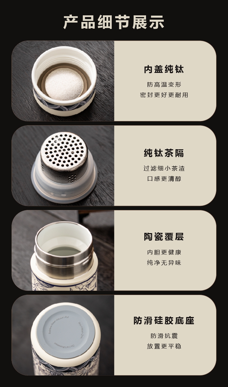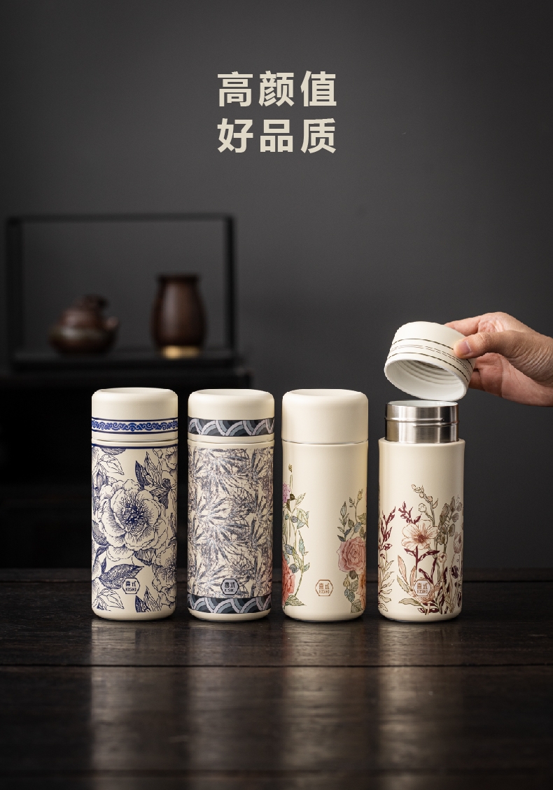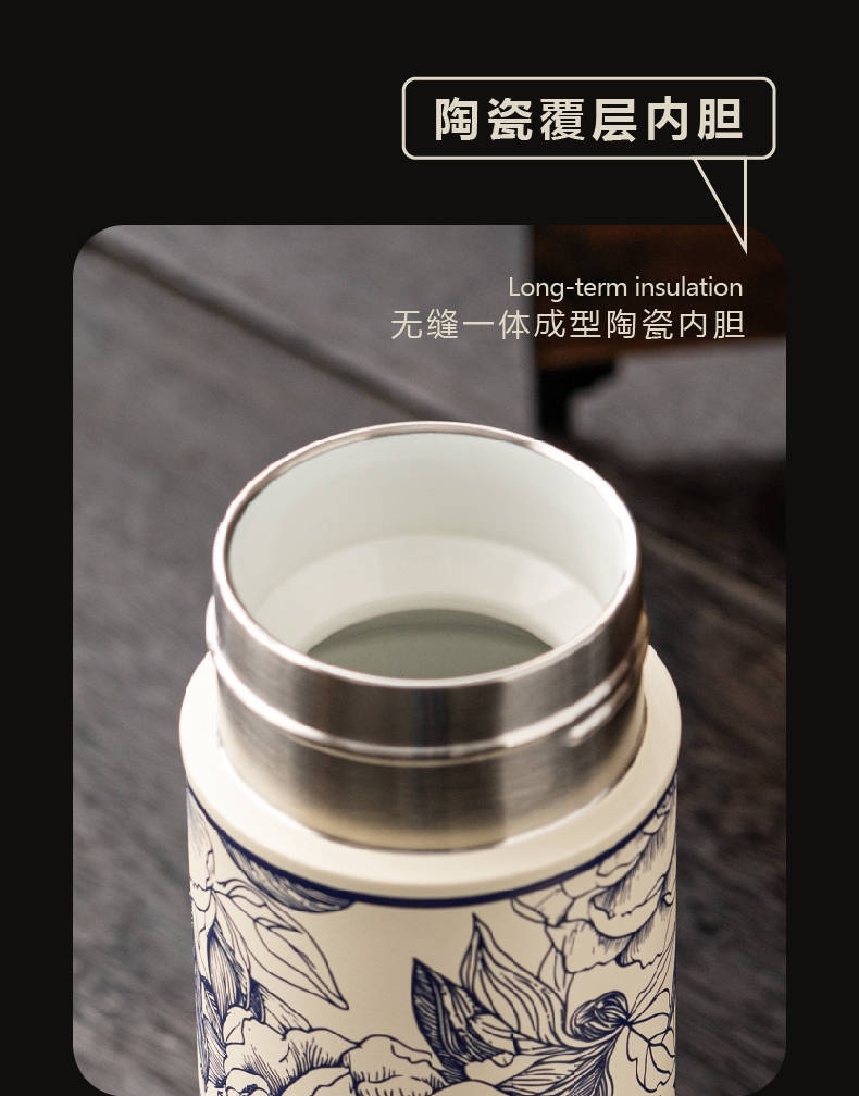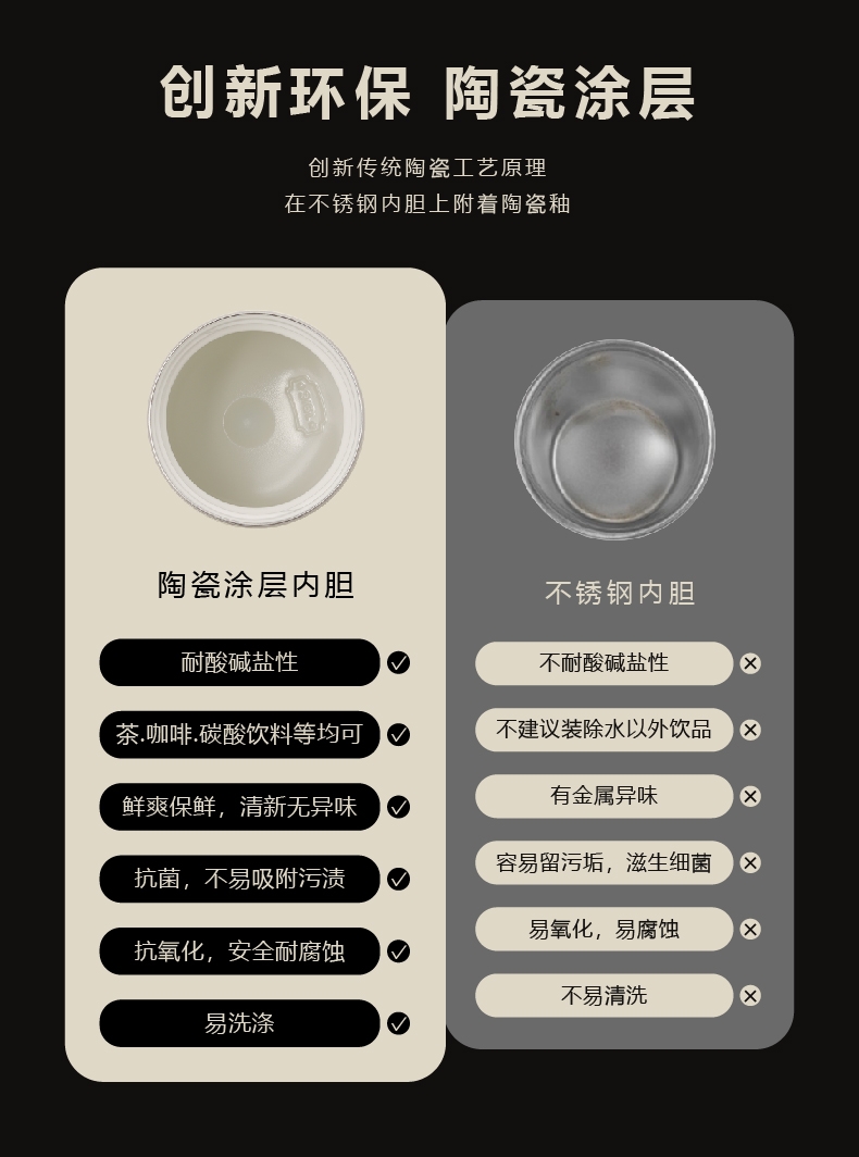 黑科技陶瓷内胆:无金属异味 保温 锁鲜 耐酸碱;瓷内胆,不易留茶垢,方便清洗更省心;使用新型3D喷墨印刷技术,展现凹凸立体质感