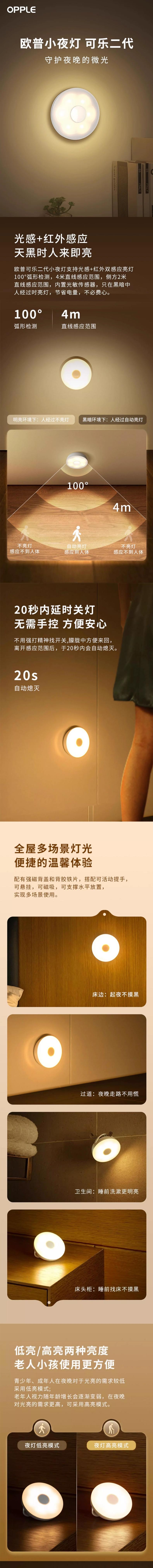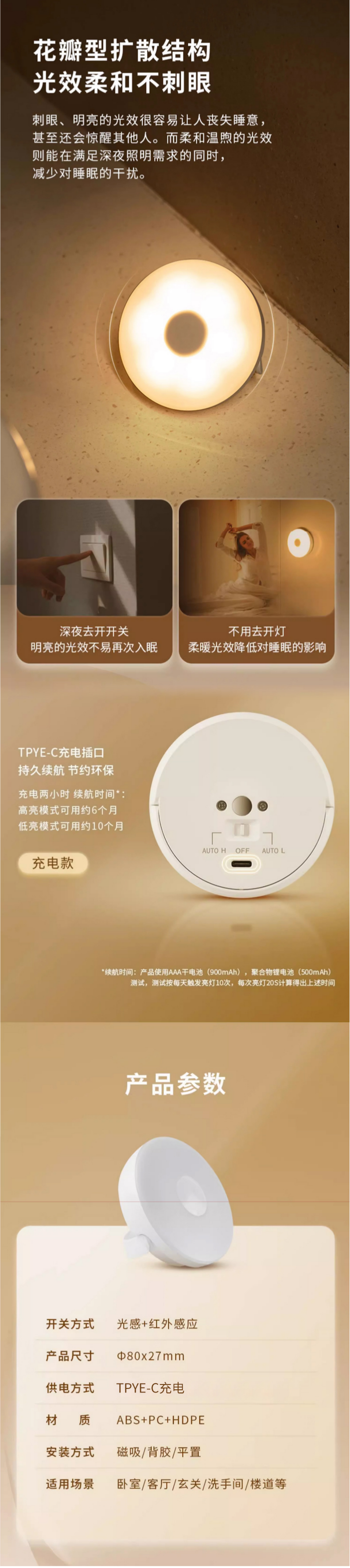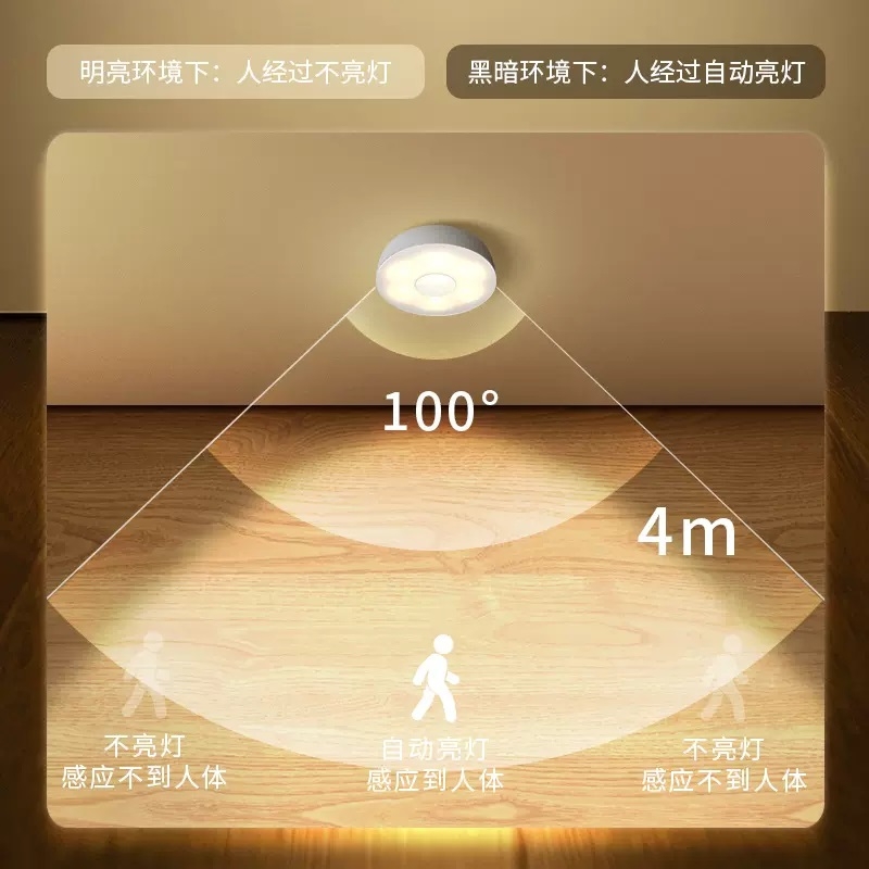 灵敏感应,光感+红外双感应;;起夜不摸黑,20秒内延时关灯;;低亮/高亮两种亮度,老人小孩使用更方便;;花瓣型扩散结构,光效柔和不刺眼;;长续航,持久耐用,节约环保。