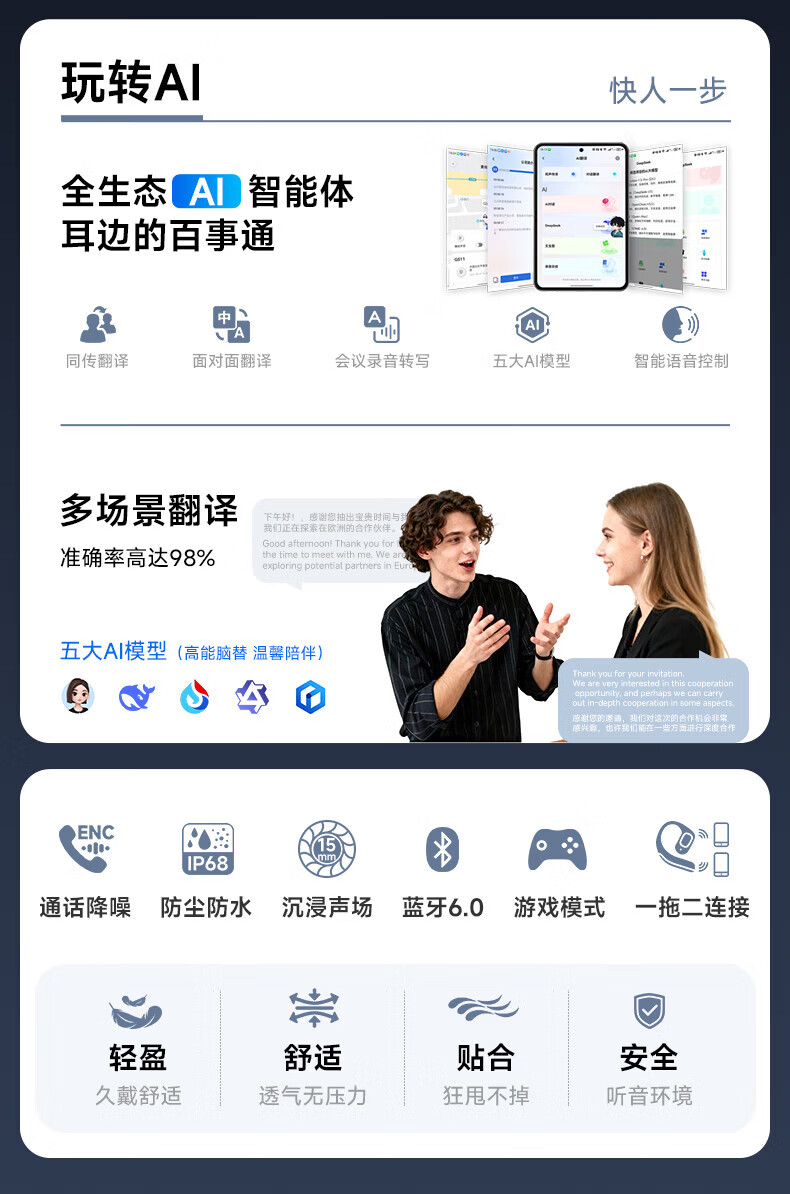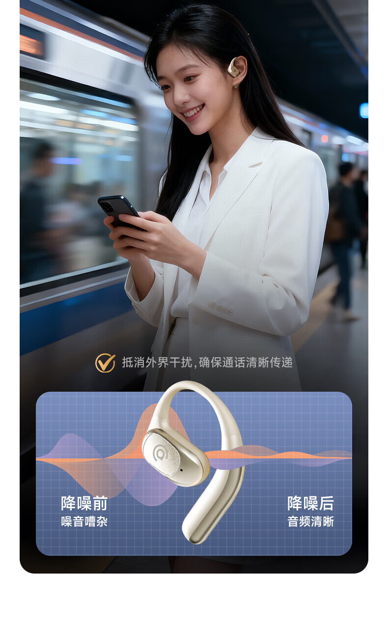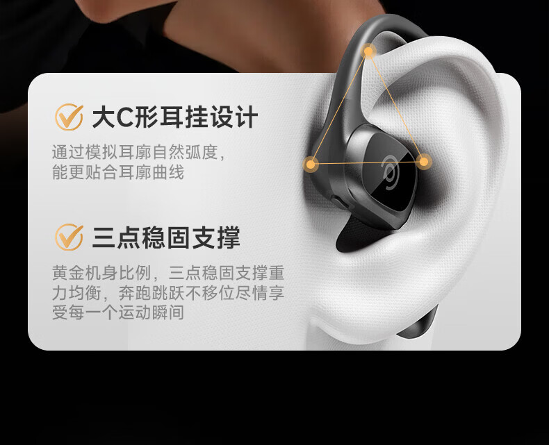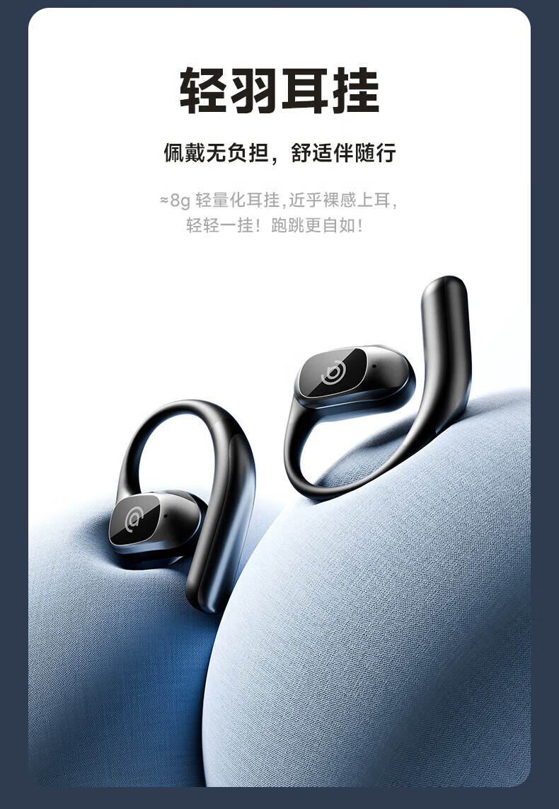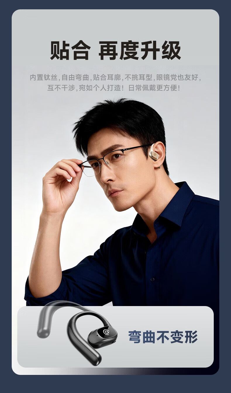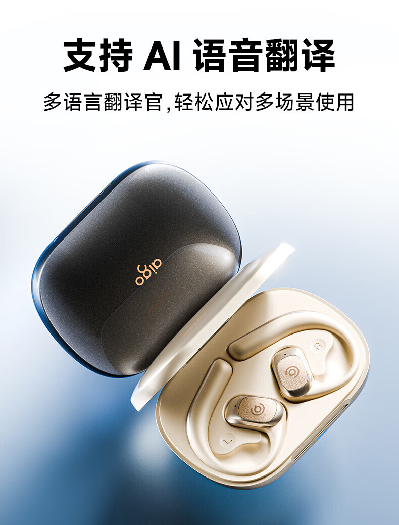 支持AI语音翻译,多语言翻译官,轻松应对多场景使用;轻羽耳挂 。佩戴无负担,舒适伴随行;内置钛丝,自由弯曲,贴合耳廓