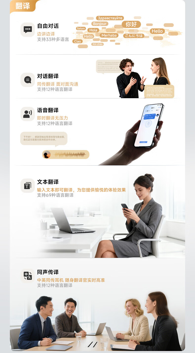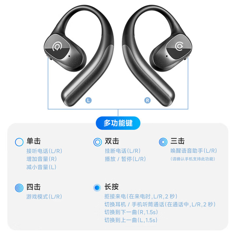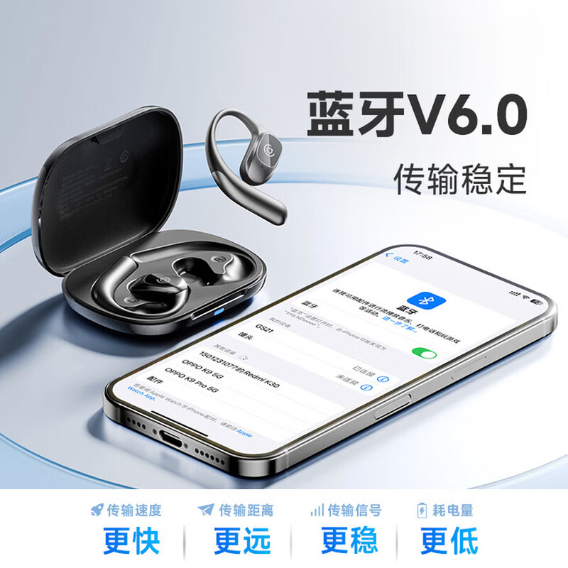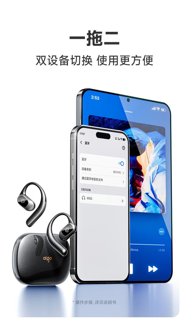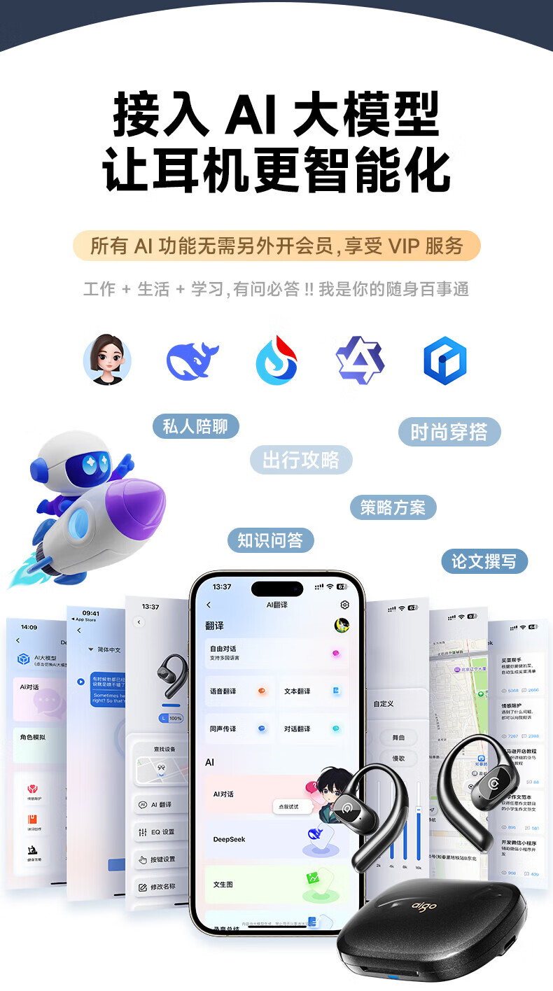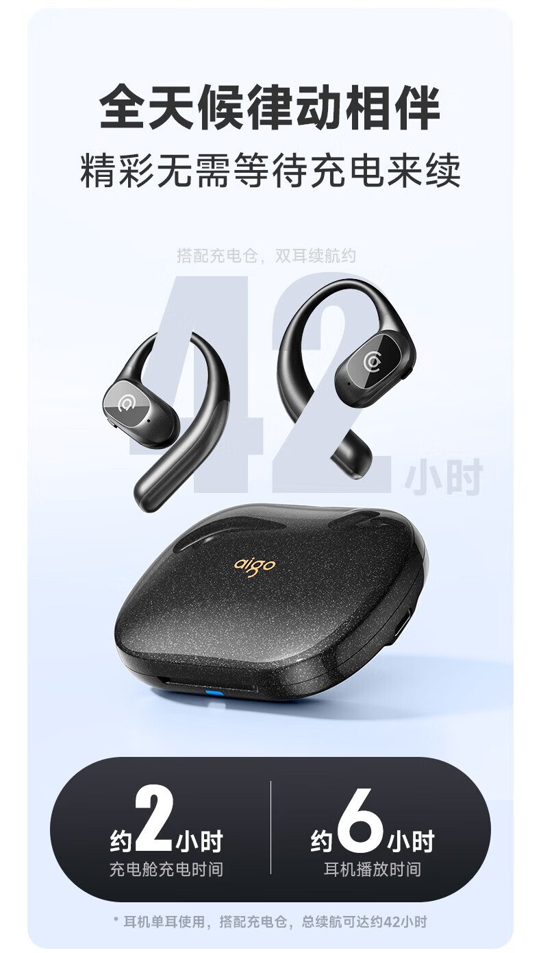 支持AI语音翻译,多语言翻译官,轻松应对多场景使用;轻羽耳挂 。佩戴无负担,舒适伴随行;内置钛丝,自由弯曲,贴合耳廓