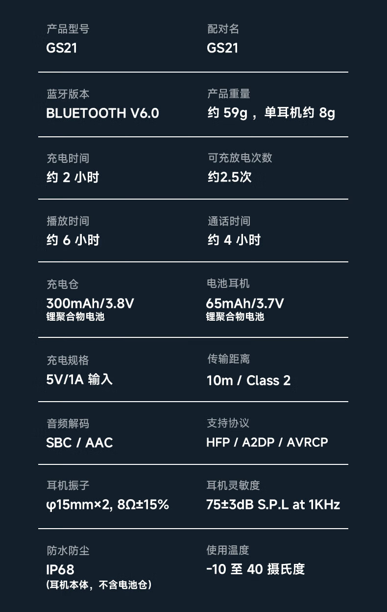 电池耳机:65mAh/3.7V
