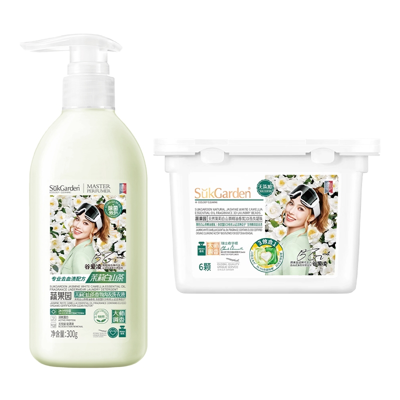 配置清单: SukGarden蔬果园茉莉白山茶香氛洗衣液500g SukGarden蔬果园茉莉白山茶香氛洗衣液500g SukGarden蔬果园茉莉白山茶香氛内衣洗衣液300g SukGarden蔬果园茉莉白山茶香氛3D洗衣凝珠10g*6颗 SukGarden蔬果园精美礼盒-谷爱凌版ML01