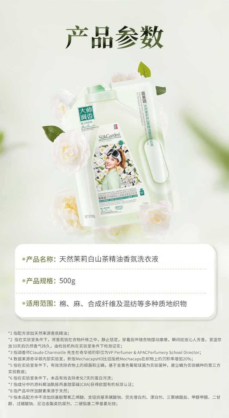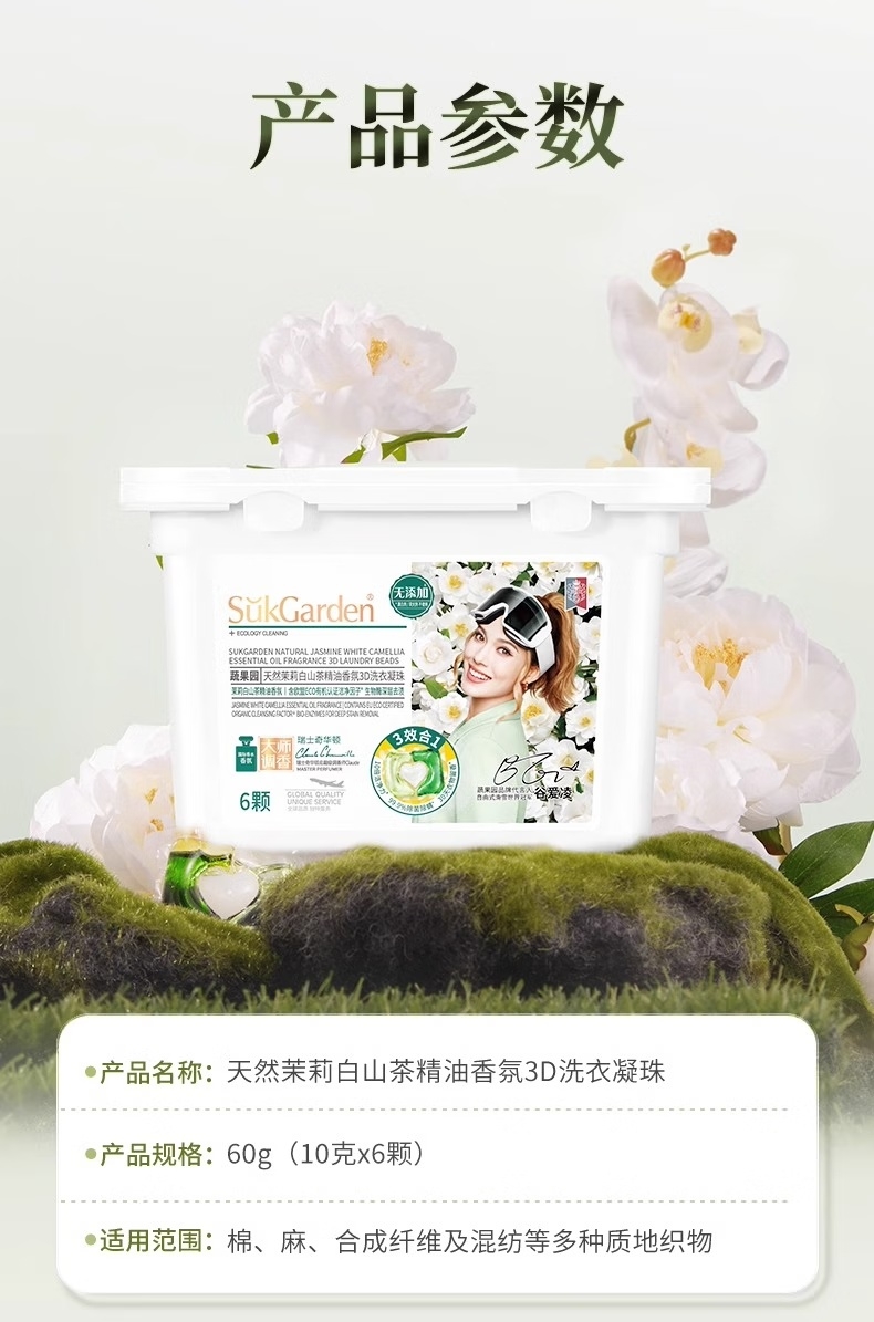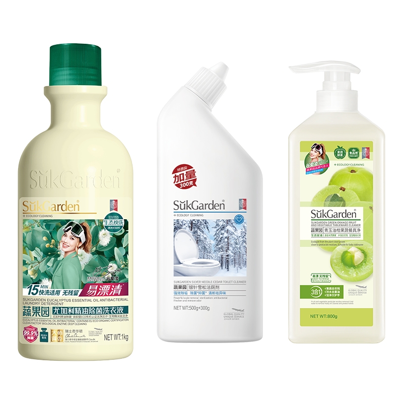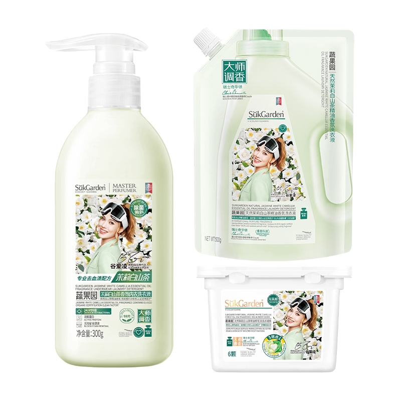 配置清单: SukGarden蔬果园尤加利精油除菌洗衣液1kg SukGarden蔬果园茉莉白山茶香氛洗衣液500g SukGarden蔬果园银针雪松木洁厕剂800g SukGarden蔬果园茉莉白山茶香氛内衣洗衣液300g SukGarden蔬果园青玉油柑果蔬餐具净800g SukGarden蔬果园茉莉白山茶香氛3D洗衣凝珠10g*6颗 SukGarden蔬果园精美礼盒-谷爱凌版ML02