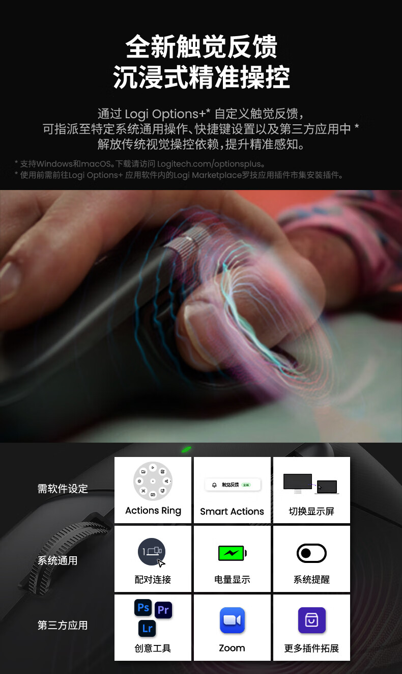 触觉反馈:针对特定操作、快捷键和系统通用; Action Rings 行动环:自定义配置插件;改进外观材质:耐磨防滑 更易清洁