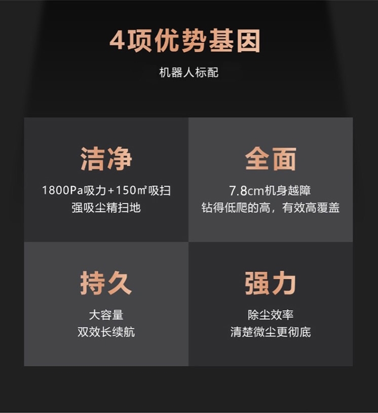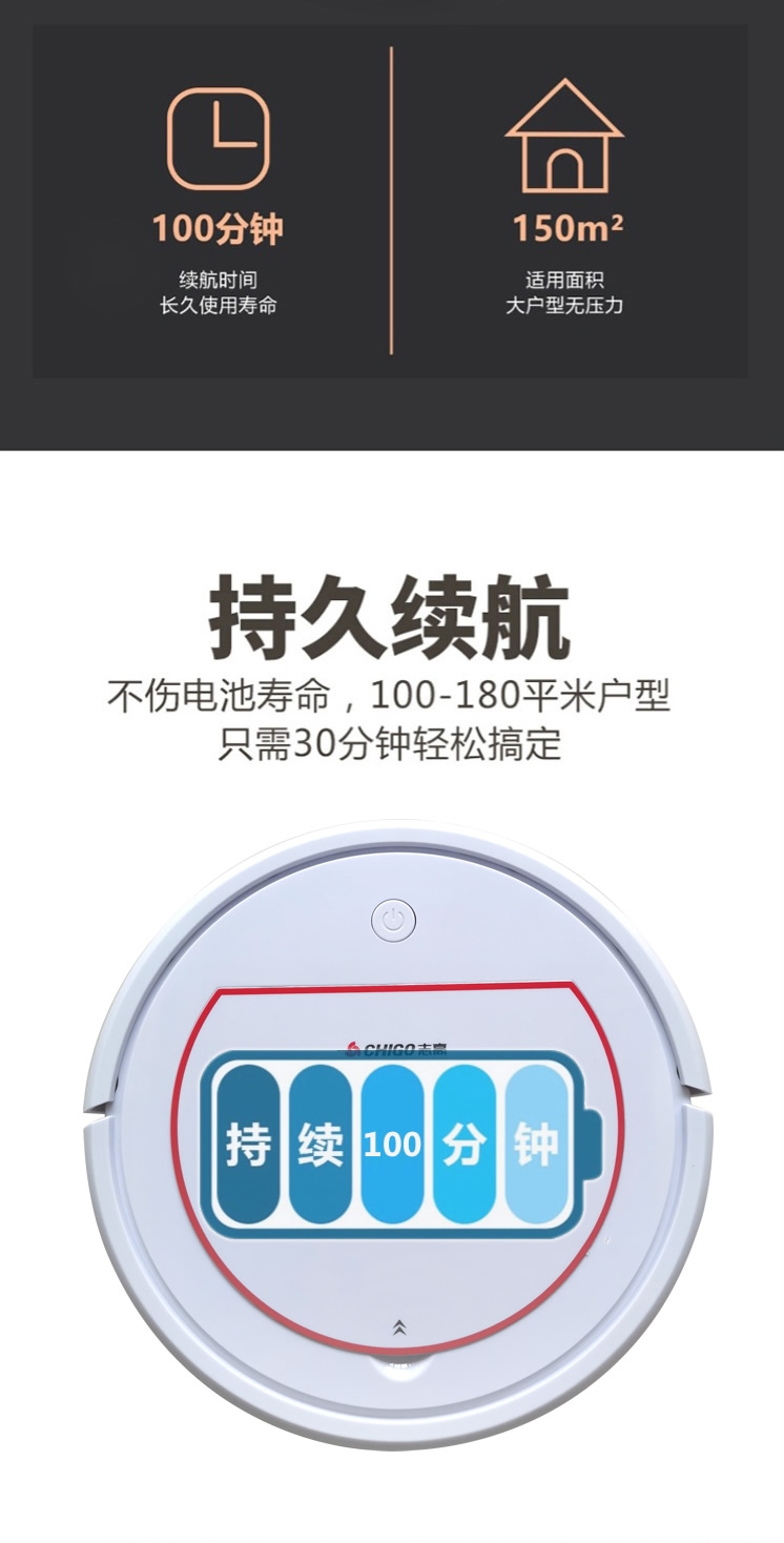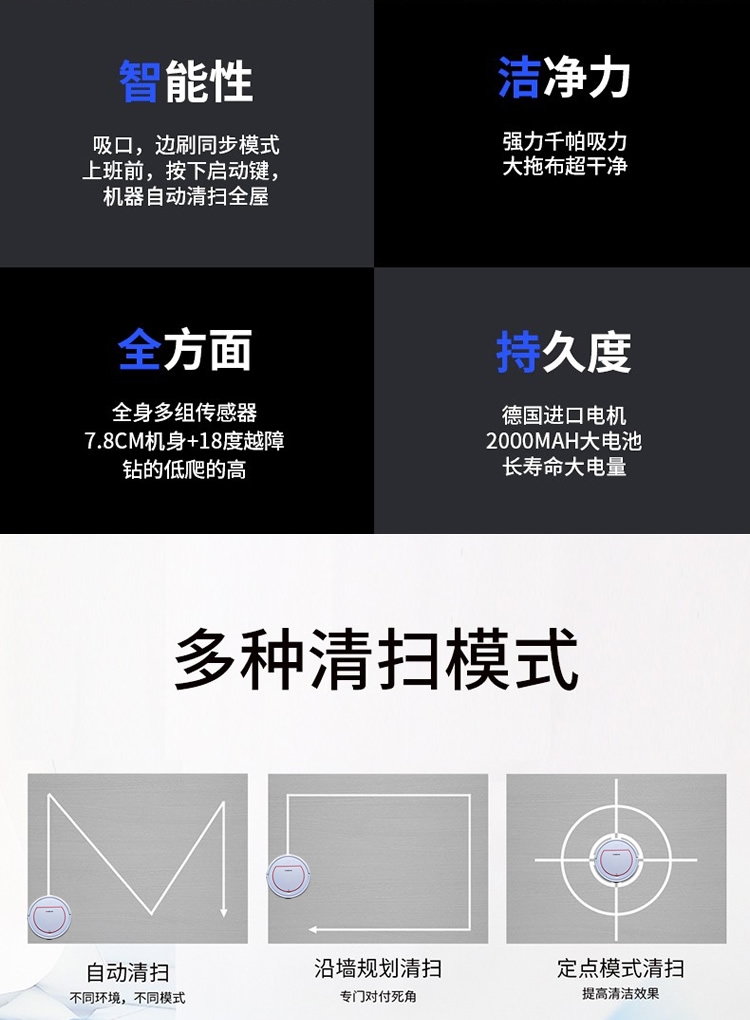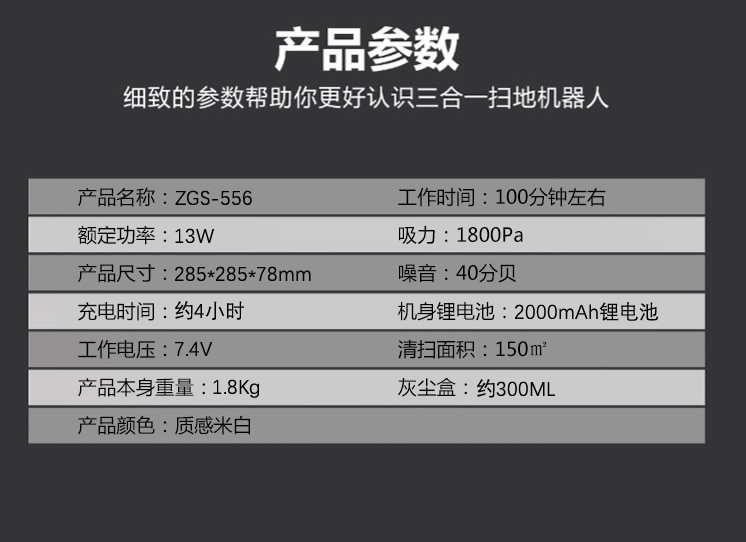 无电刷电动机,小于55DB低噪音;超长续航,采用2000毫安电池。;300ML尘盒,2000Pa强劲大吸力。