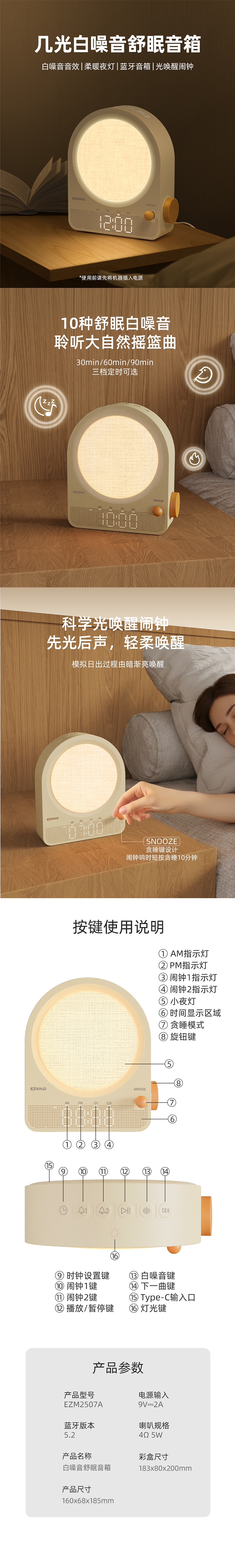 内置10种舒眠白噪音,三档定时可选,温柔陪伴每个夜;柔暖夜灯搭配质感织布设计,点亮床头氛围,多档亮度可;蓝牙稳定快连播放,360度环绕聆听