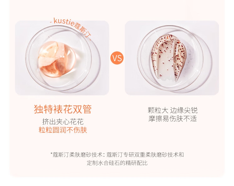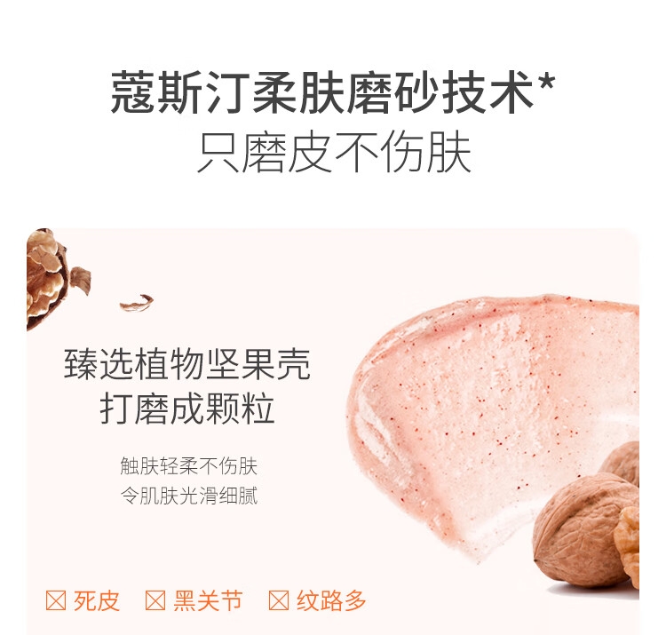 臻选植物坚果壳打磨成颗粒;触肤轻柔不易伤肤,令肌肤光滑细腻;裱花双管,轻松挤出磨砂颗粒,随挤随用,干净卫生