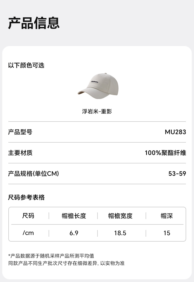佩戴舒适适配更多头型 软顶棒球帽四季可戴; 可调节魔术贴53-59cm头围均适用;走线利落锁边工整