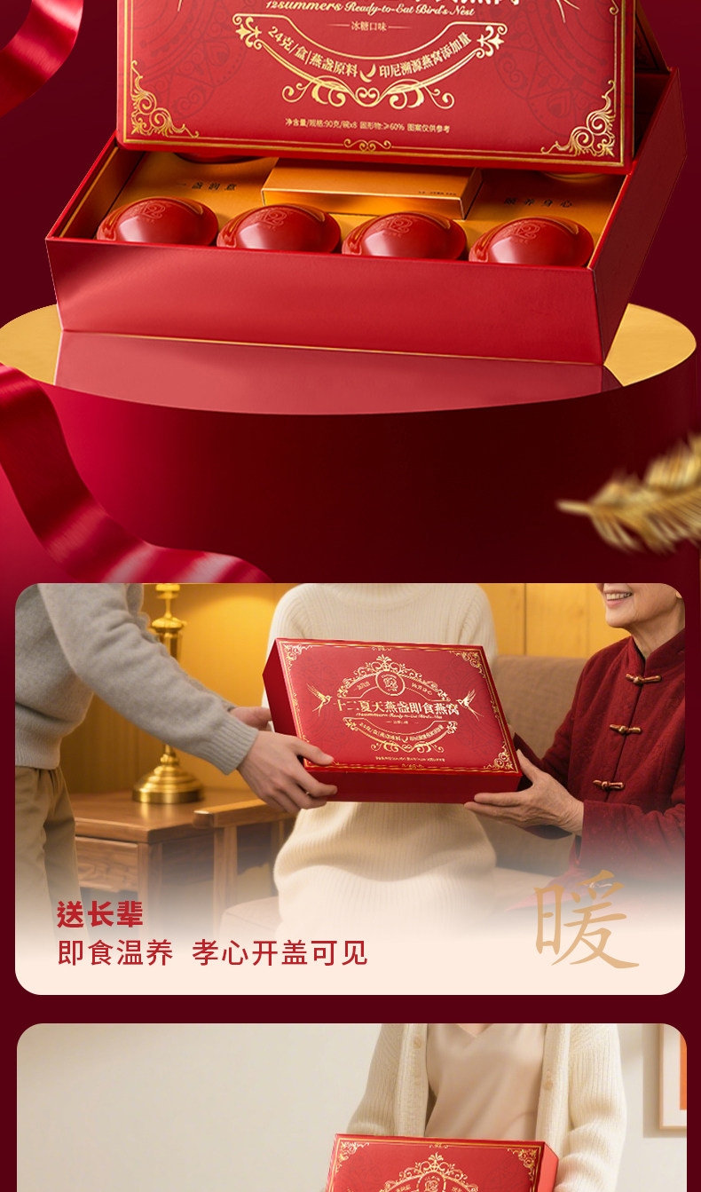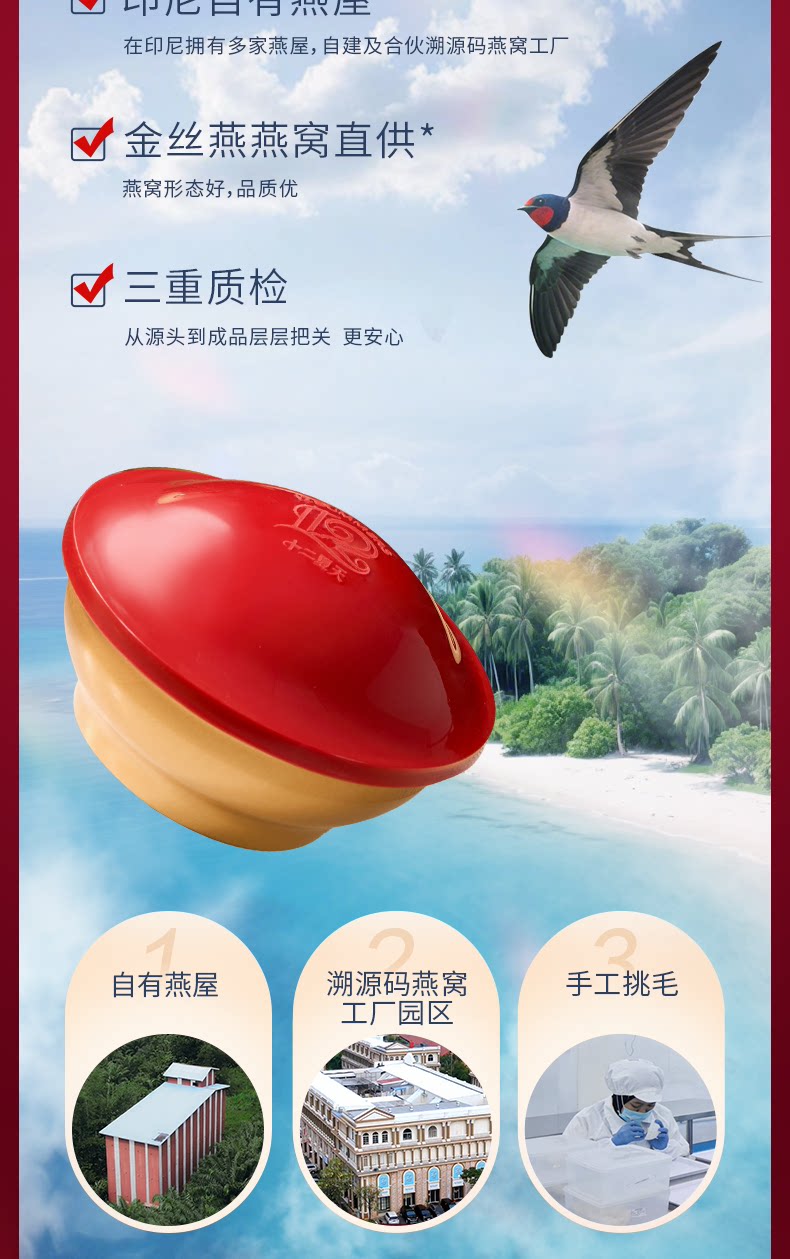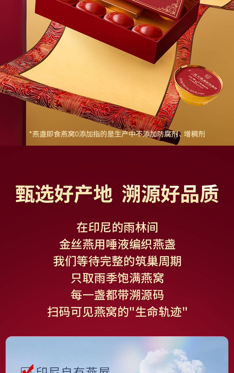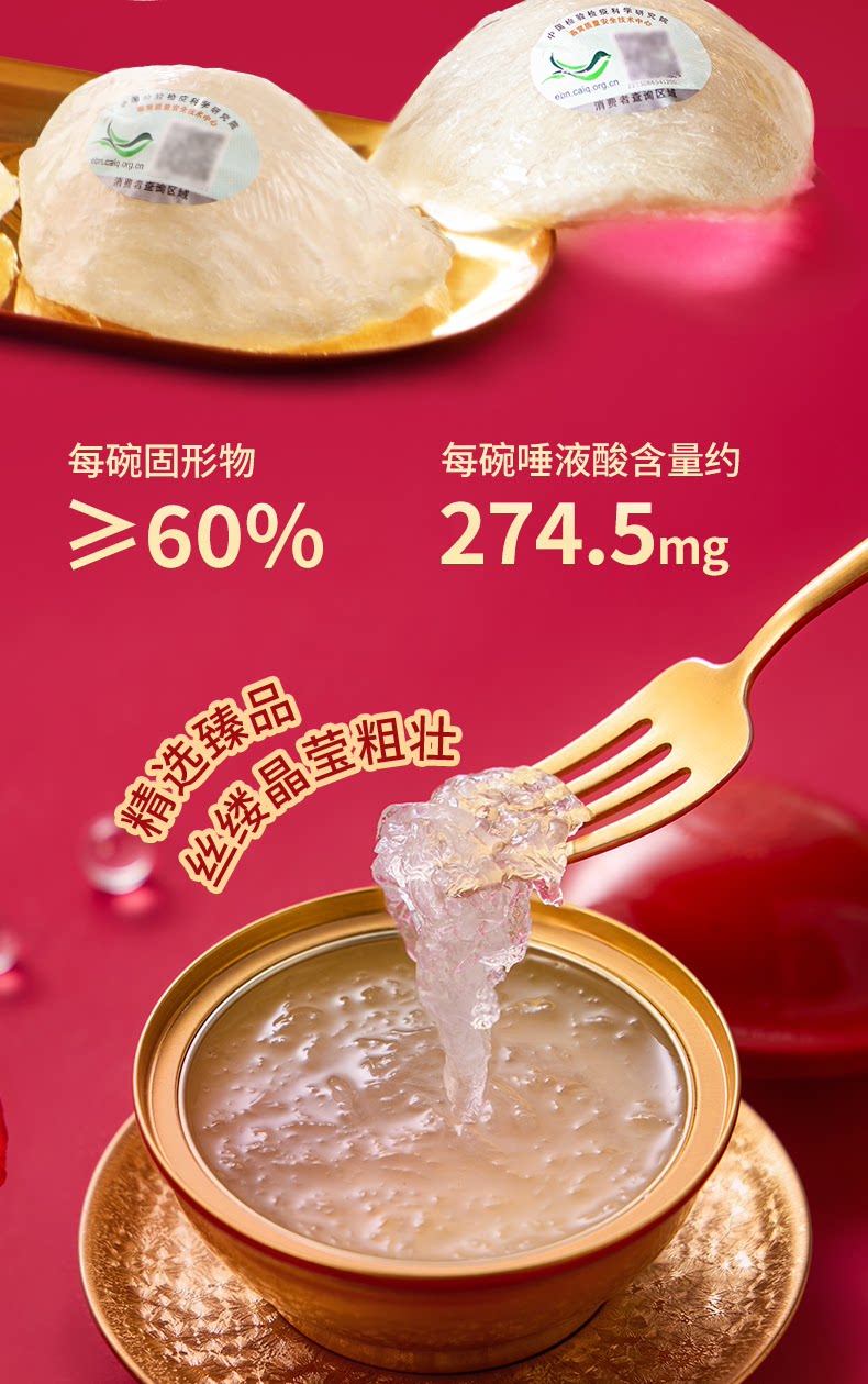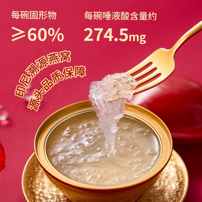 每碗添加3克印尼溯源燕窝;红盖金碗礼盒装,赠礼体面更显心意;仅燕窝、冰糖、水,纯净配方回归本味
