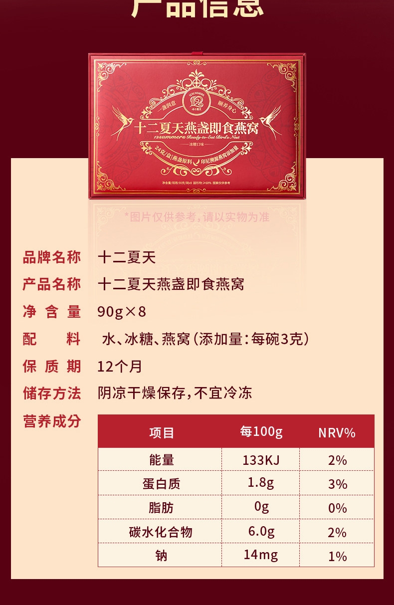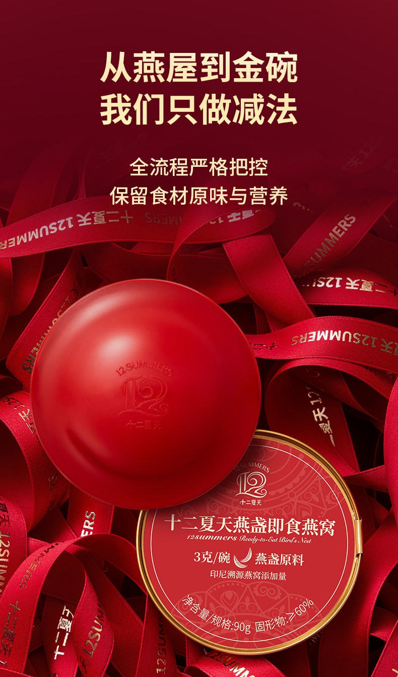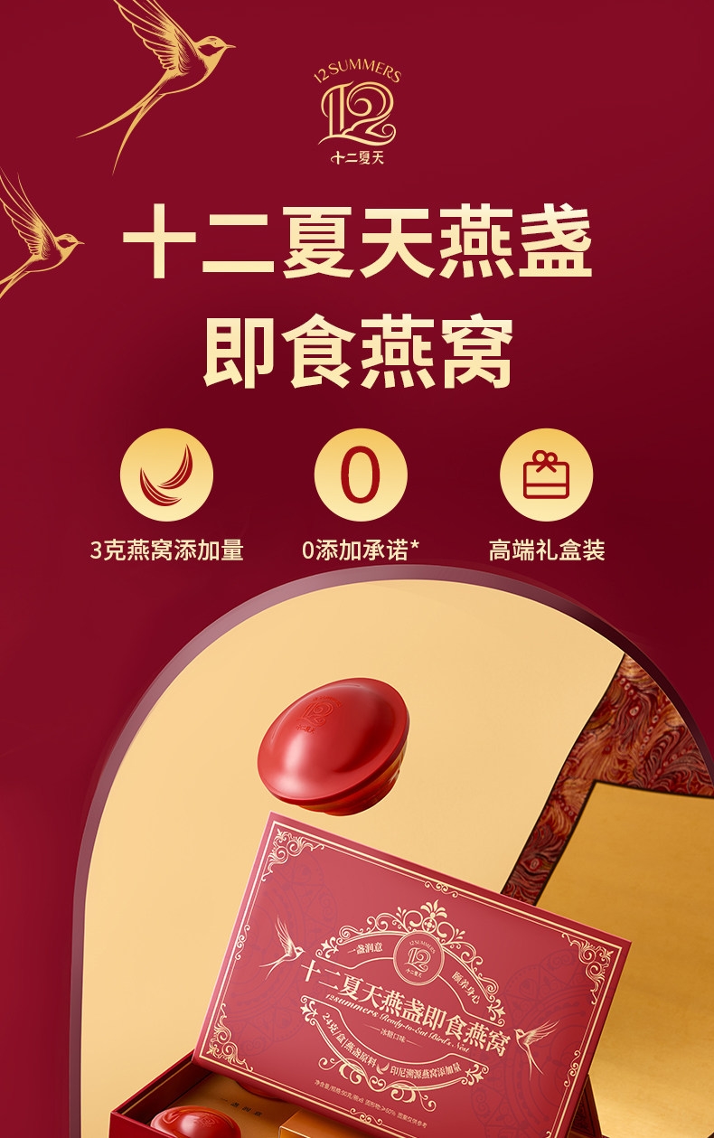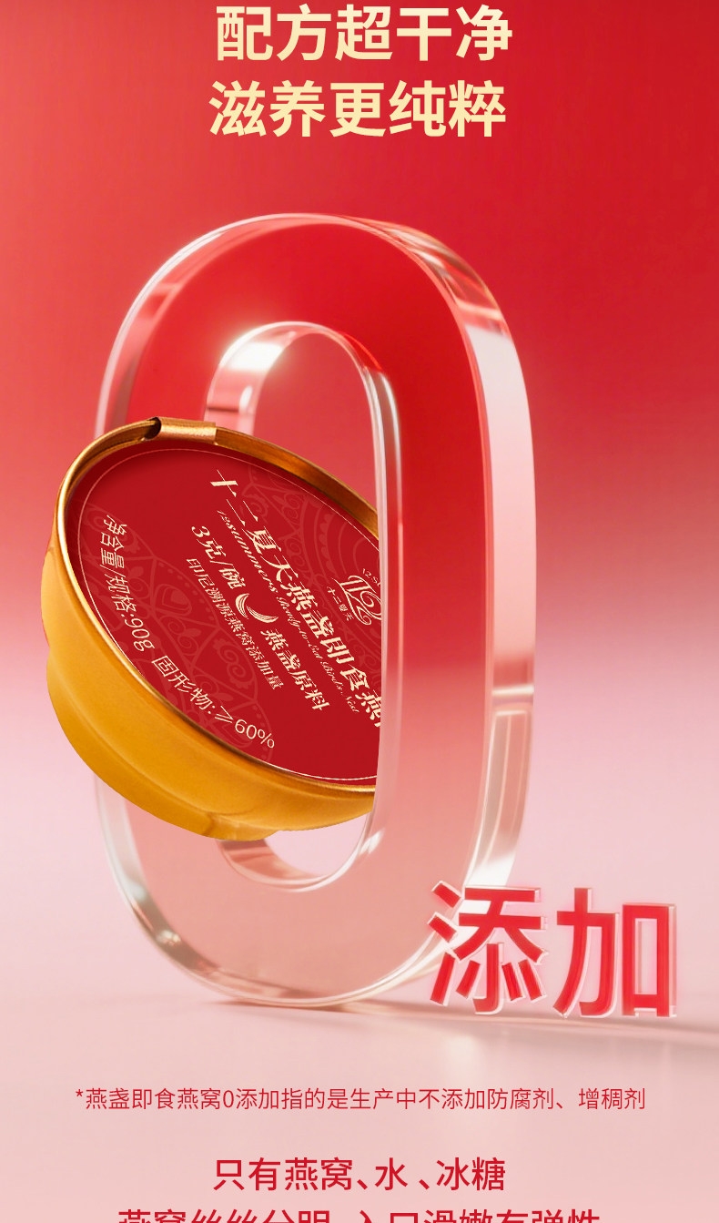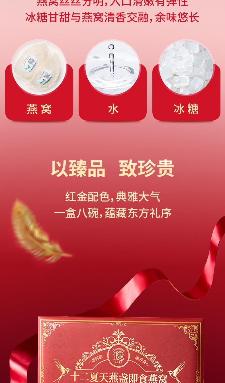每碗添加3克印尼溯源燕窝;红盖金碗礼盒装,赠礼体面更显心意;仅燕窝、冰糖、水,纯净配方回归本味
