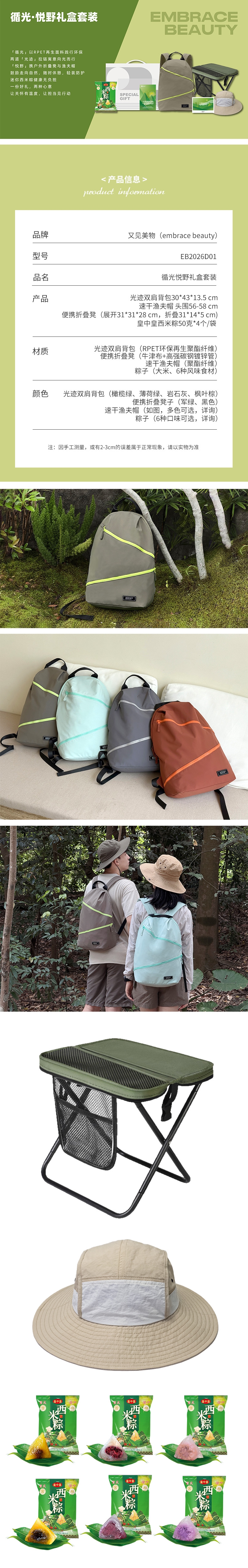 材质:光迹双肩背(RPET环保再生聚酯纤维)、便携折叠凳(牛津布+高强碳钢镀锌管)_x000b_ 速干渔夫帽(聚酯纤维)、 粽子(大米、6种风味食材)