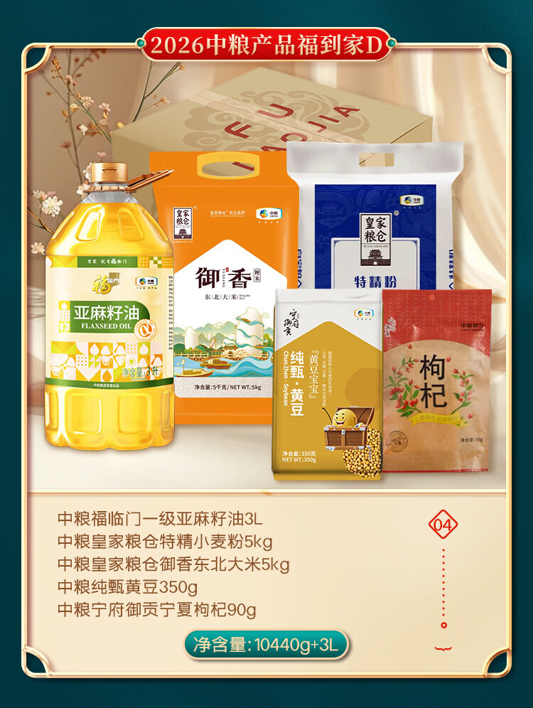 配置:中粮福临门一级亚麻籽油3L 中粮皇家粮仓特精小麦粉5kg 中粮皇家粮仓御香东北大米5kg 中粮纯甄黄豆350g 中粮宁府御贡宁夏枸杞90g