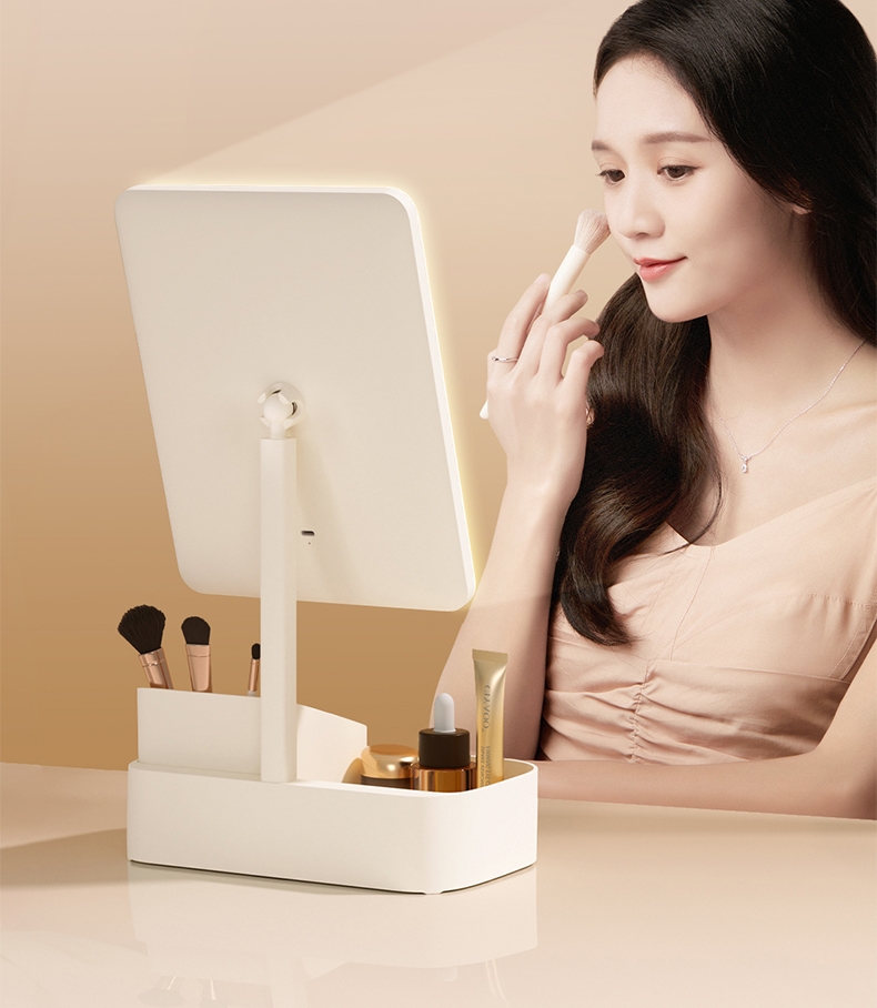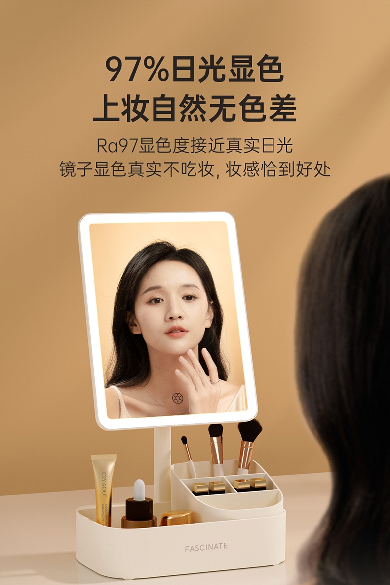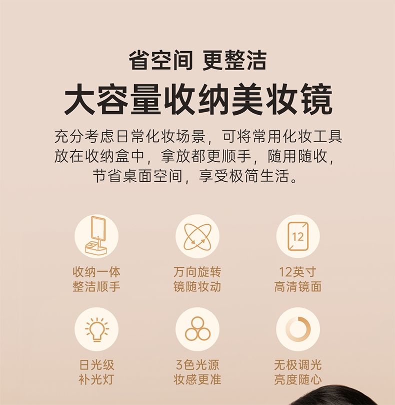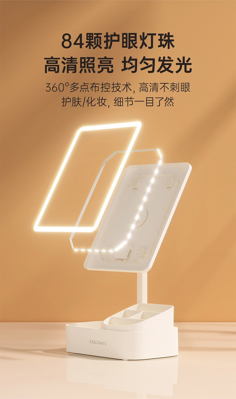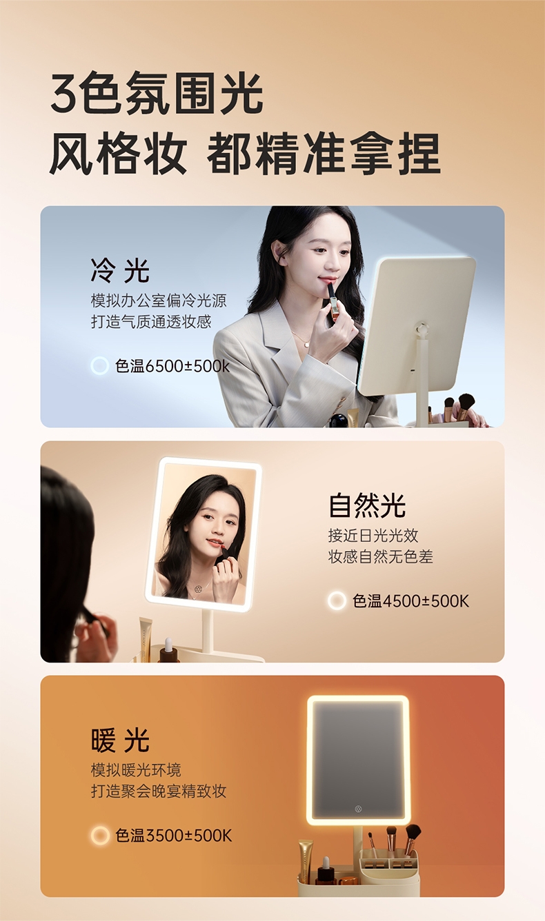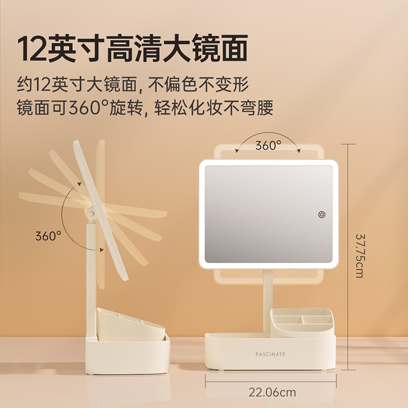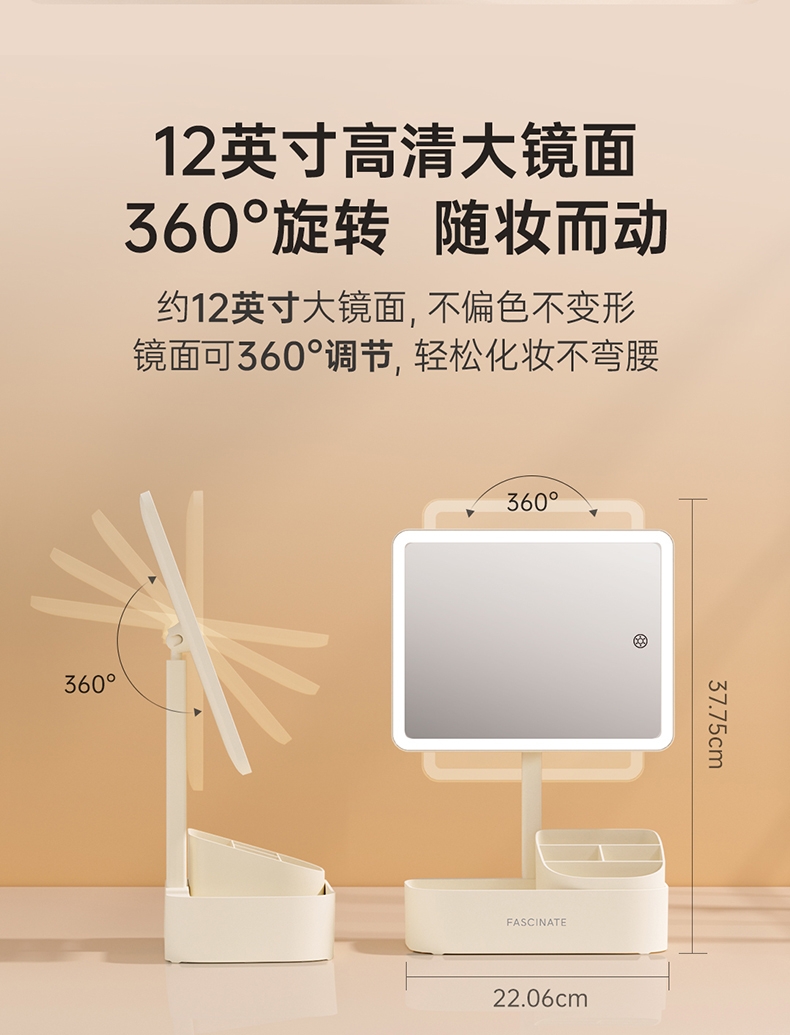 大容量收纳美妆镜 三色光源;12英寸大镜面 97%高度还原日光;360°旋转镜面 创新可收纳卡槽