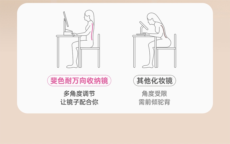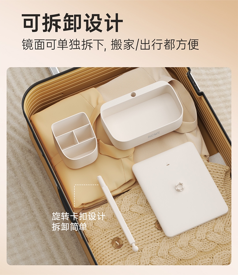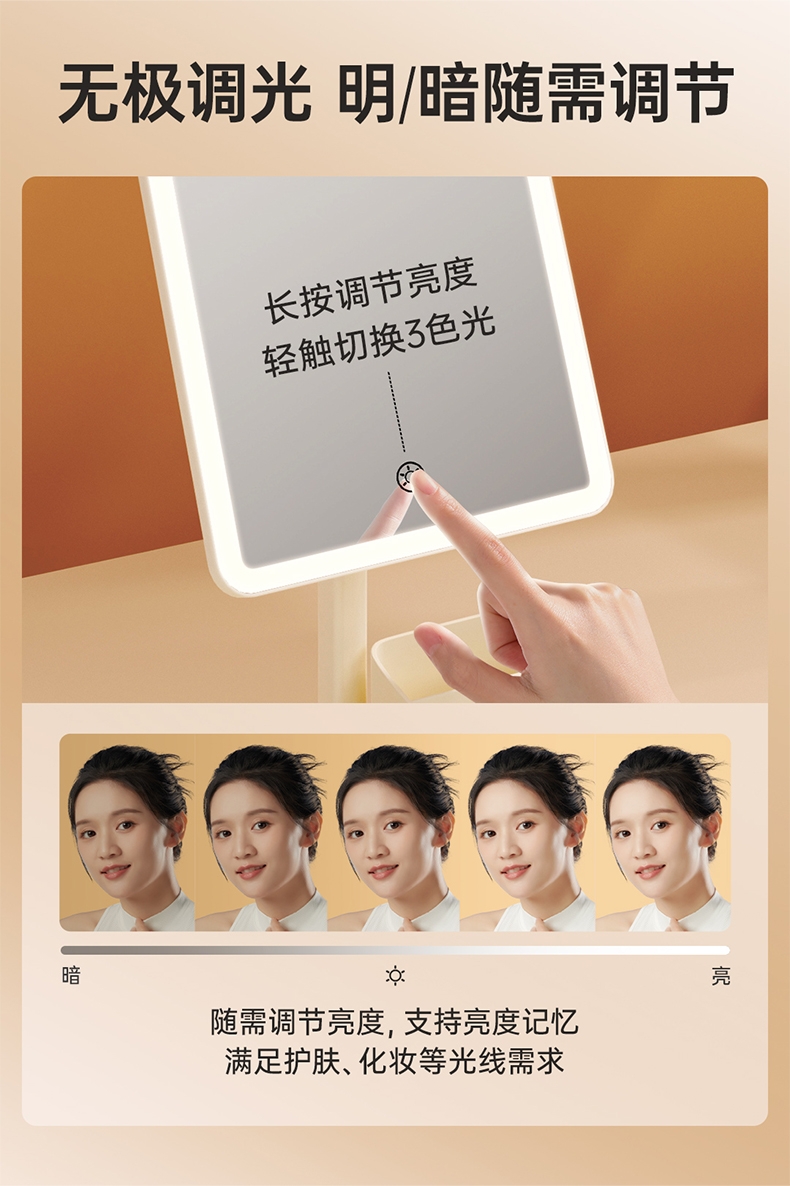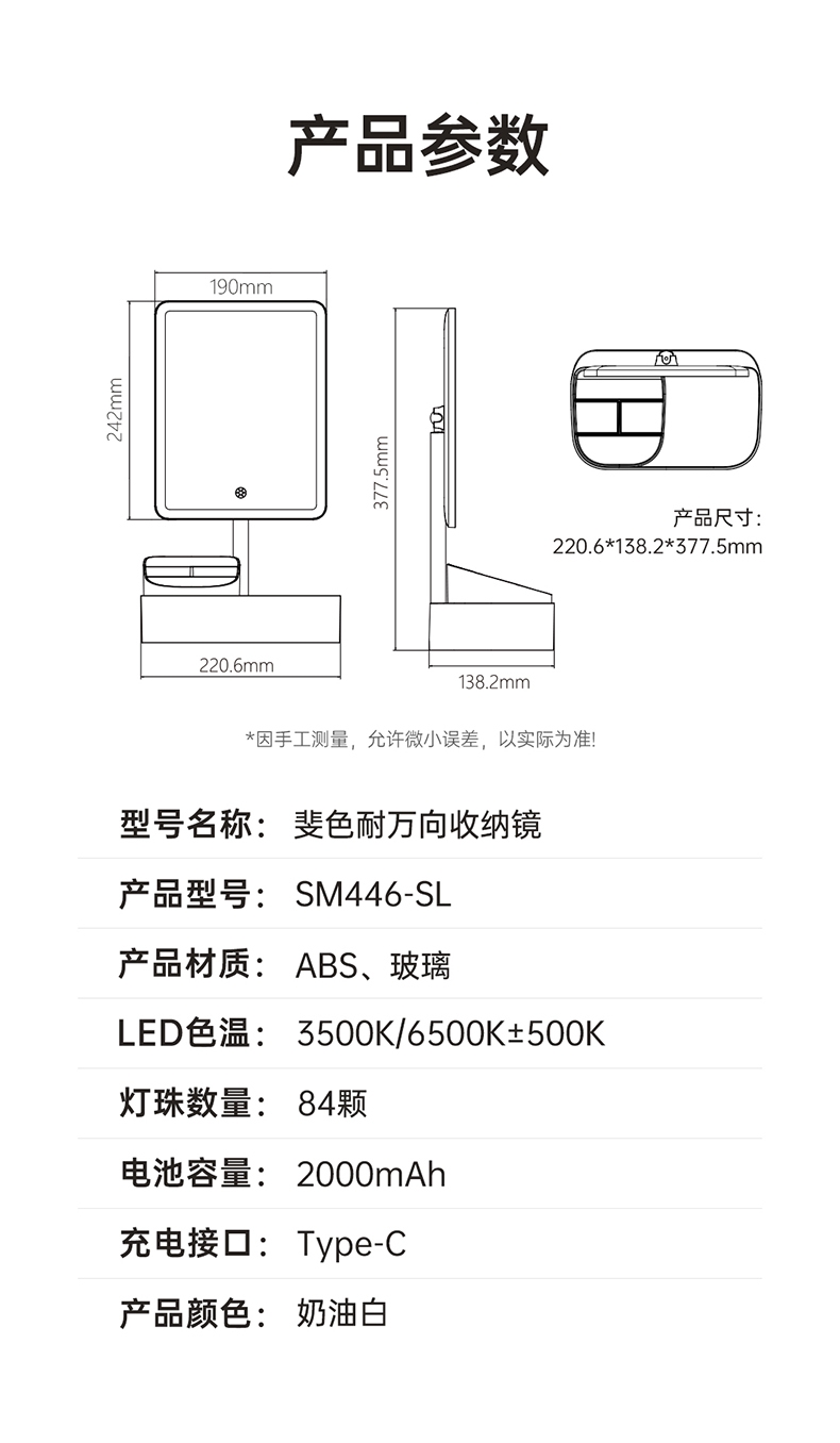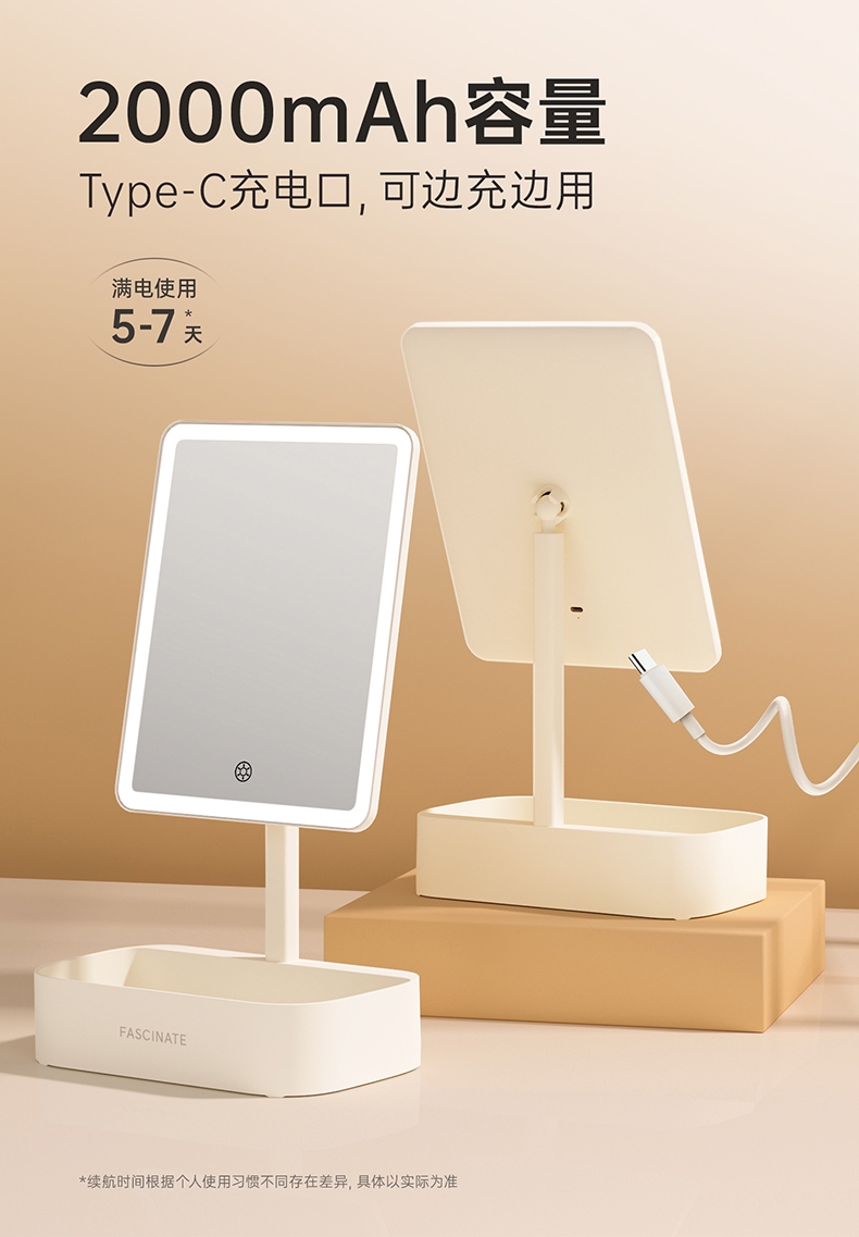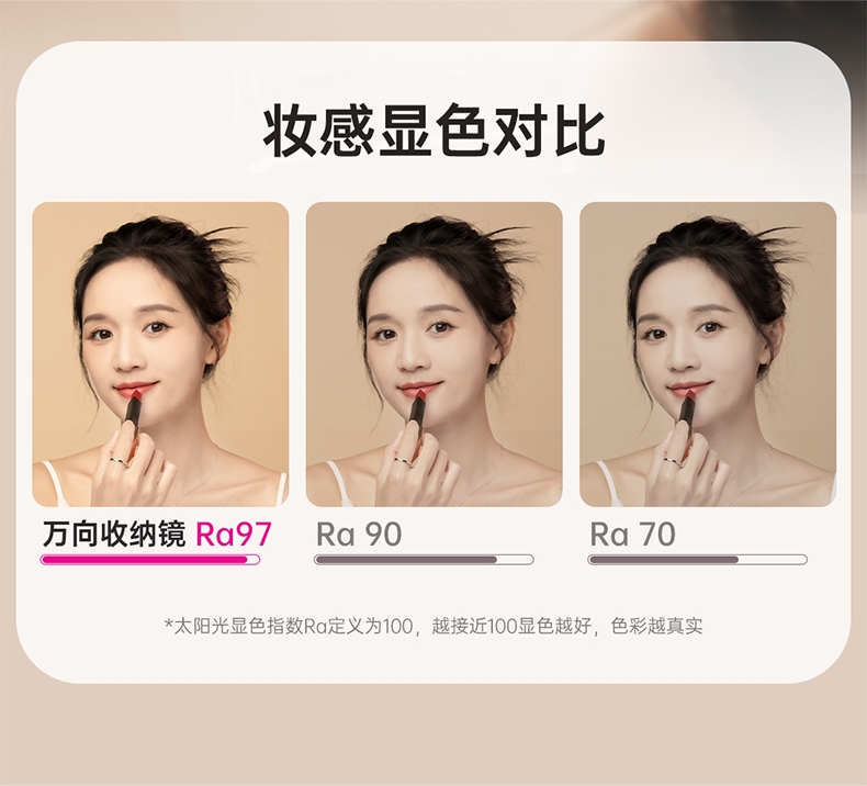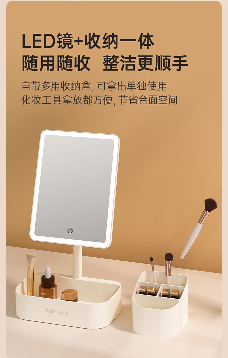 大容量收纳美妆镜 三色光源;12英寸大镜面 97%高度还原日光;360°旋转镜面 创新可收纳卡槽