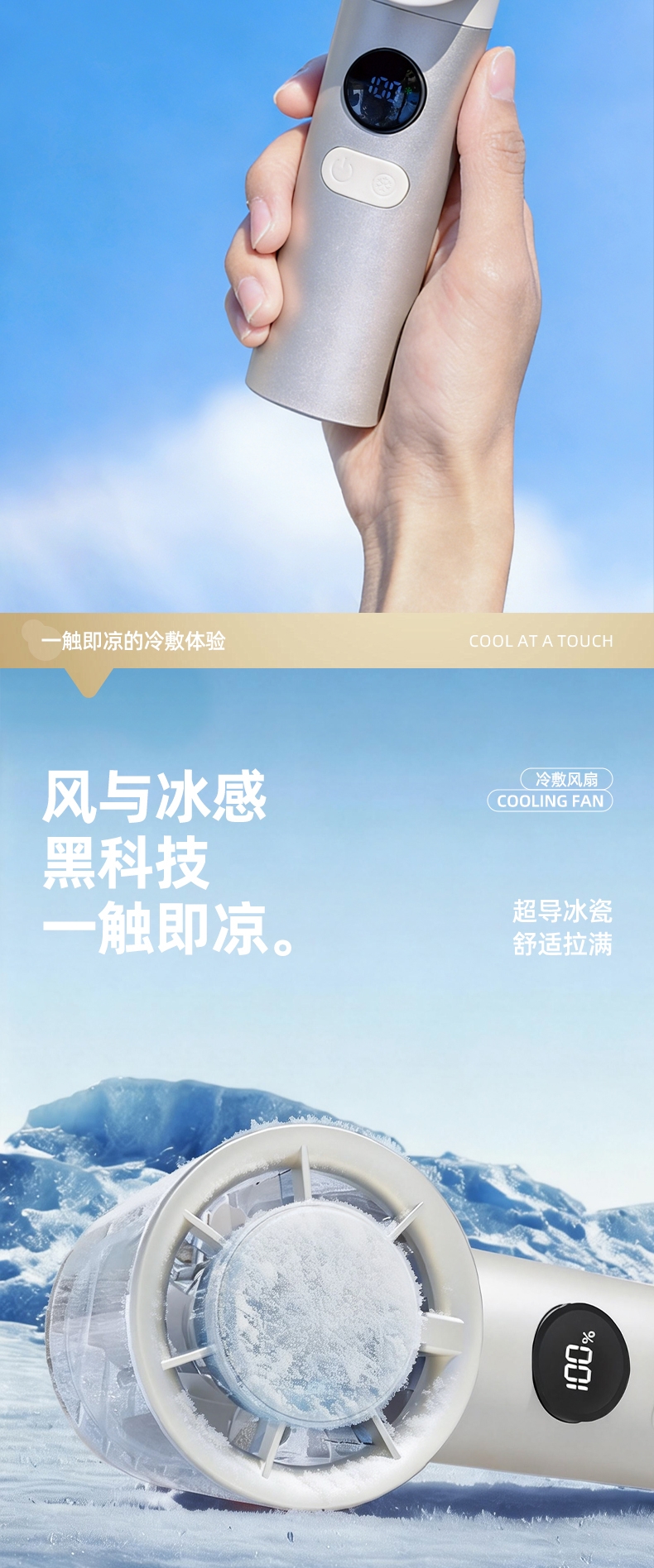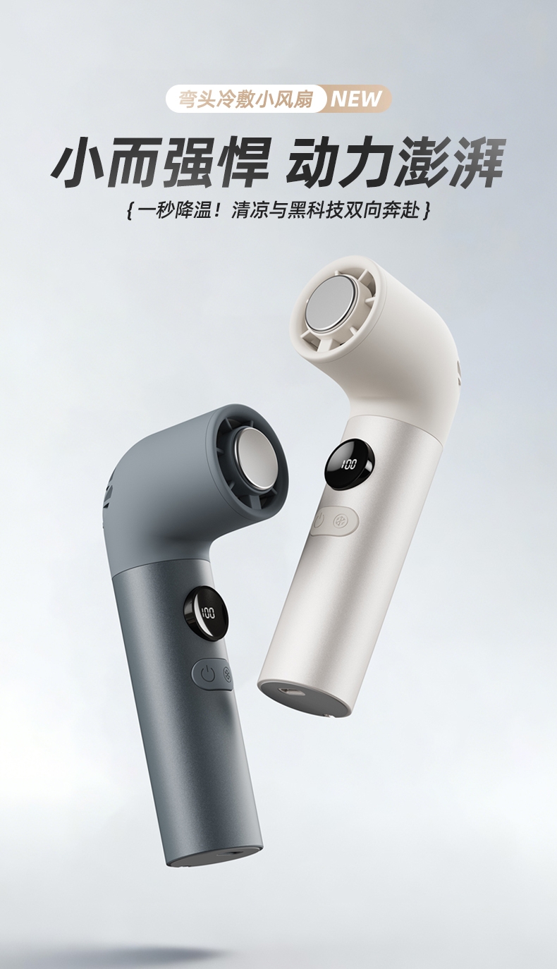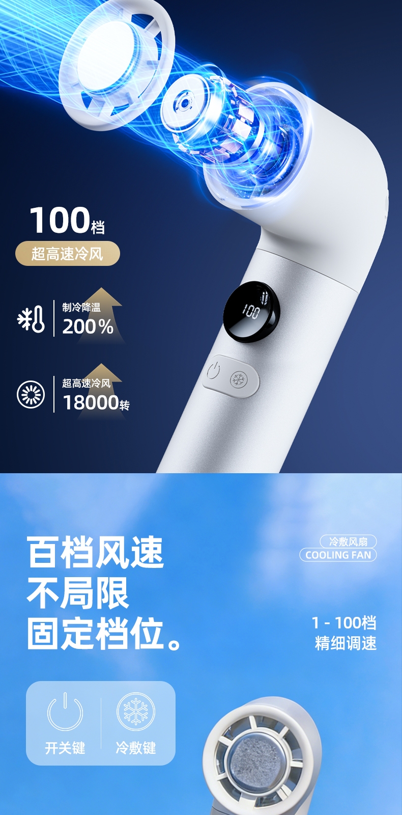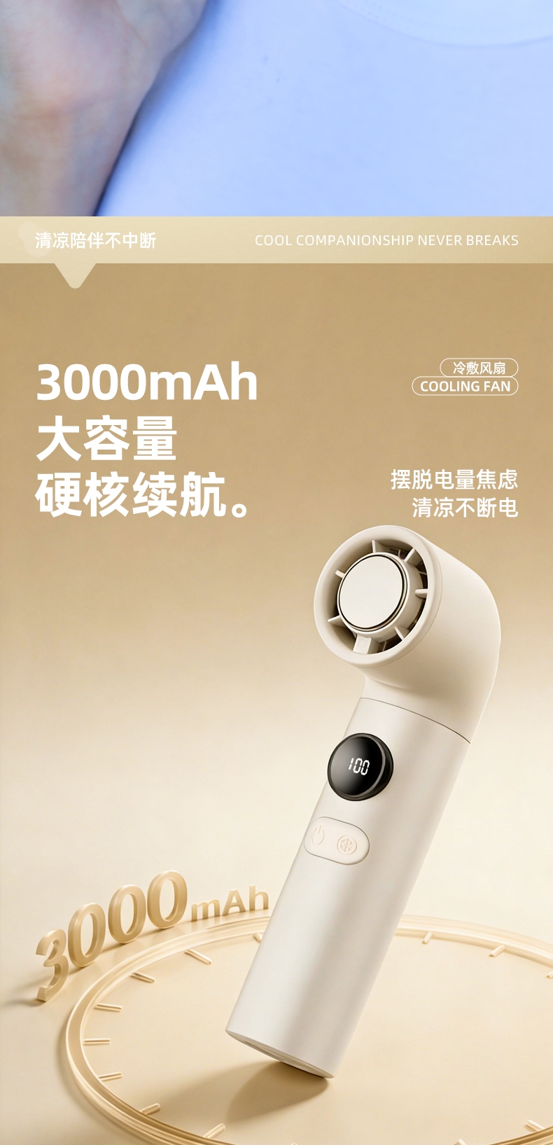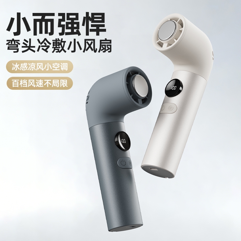 弯头设计不抬手,冷敷风秒降温;小而强悍,冰感凉风,多角度送风;数显电量,便携随身,夏日降温神器