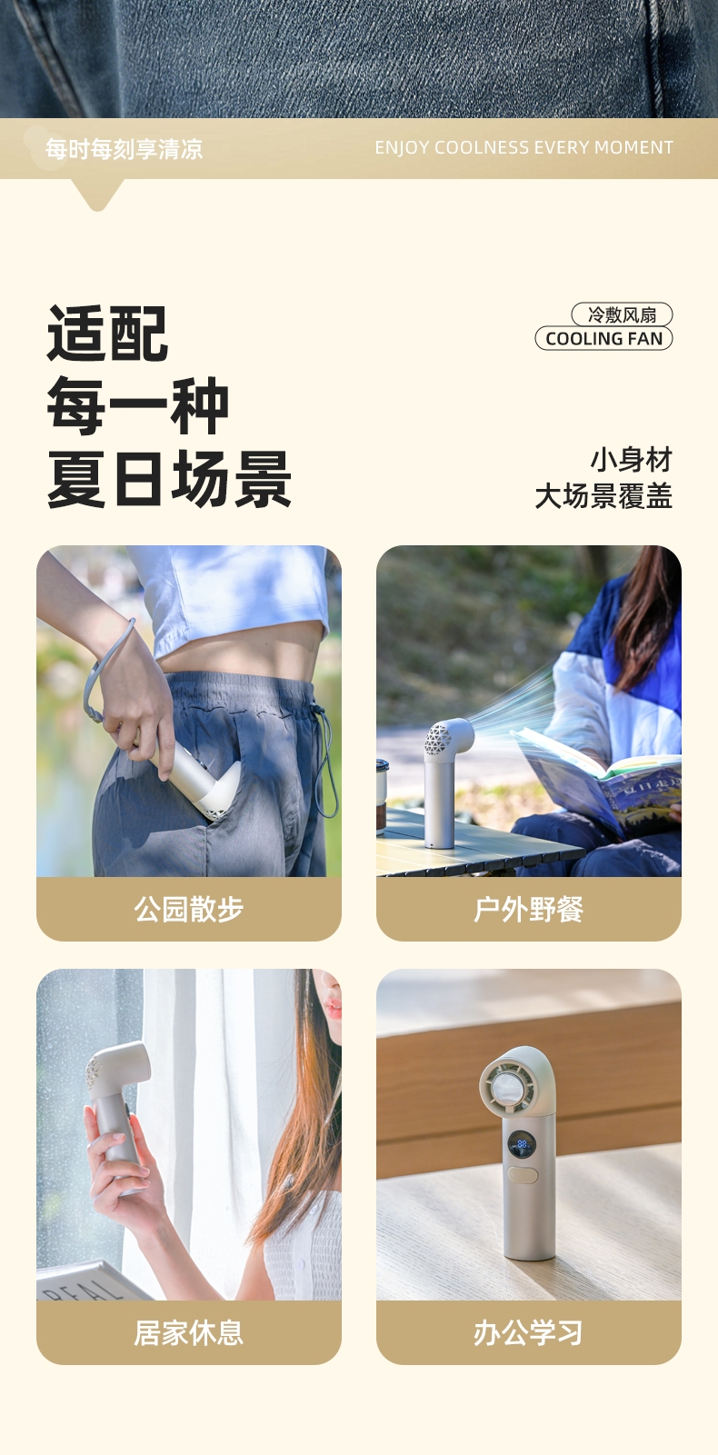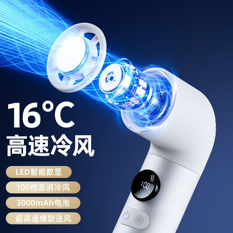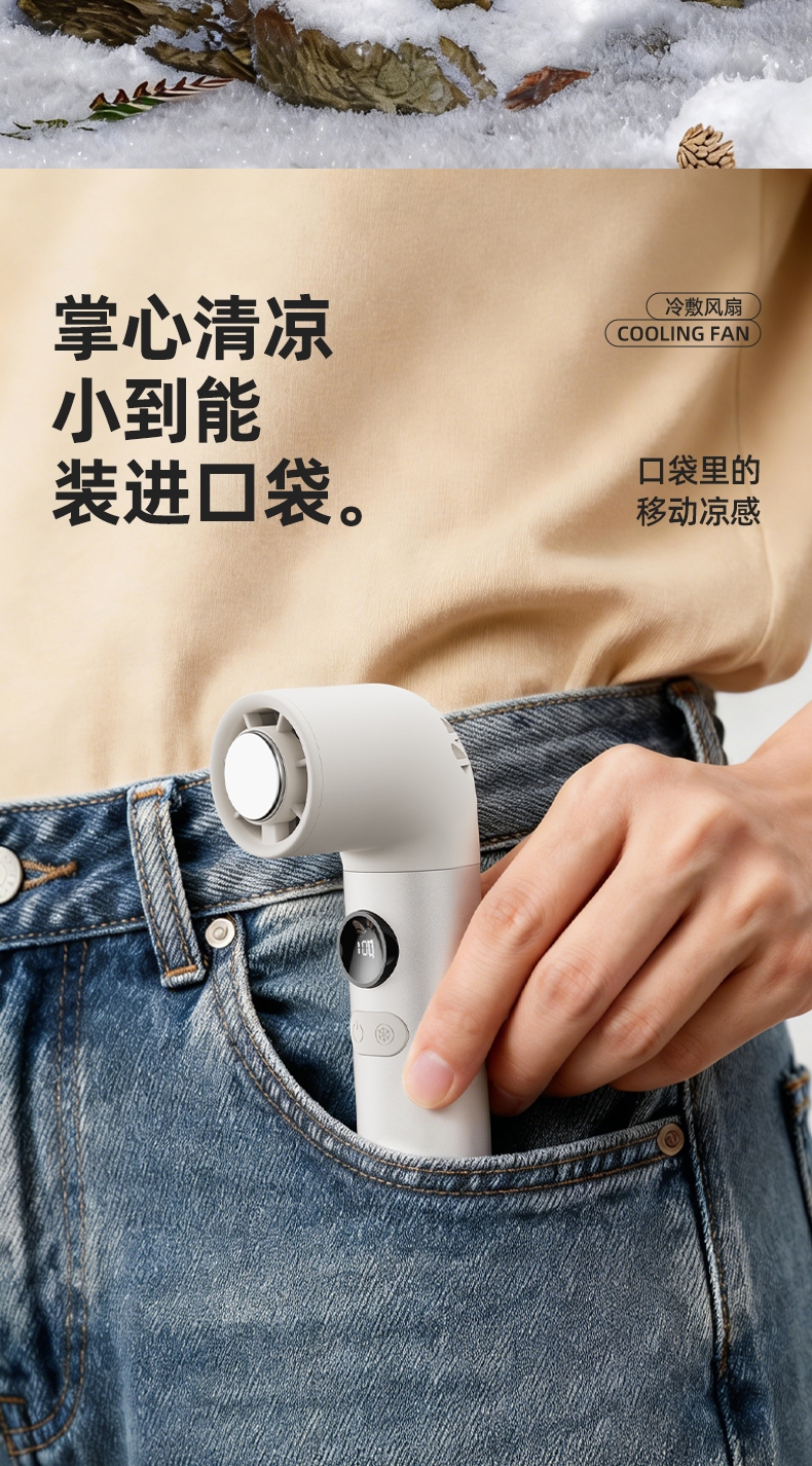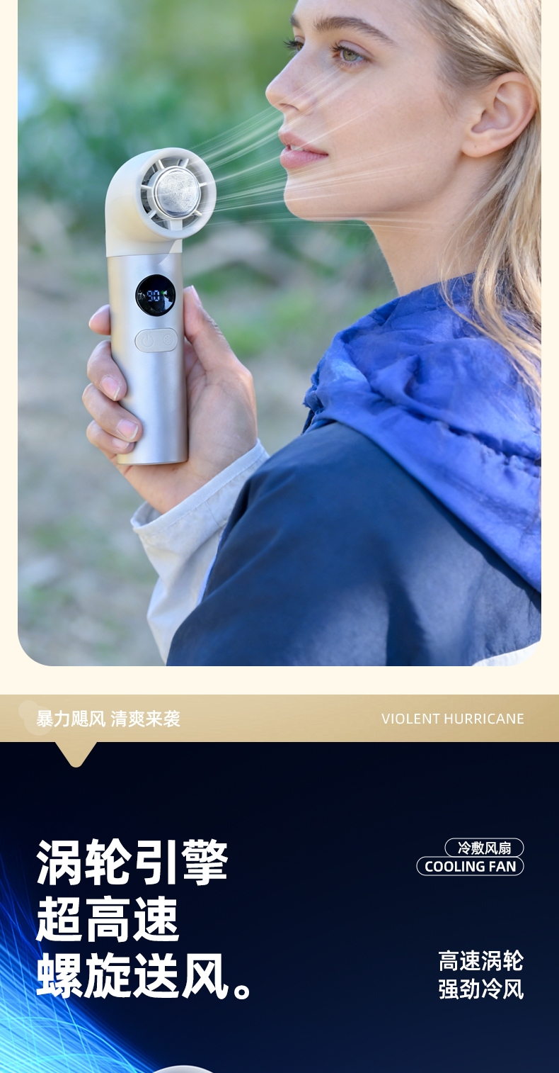 弯头设计不抬手,冷敷风秒降温;小而强悍,冰感凉风,多角度送风;数显电量,便携随身,夏日降温神器