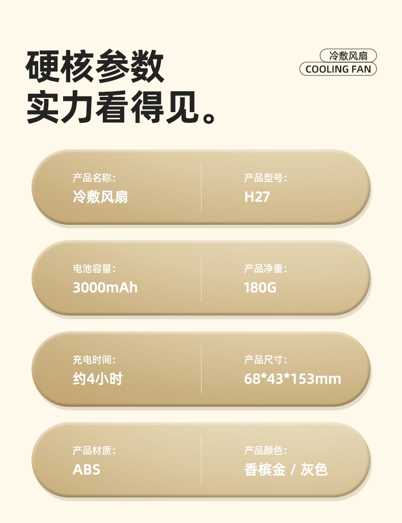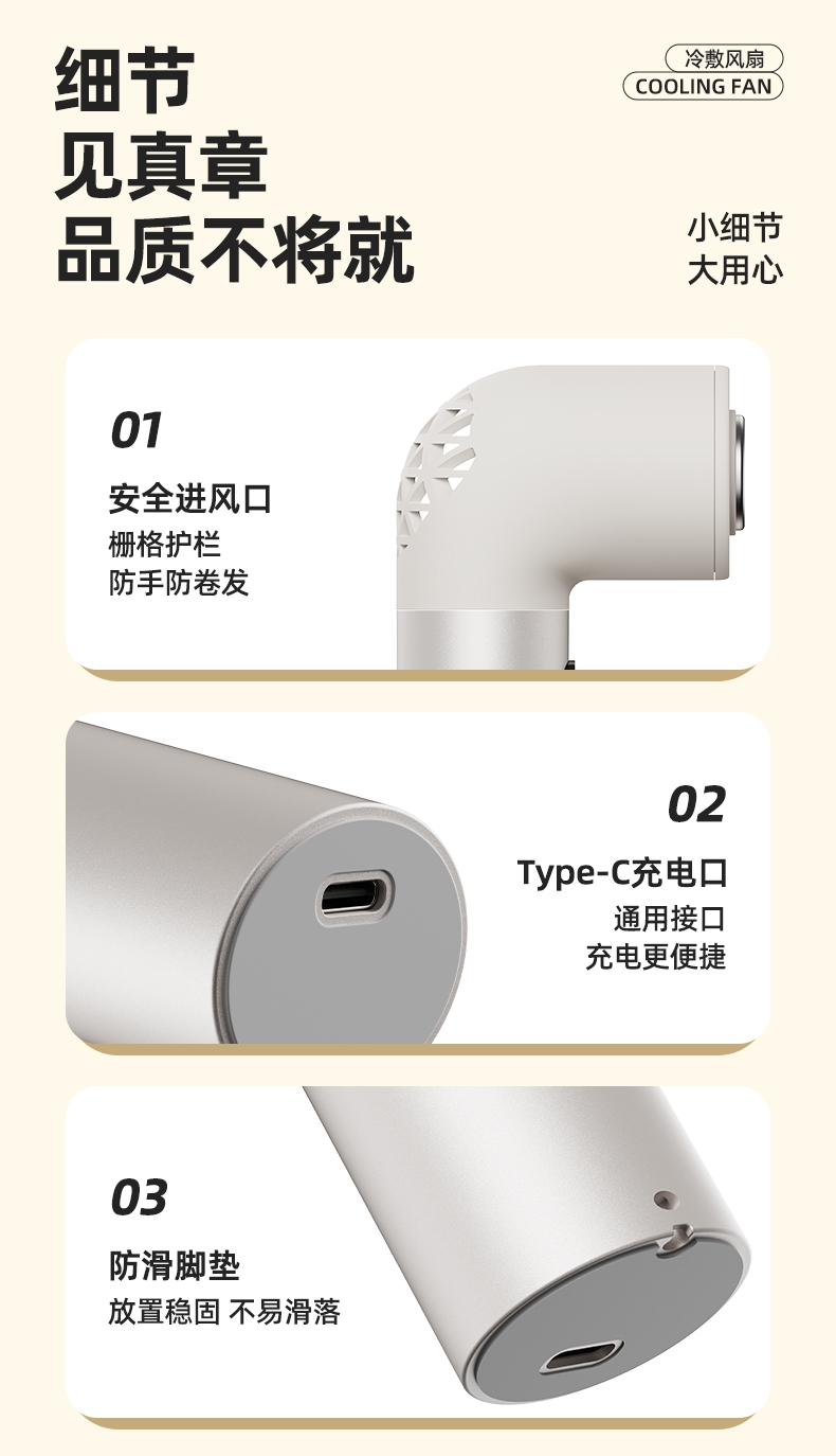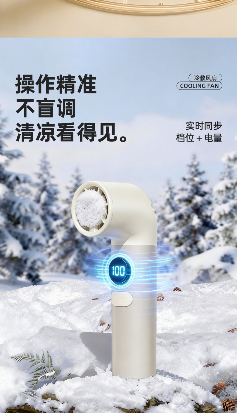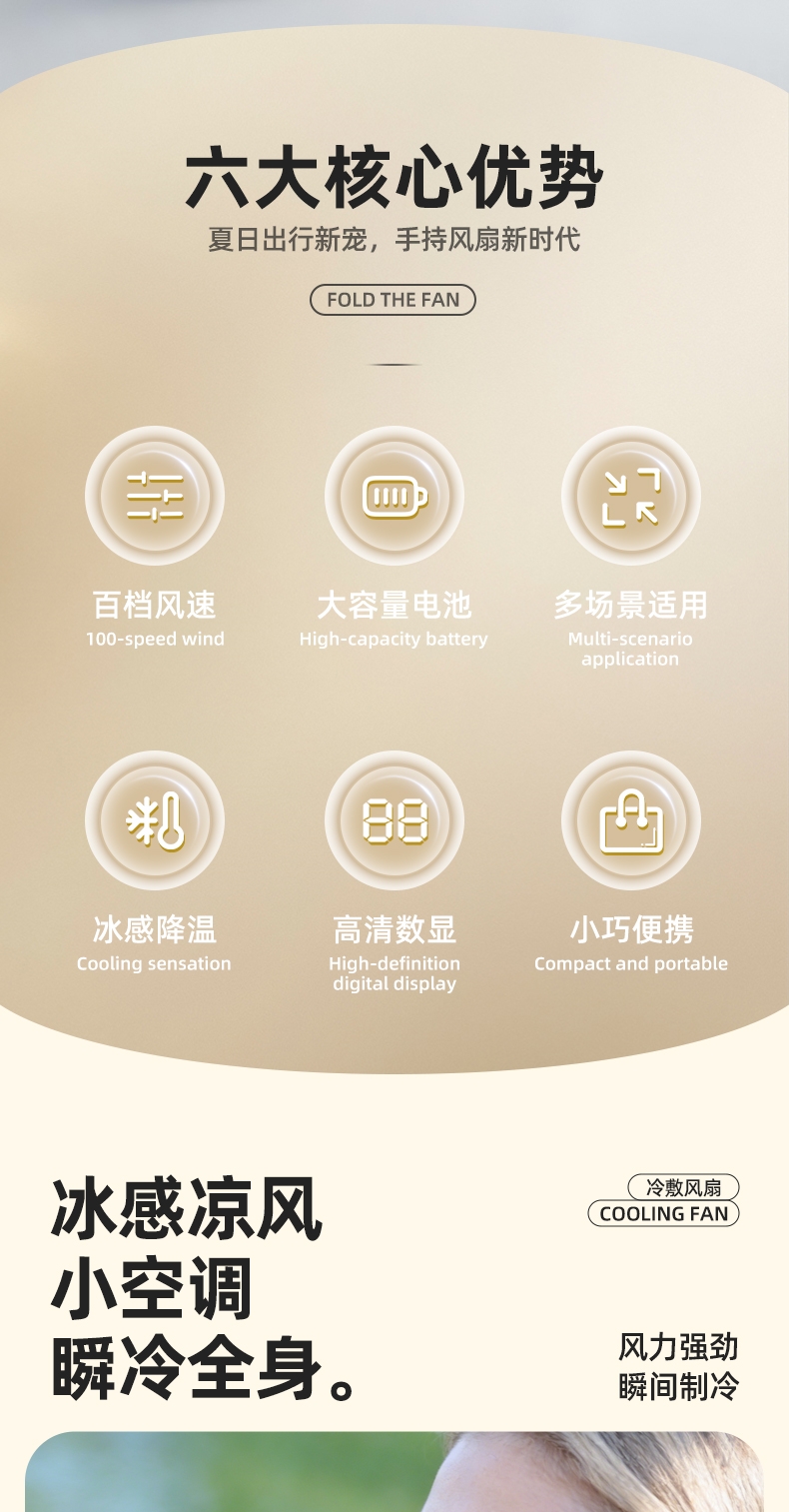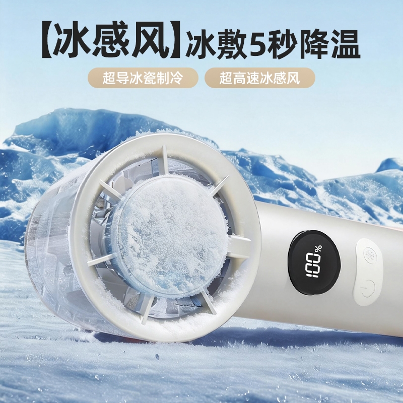 弯头设计不抬手,冷敷风秒降温;小而强悍,冰感凉风,多角度送风;数显电量,便携随身,夏日降温神器