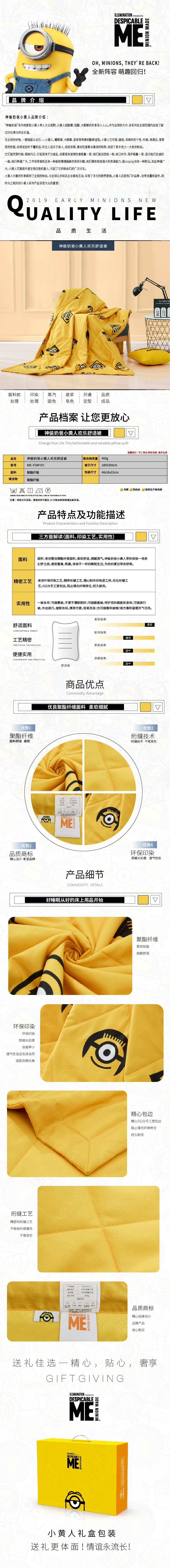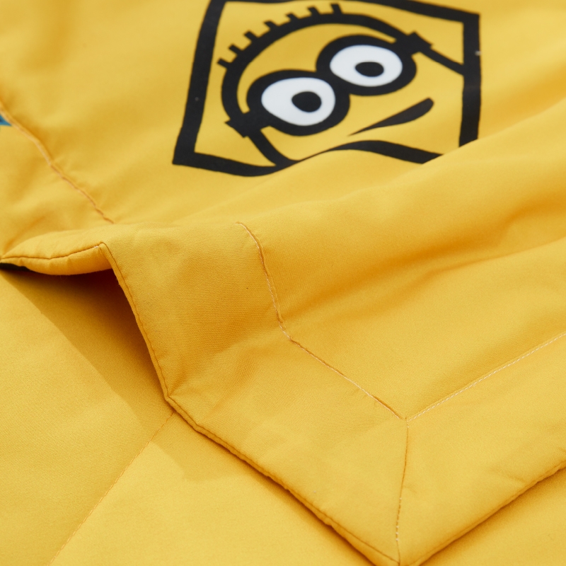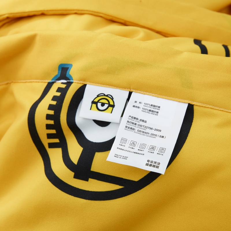 面料印染:采用绿色印染工艺,绿色安心;神偷奶爸小黄人带你感受童真,萌趣和探索;精密绗缝工艺,精心制作的每道工序,应位绗缝工艺