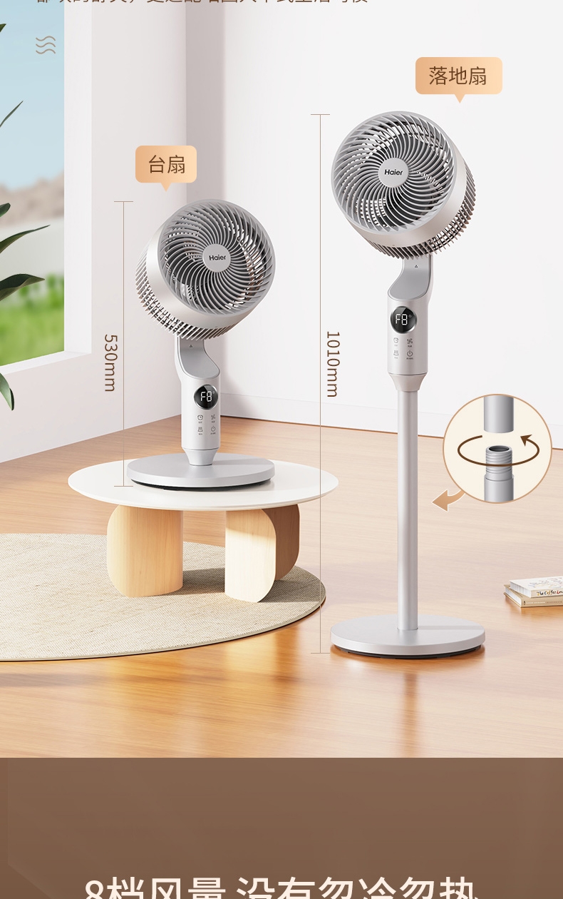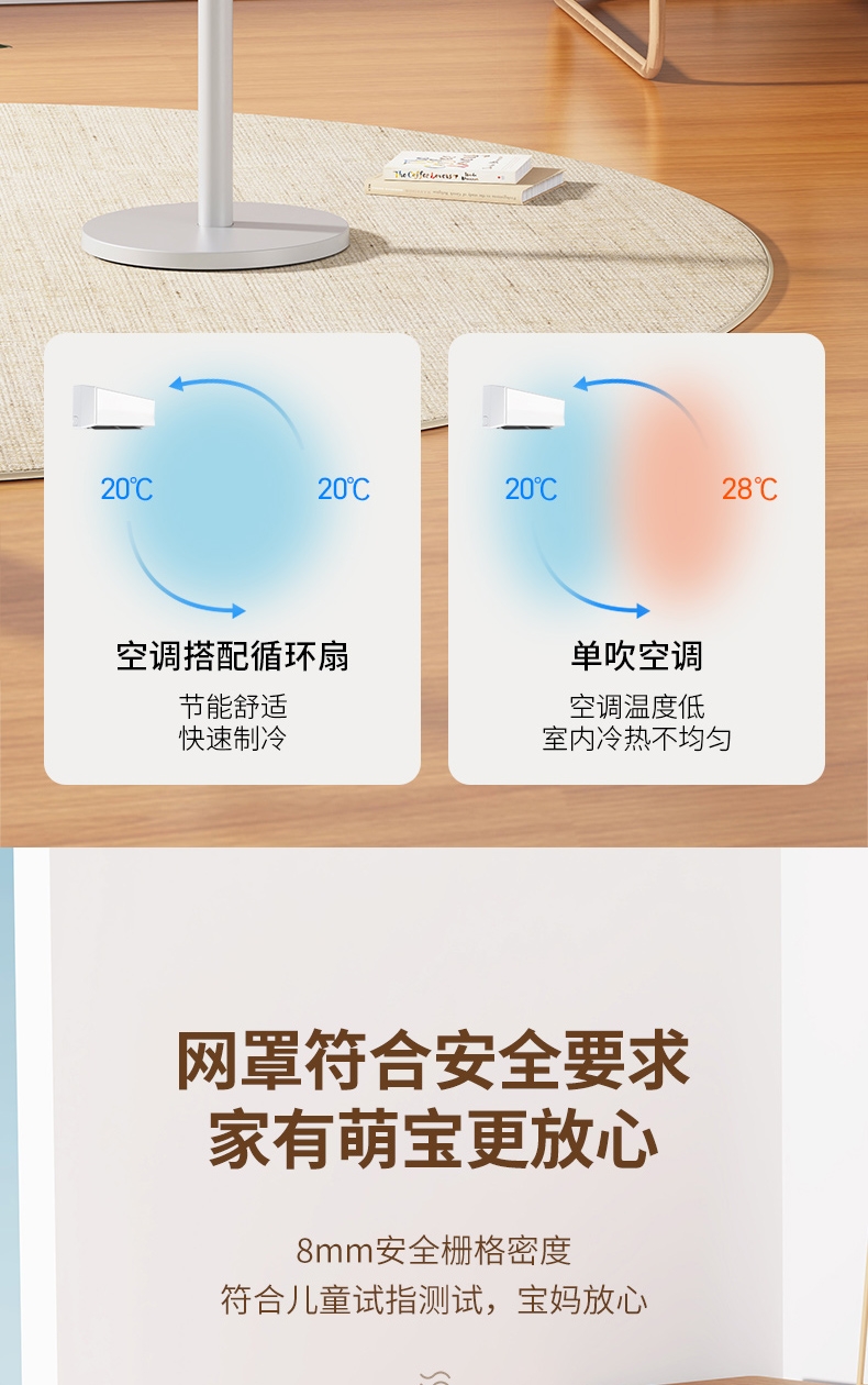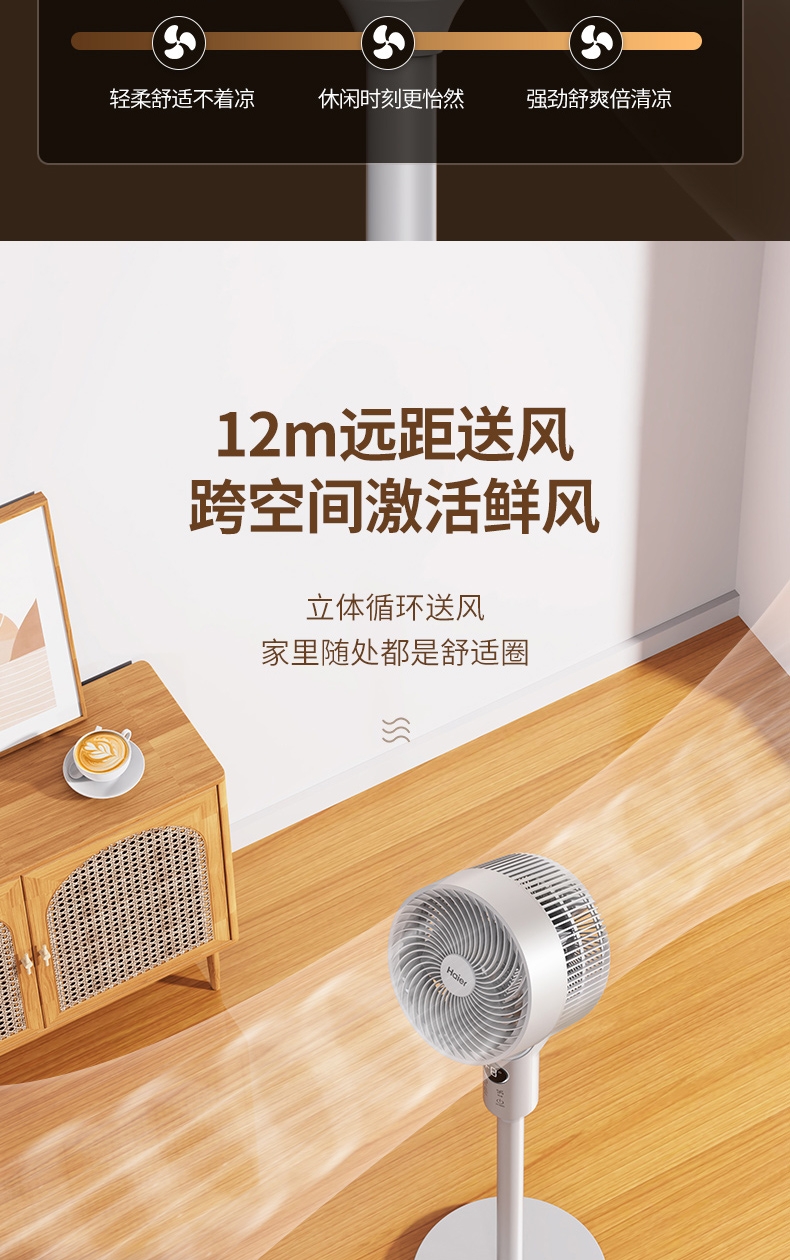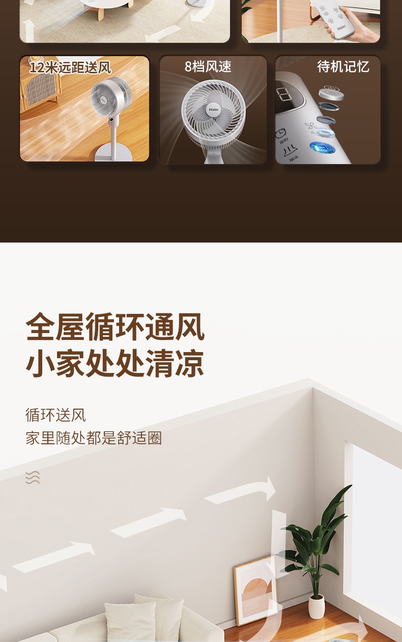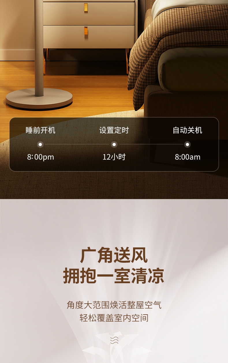 全新身高能两用顺应全家纳凉节奏;8档风量从细腻的轻柔风到劲爽清凉;12m远距送风跨空间激活鲜风