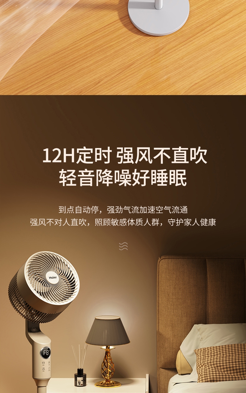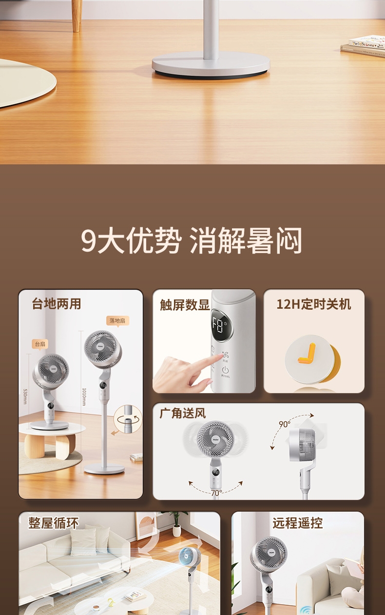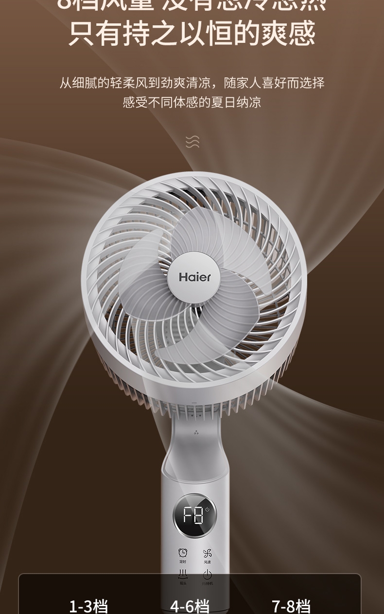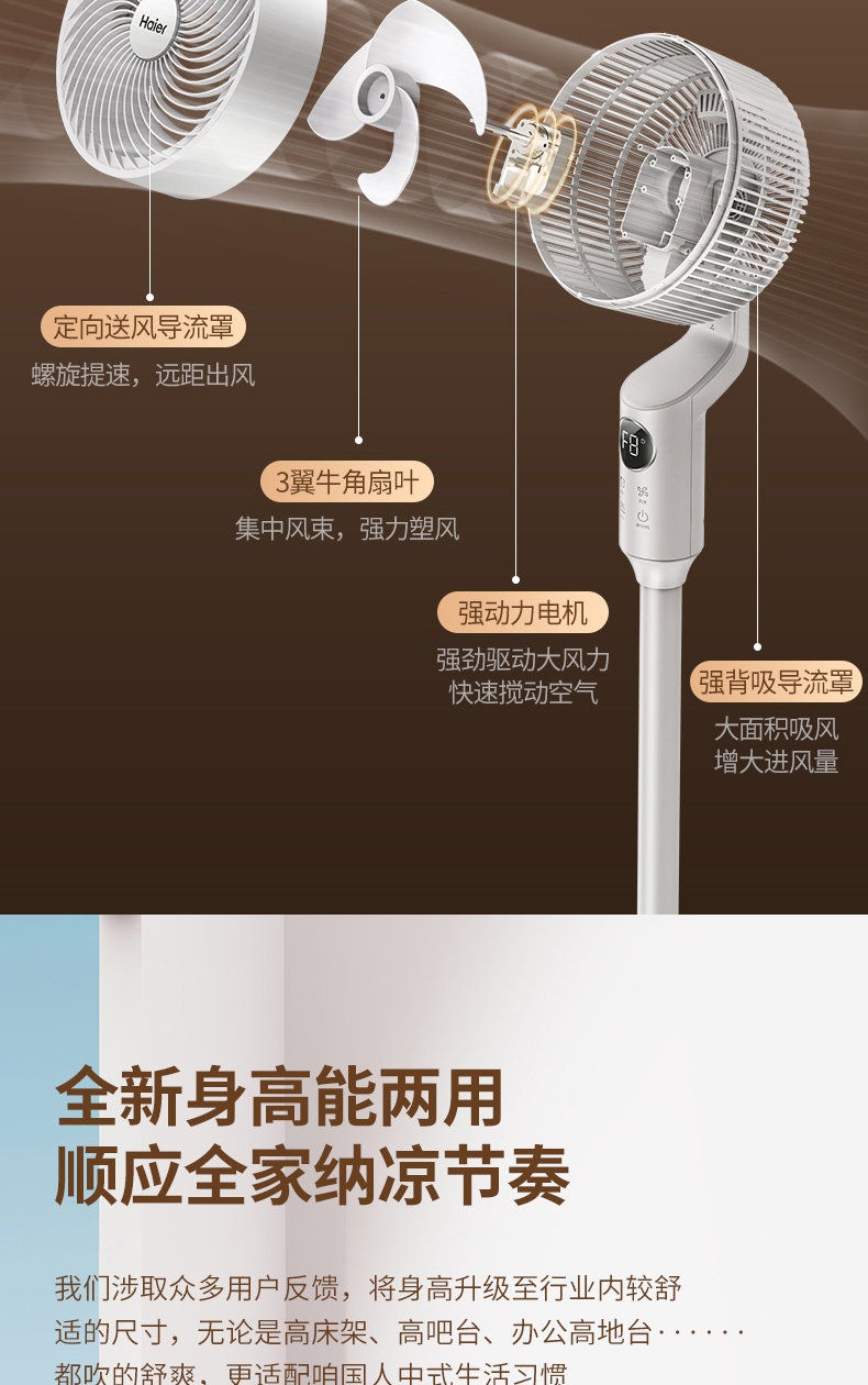 全新身高能两用顺应全家纳凉节奏;8档风量从细腻的轻柔风到劲爽清凉;12m远距送风跨空间激活鲜风