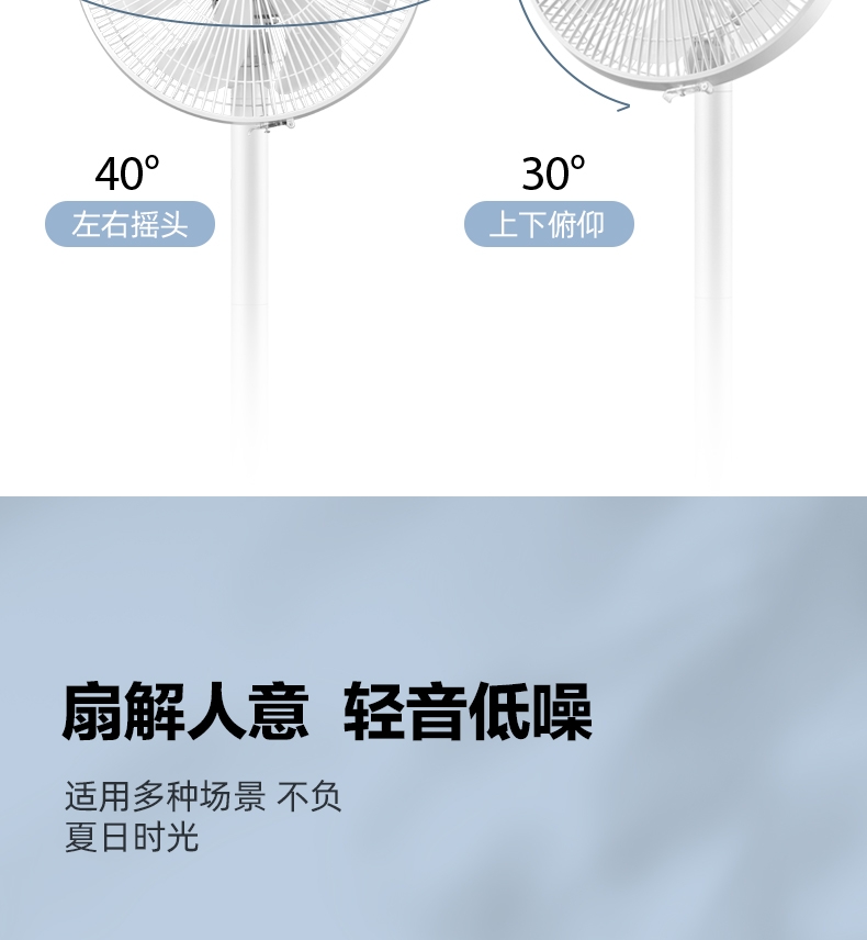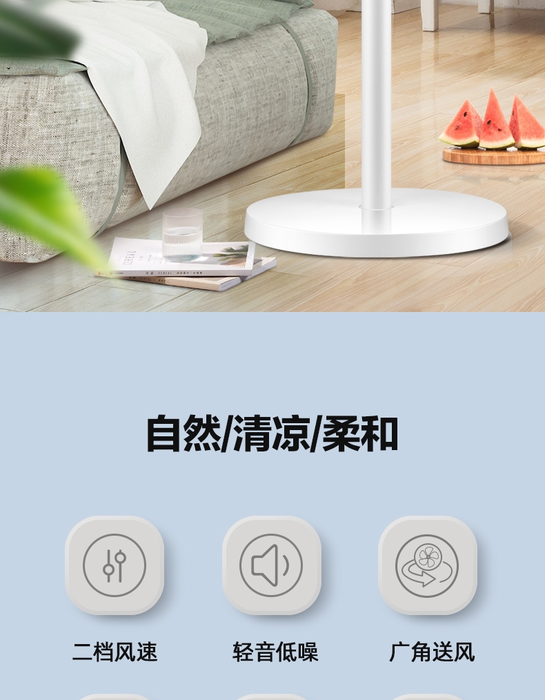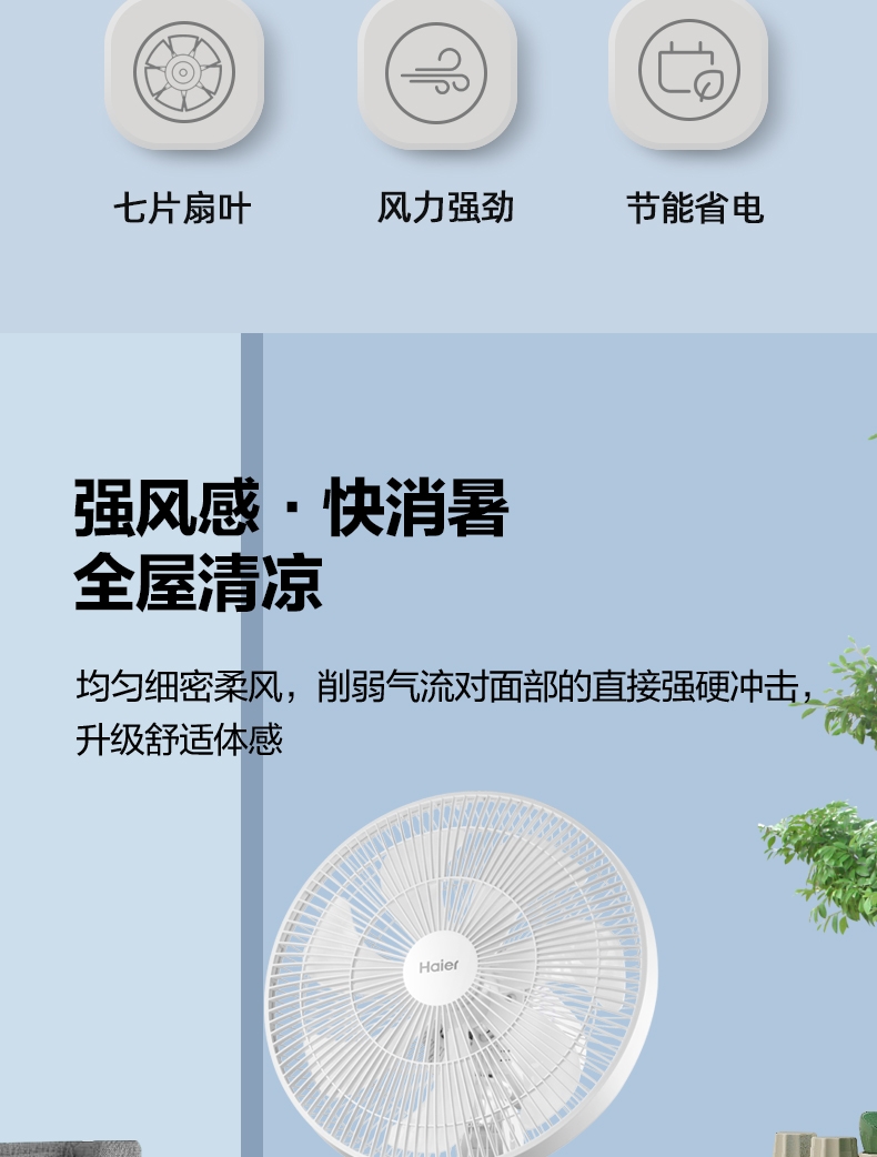 二档风速,节能环保,安全省电;七片扇叶,风力强劲,轻音低噪;广角送风,赶走炎热拥抱清凉