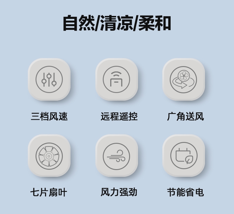 三档风速,遥控远程,节能省电;七片扇叶,风力强劲,轻音低噪;6米范围内可实现,远程遥控操作