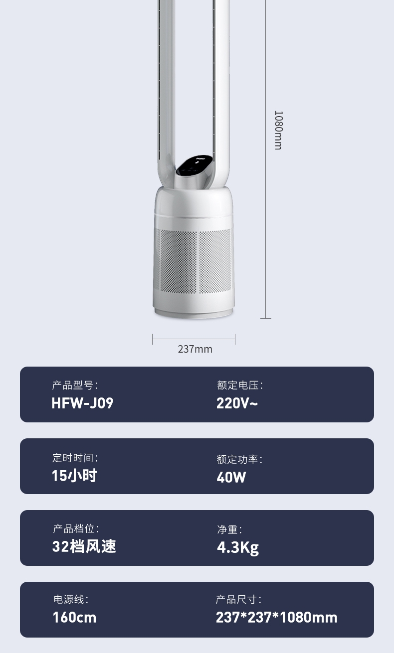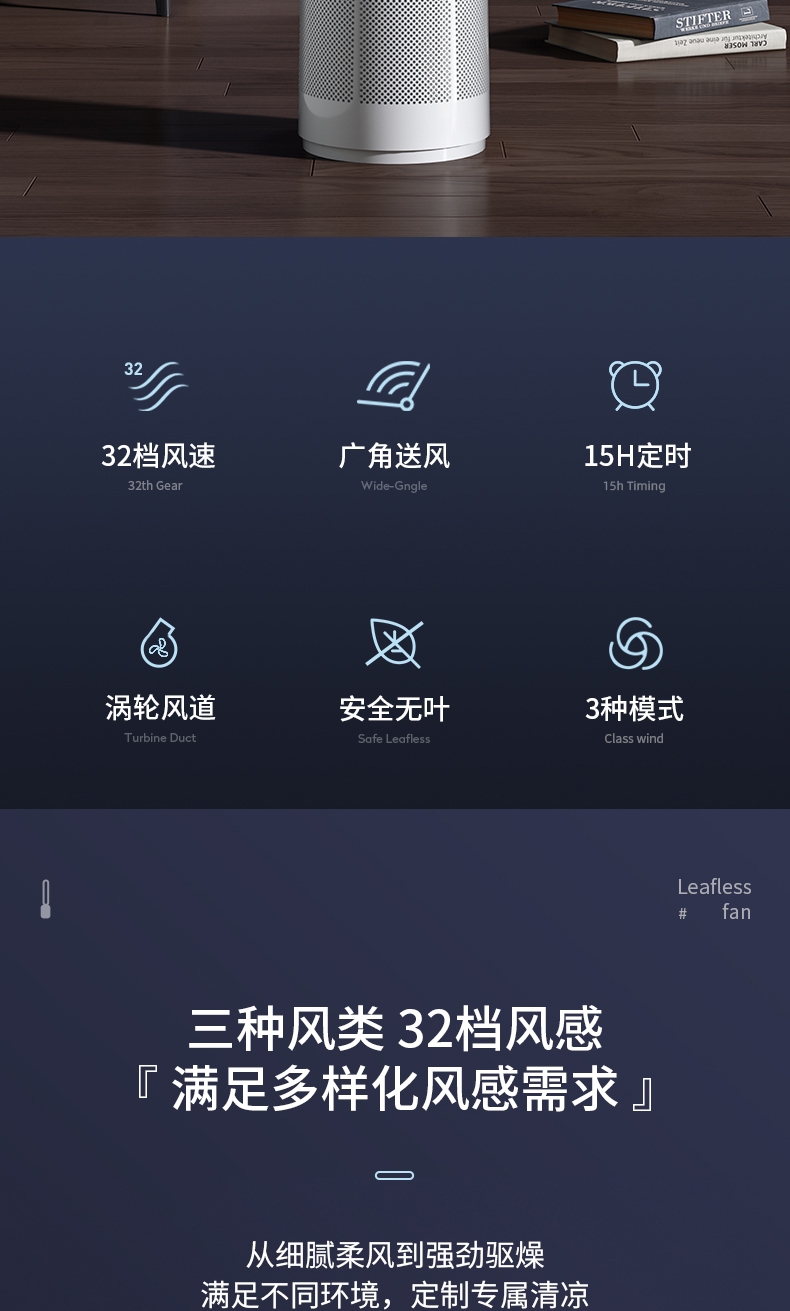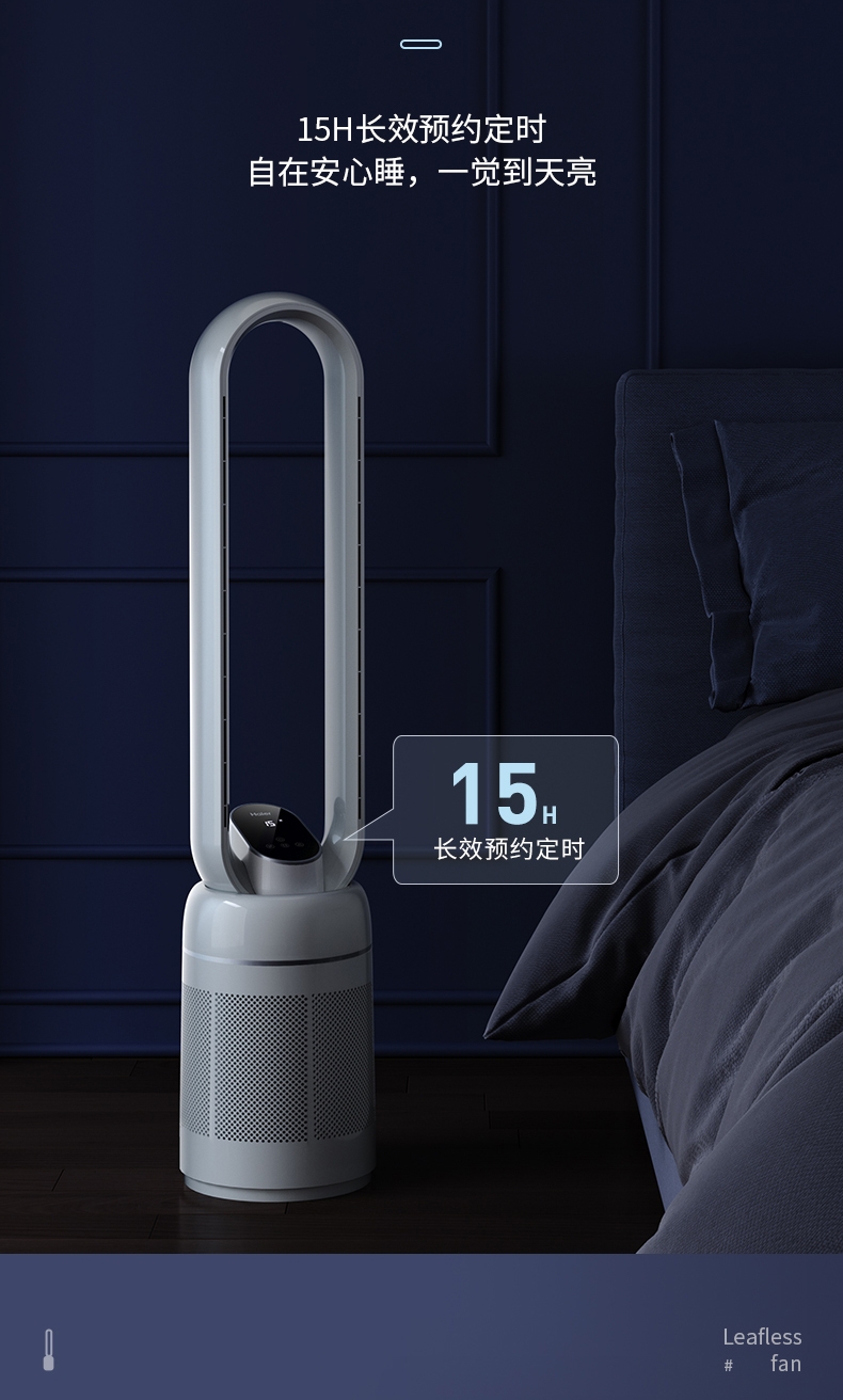三种风类,32档风感满足多样化风感需求;15H长效预约定时,自在安心睡,一觉到天亮;无叶设计,直流电机实现轻声送风