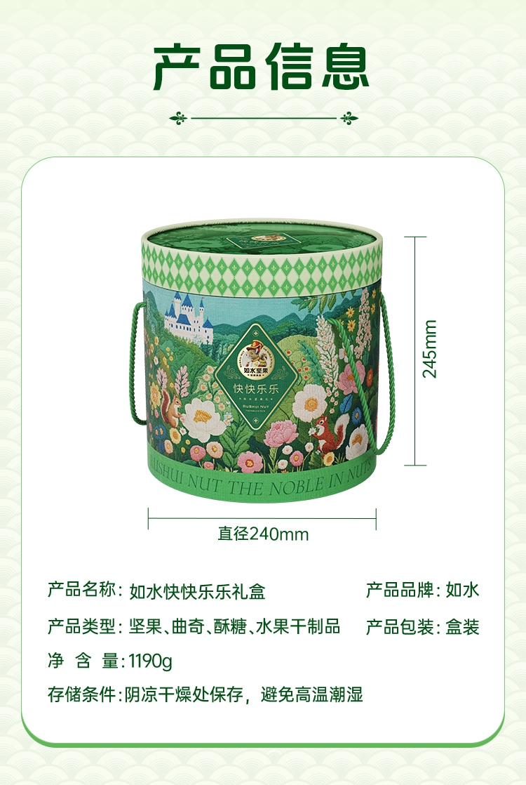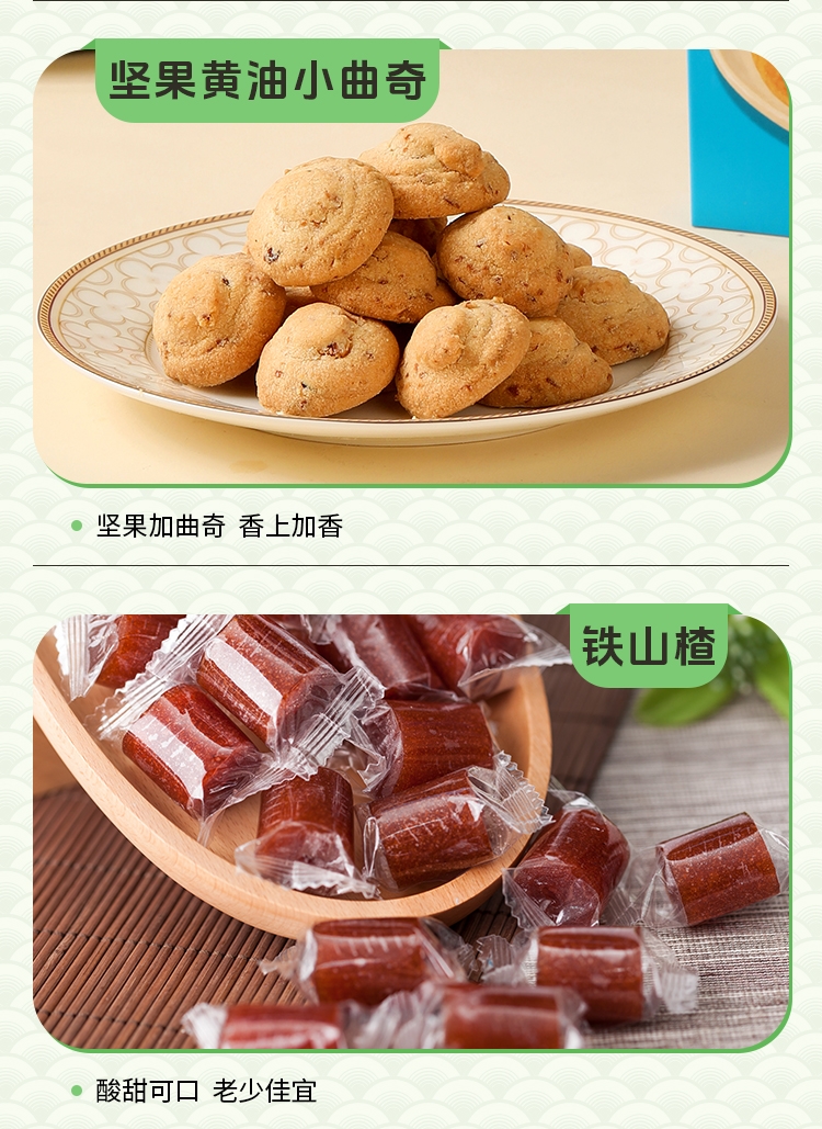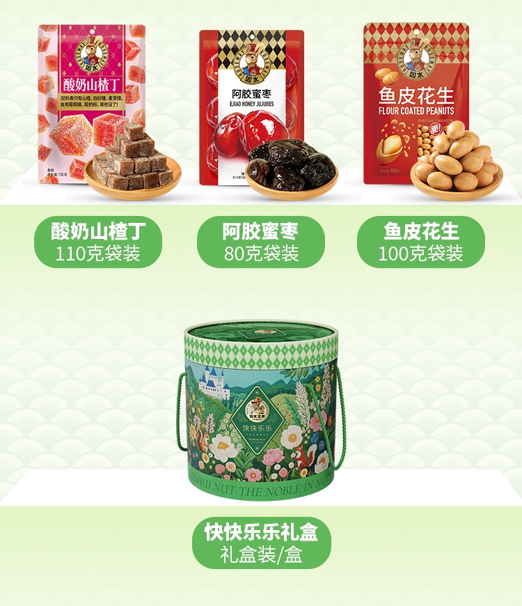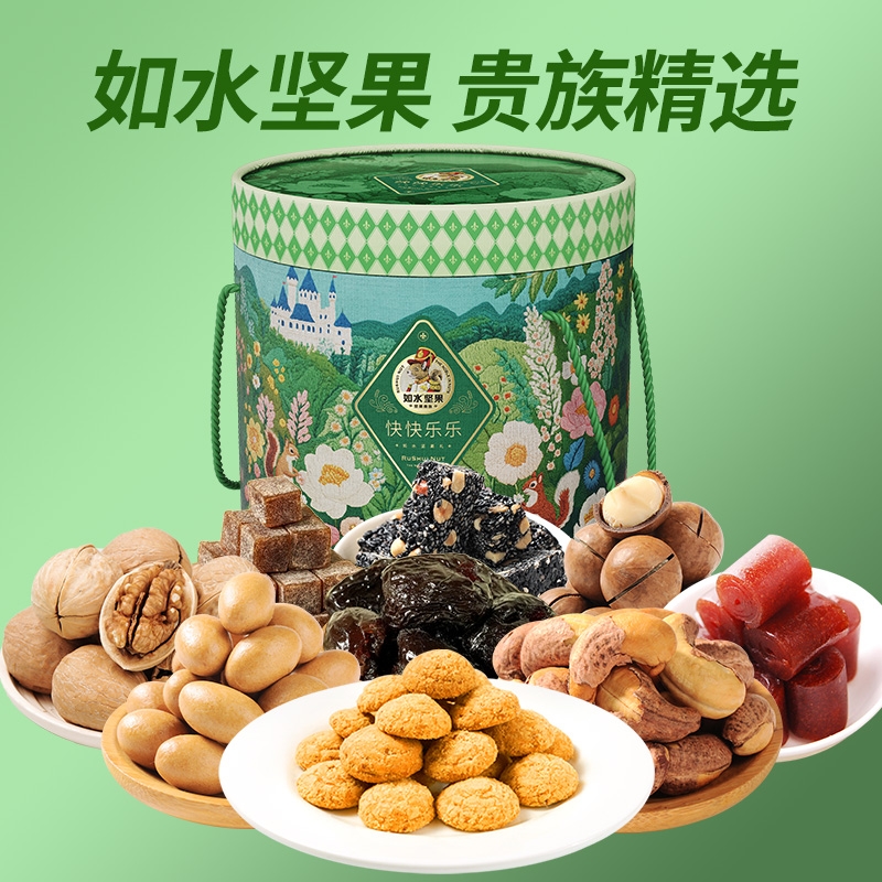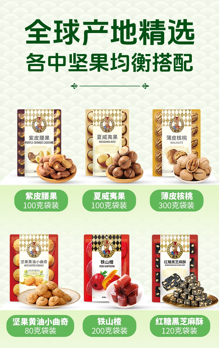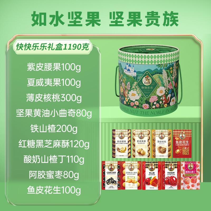 内容物:如水紫皮腰果100g 如水夏威夷果100g 如水薄皮核桃300g 如水坚果黄油小曲奇80g 如水铁山楂200g 如水红糖黑芝麻酥120g 如水酸奶山楂丁110g 如水阿胶蜜枣80g 如水鱼皮花生100g