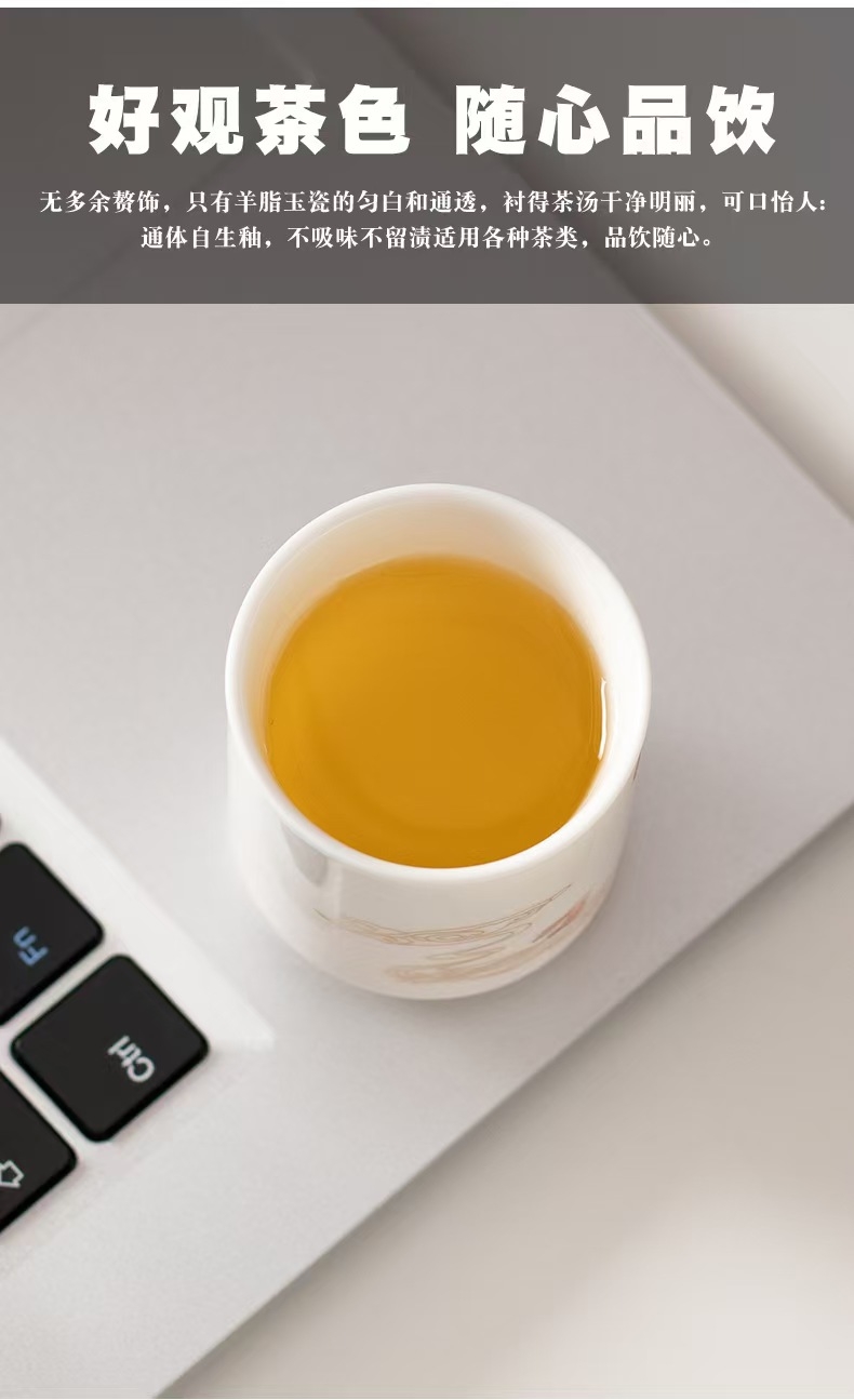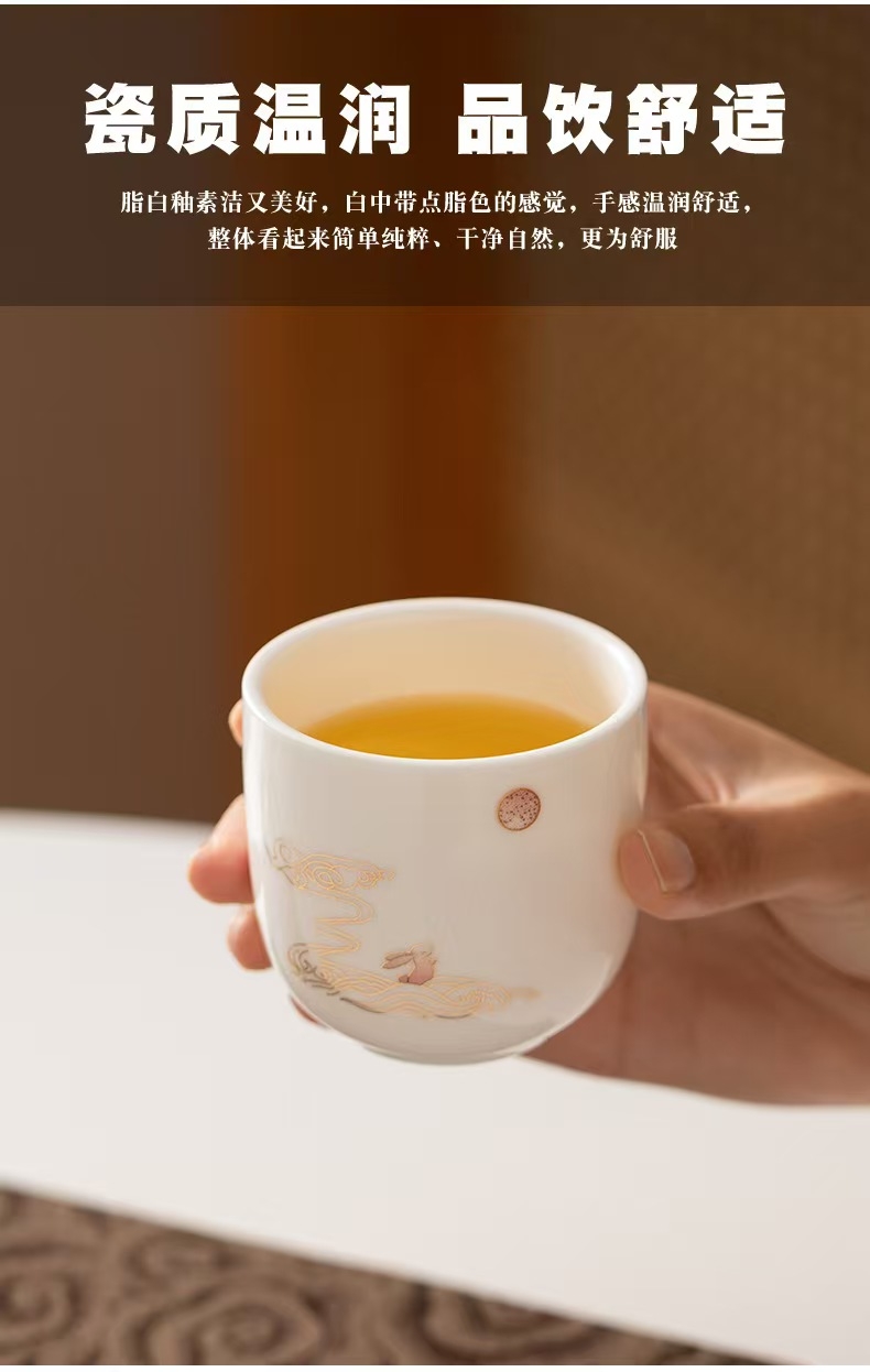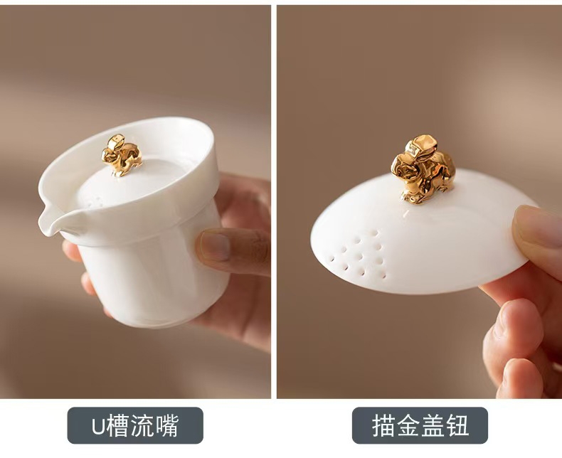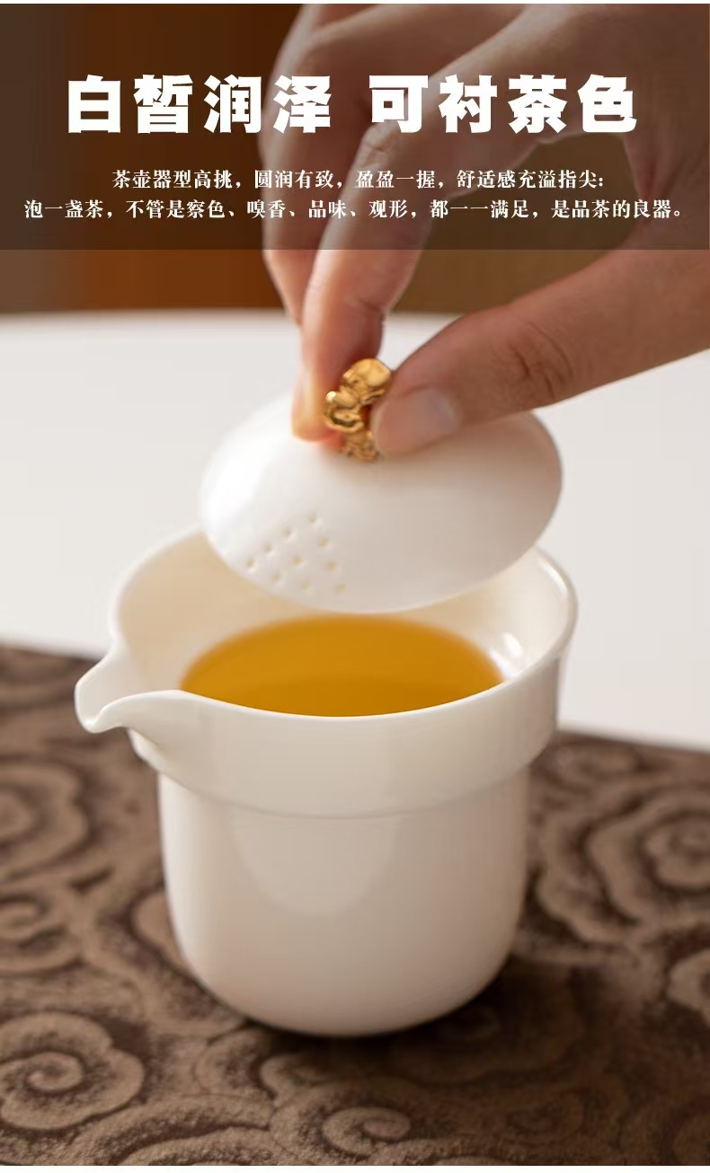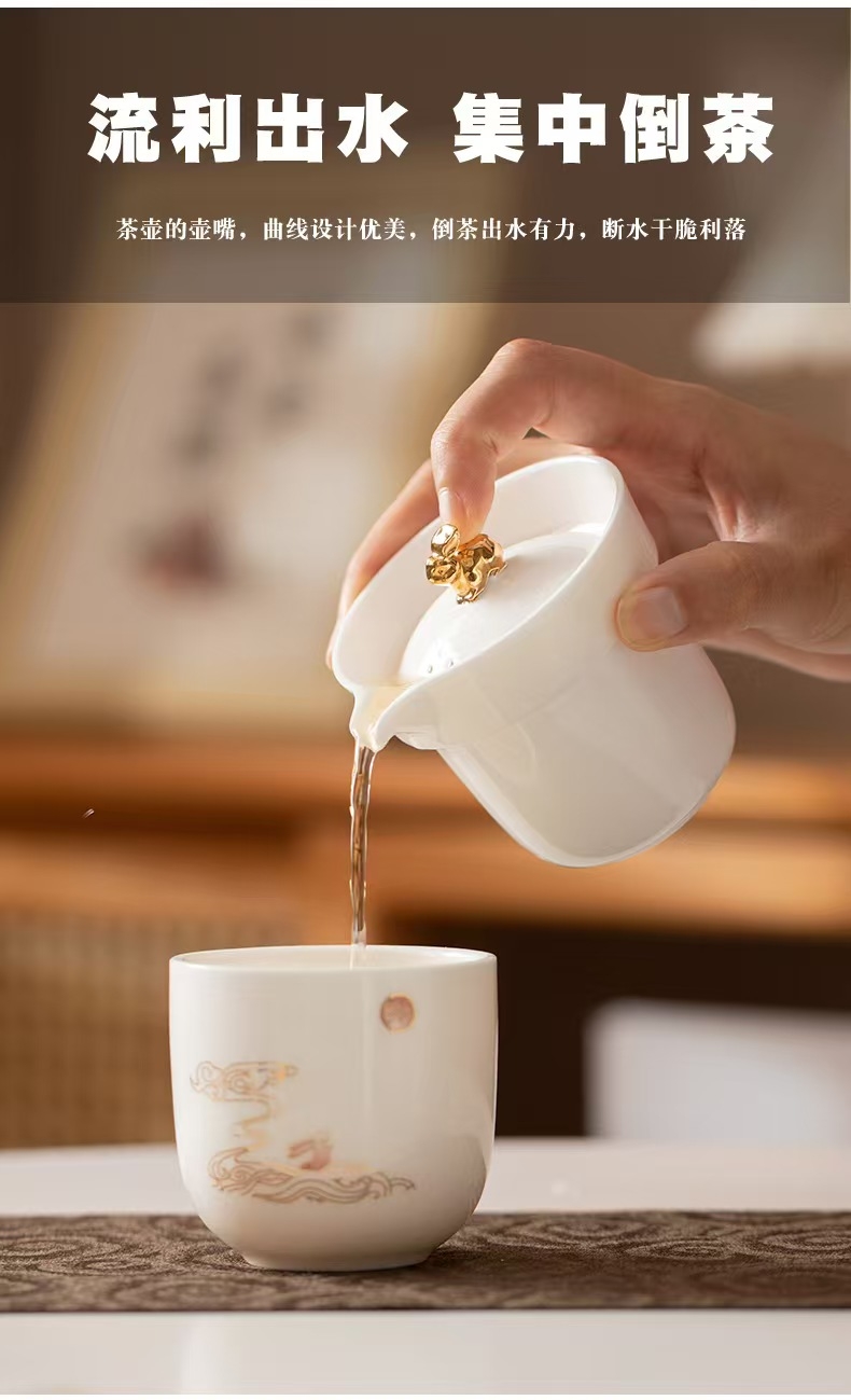鎏金壶盖,杯身描金色祥云花面。;高档描金羊脂玉瓷,精选优质高价瓷土 ,瓷质细腻润滑;如美玉。茶具描真金,尽显高档。