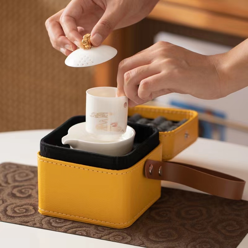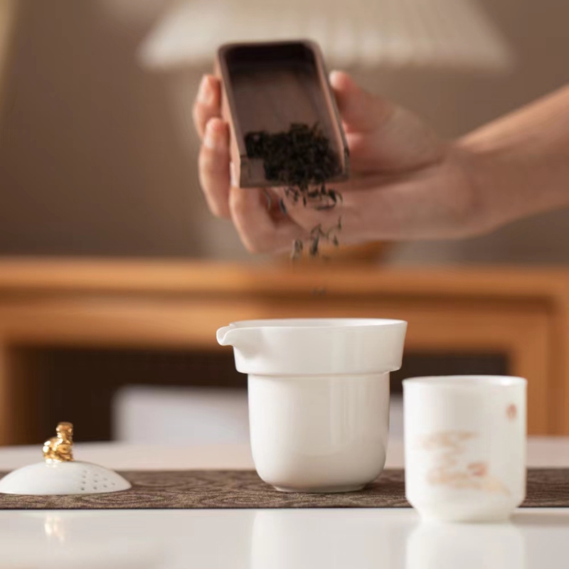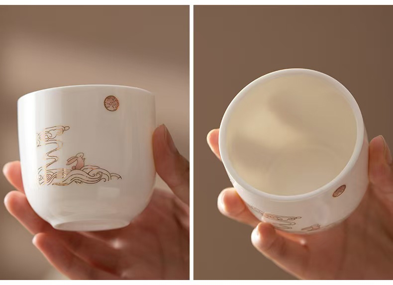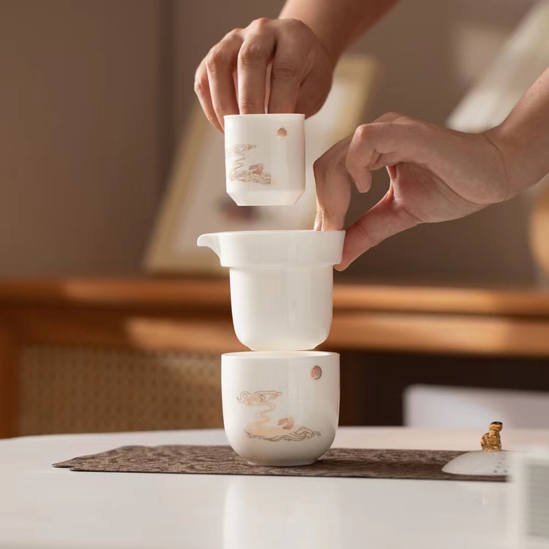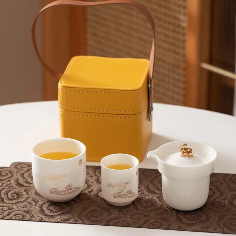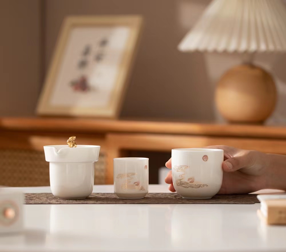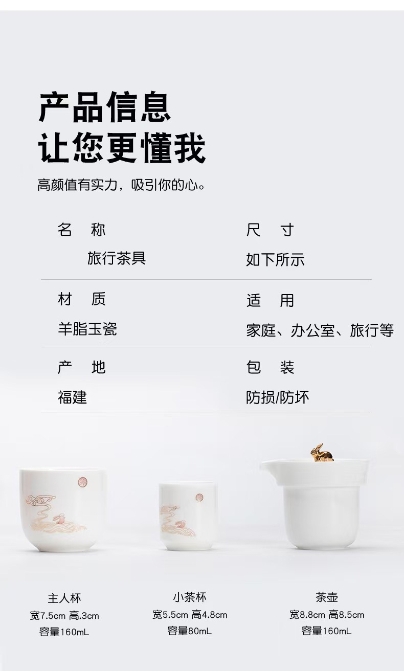 鎏金壶盖,杯身描金色祥云花面。;高档描金羊脂玉瓷,精选优质高价瓷土 ,瓷质细腻润滑;如美玉。茶具描真金,尽显高档。