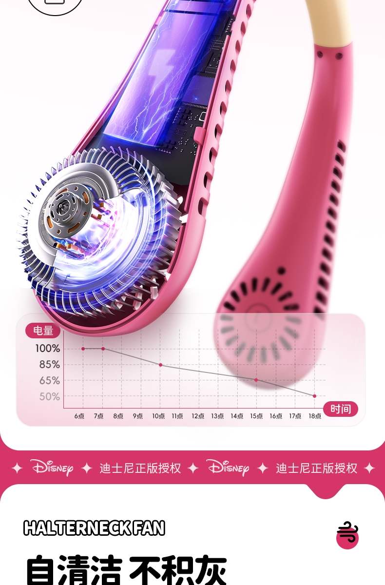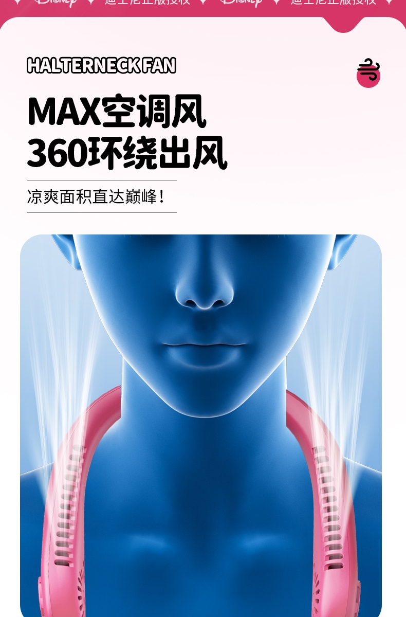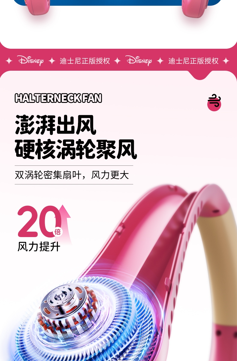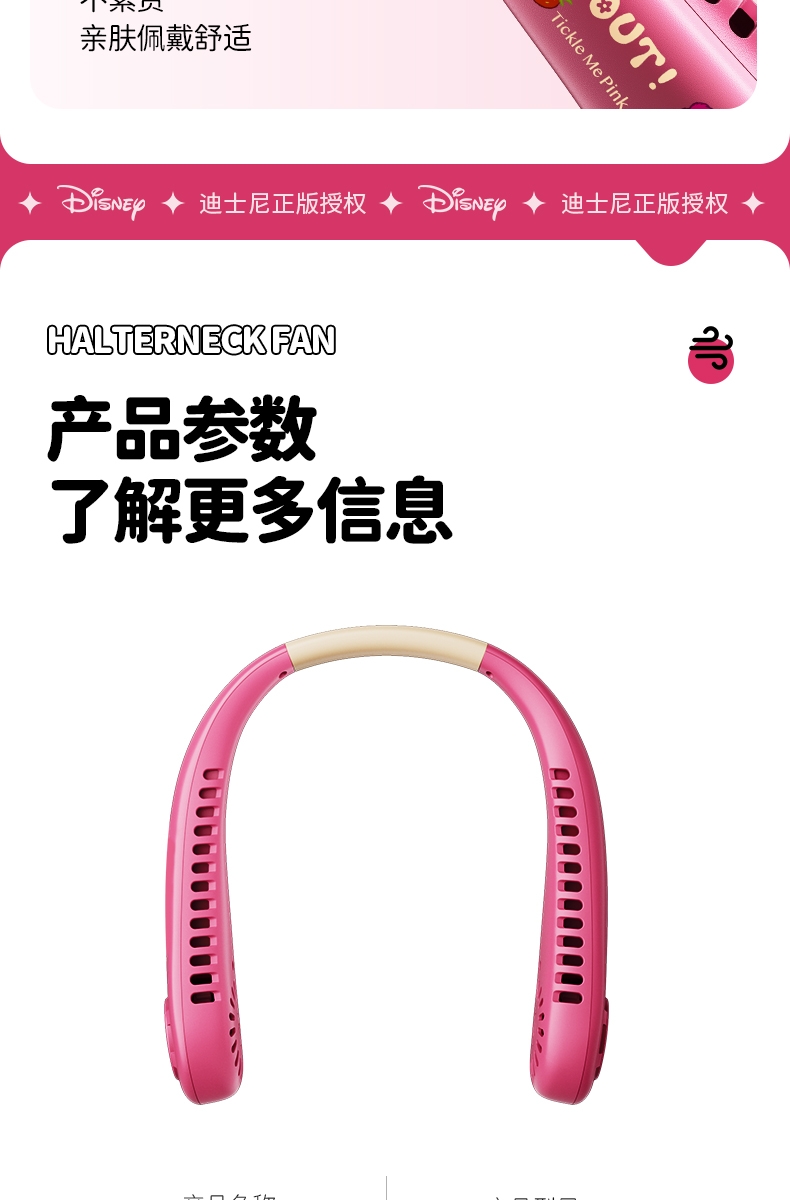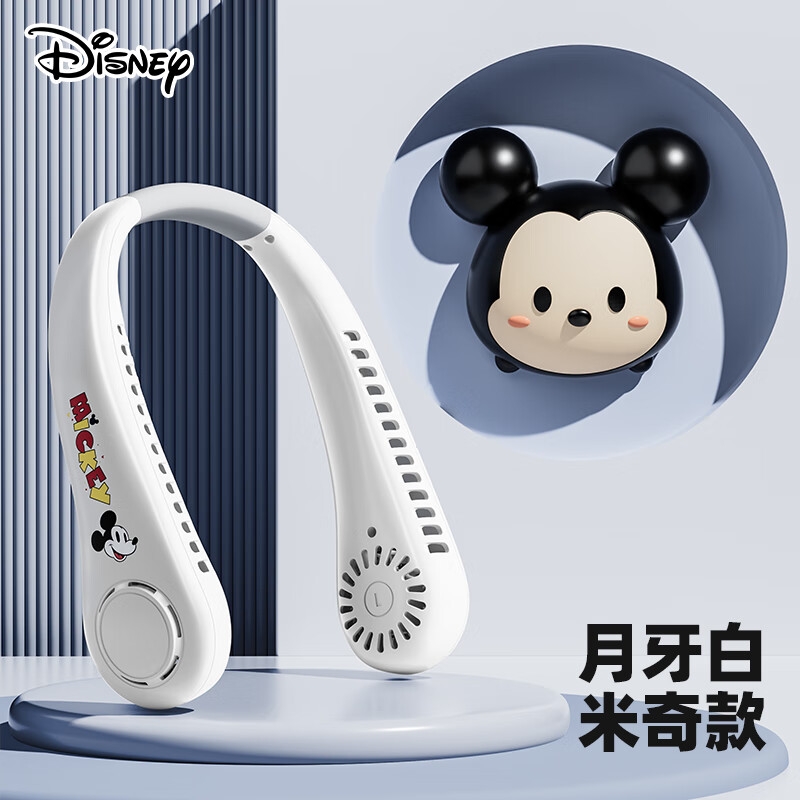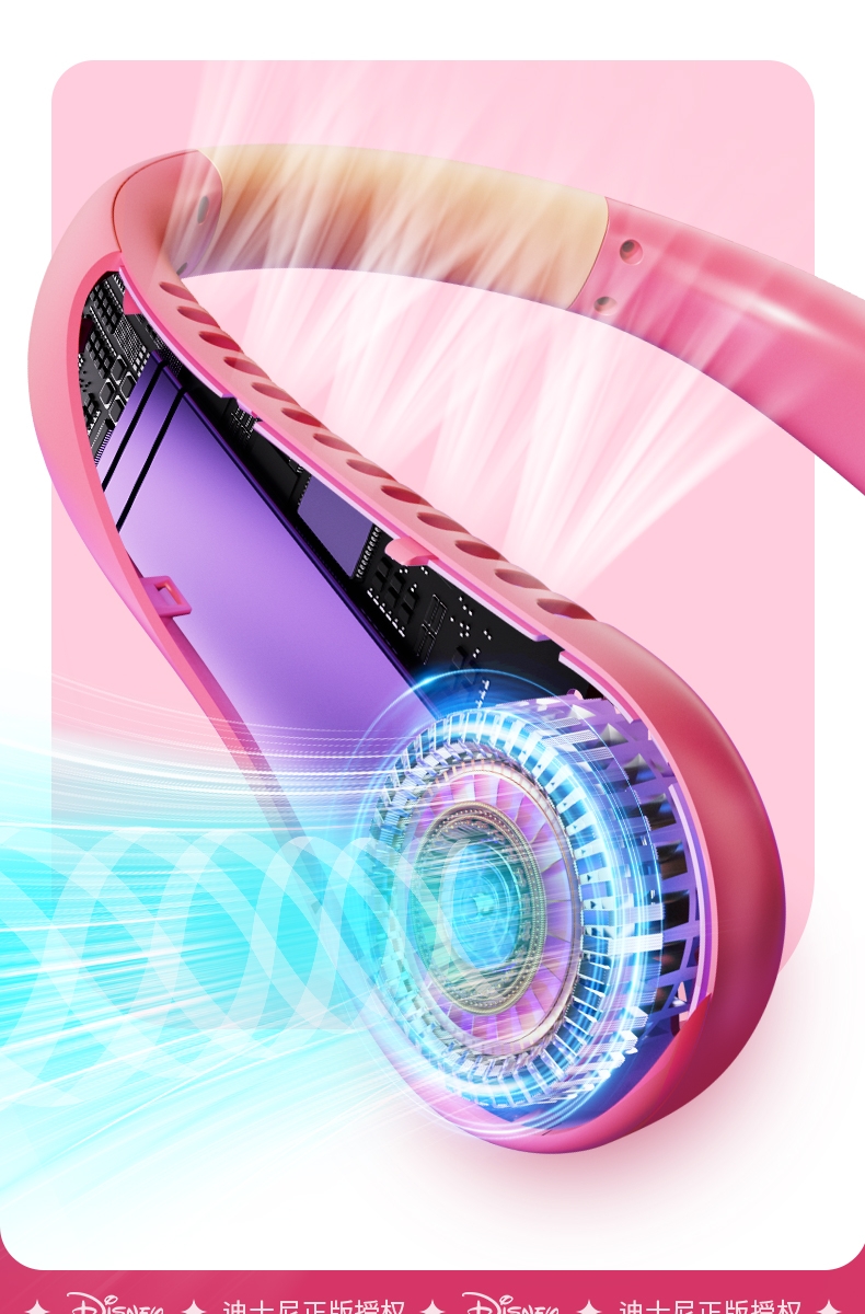 迪士尼正版授权IP,卡通图案,多色潮酷无叶挂脖风扇;360°环绕送风,轻量无感,久戴不累,风力强劲;长续航USB快充,超便捷随身,夏日清凉神器.