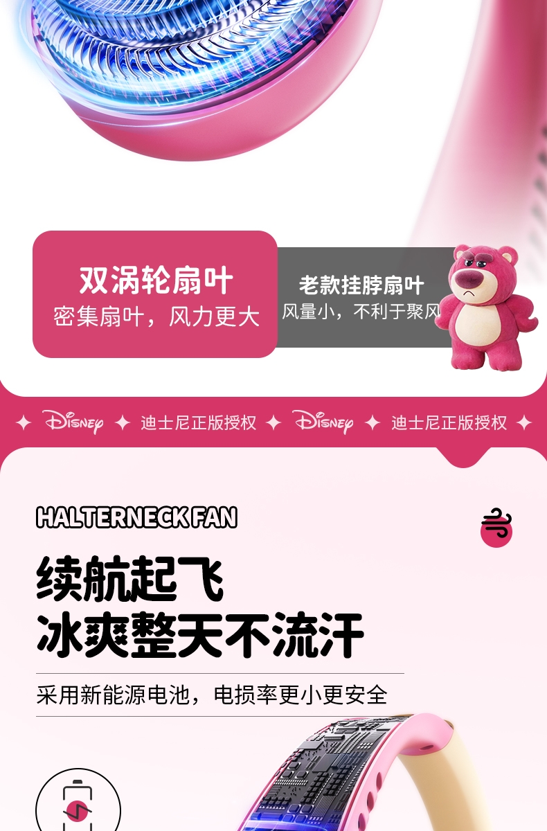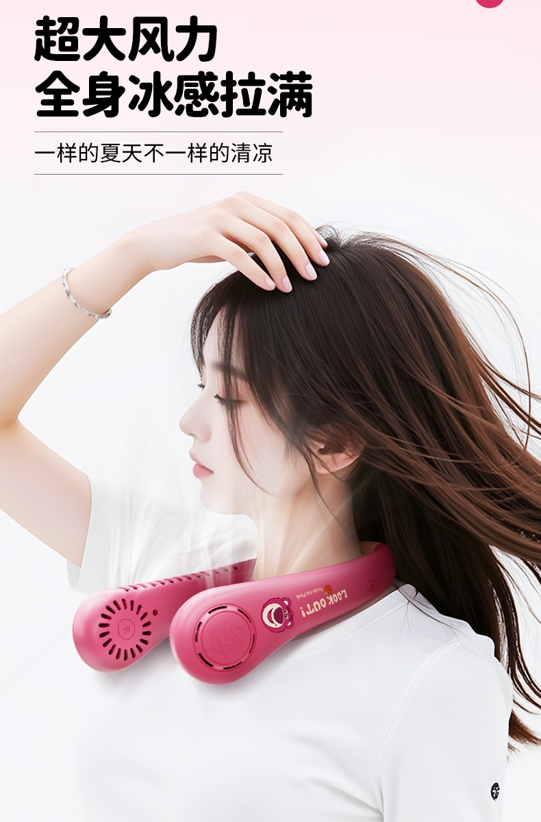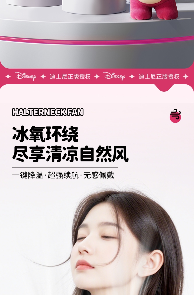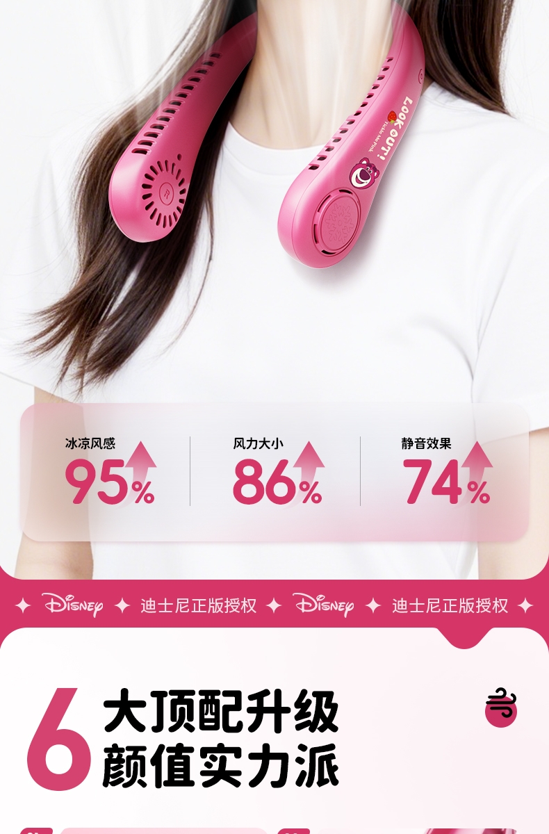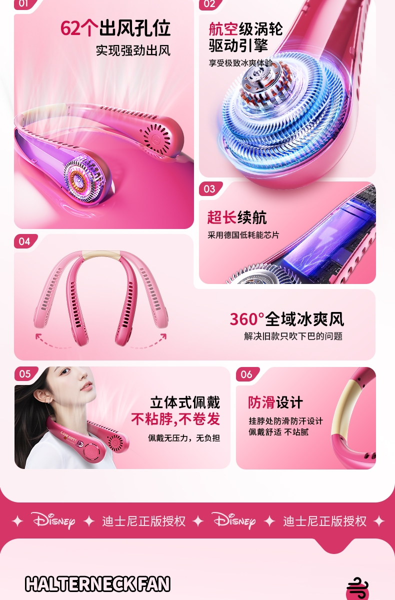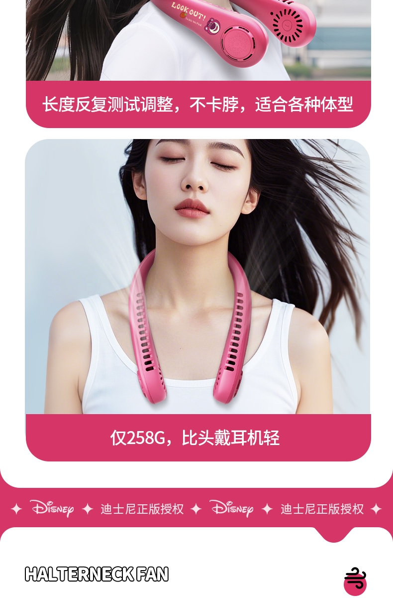 迪士尼正版授权IP,卡通图案,多色潮酷无叶挂脖风扇;360°环绕送风,轻量无感,久戴不累,风力强劲;长续航USB快充,超便捷随身,夏日清凉神器.