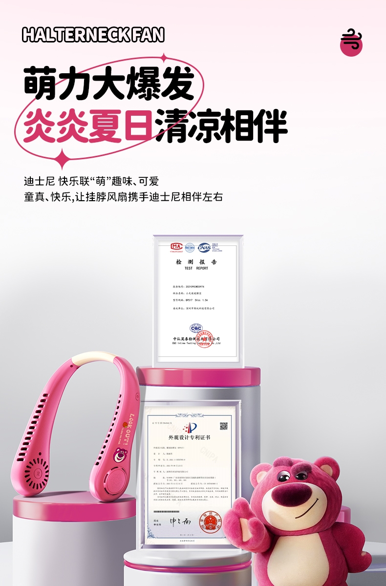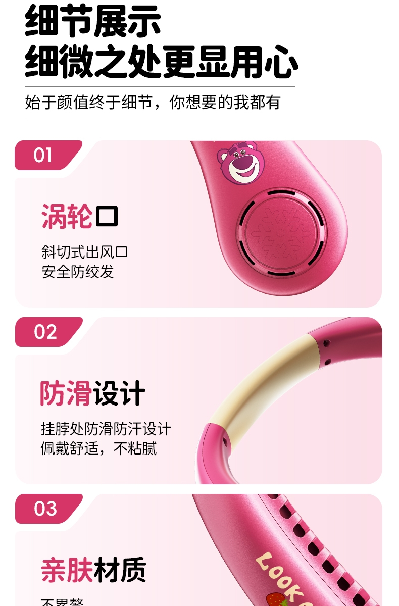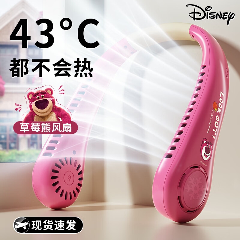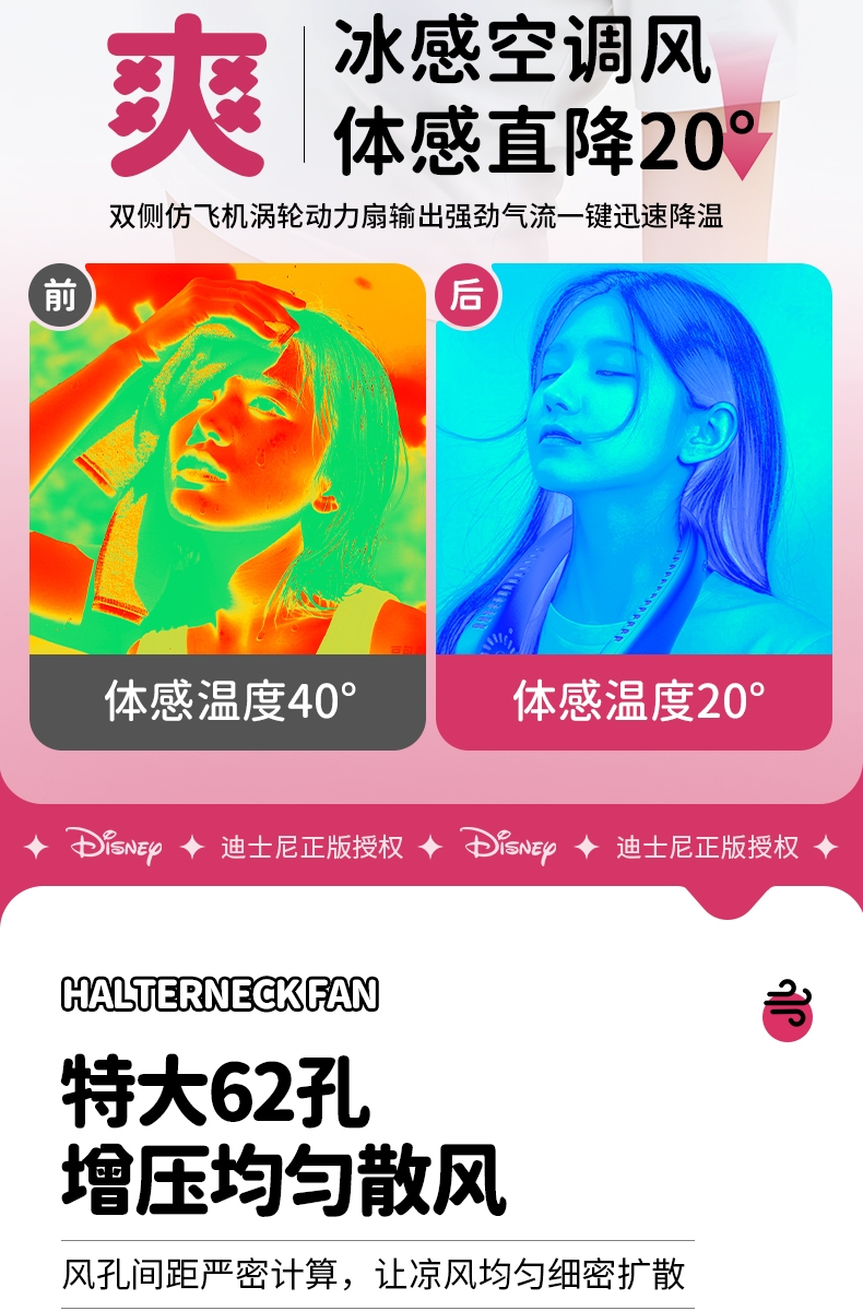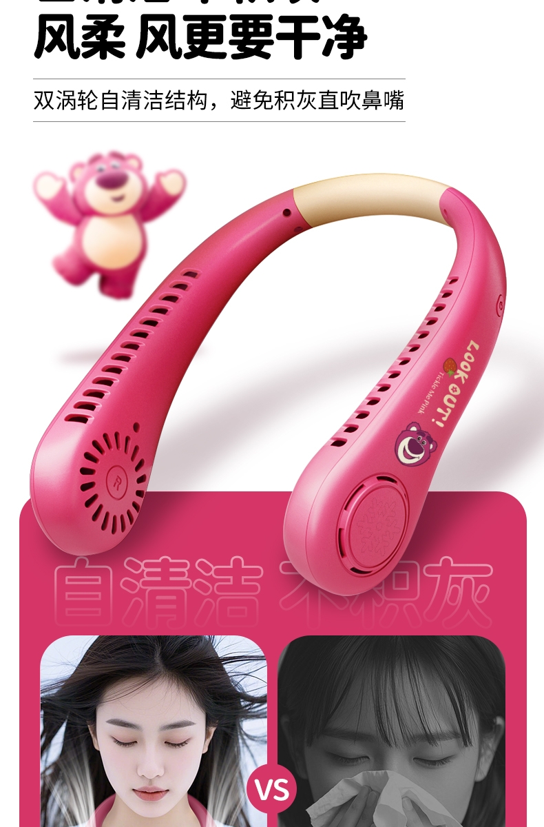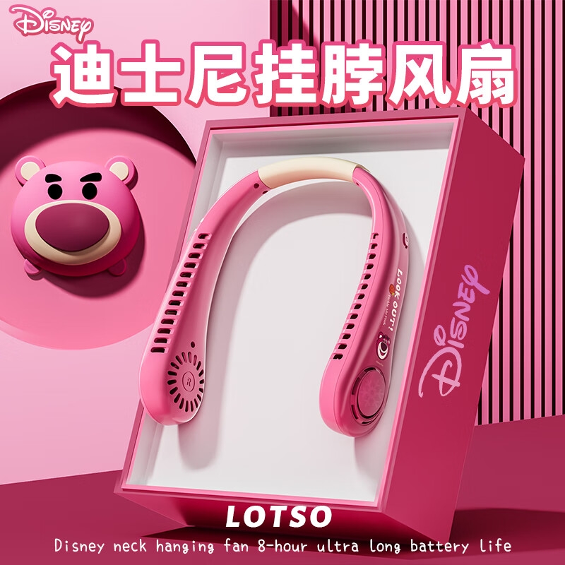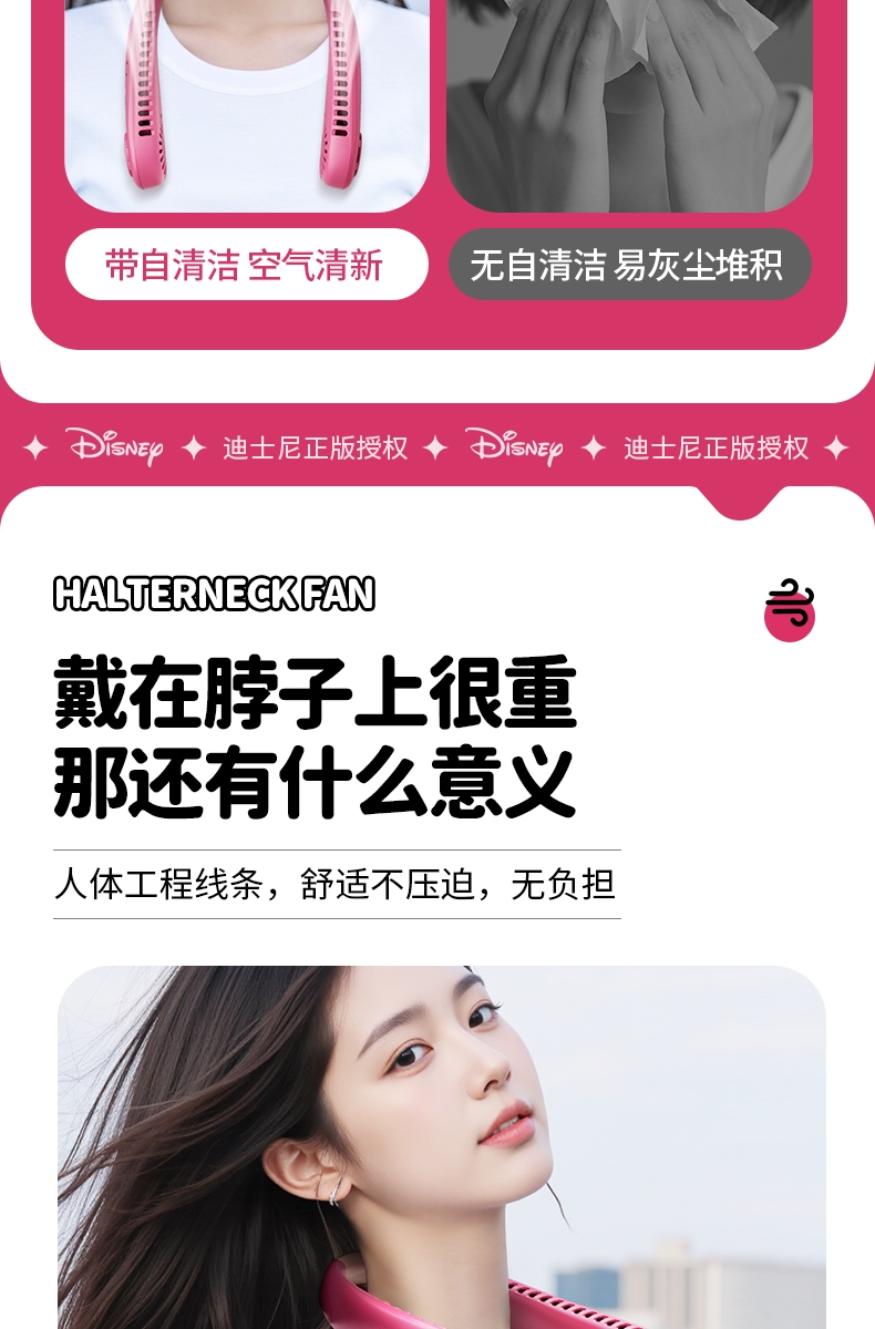 迪士尼正版授权IP,卡通图案,多色潮酷无叶挂脖风扇;360°环绕送风,轻量无感,久戴不累,风力强劲;长续航USB快充,超便捷随身,夏日清凉神器.