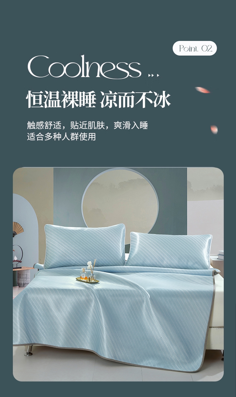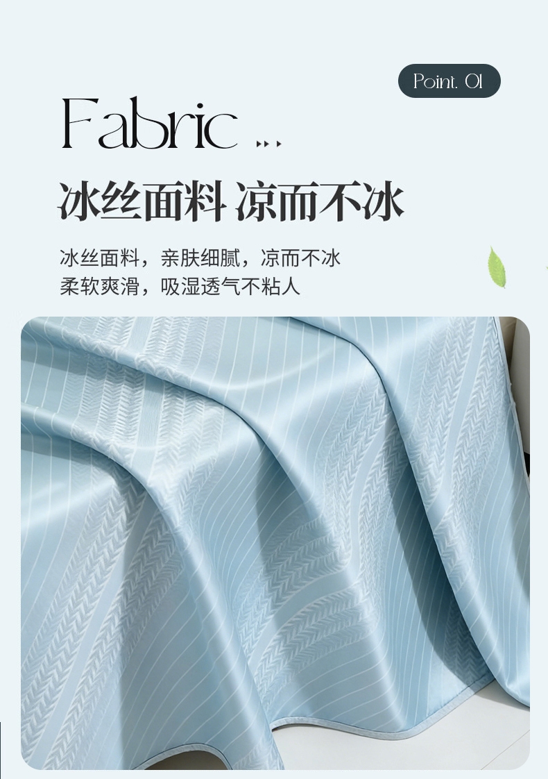 萃取植物冰丝,自然清凉;凉而不冰,久睡不粘。;有效起到抗菌效果,洁净卫生,适合裸睡。