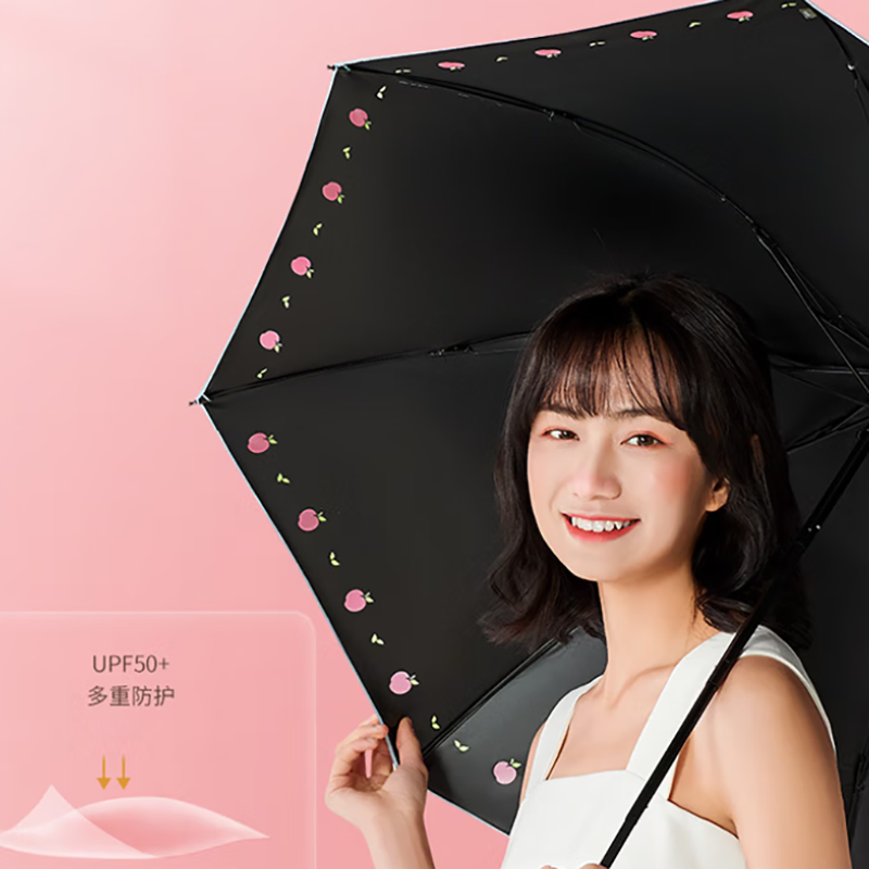 致密黑胶抗晒涂层,有效阻隔紫外线;轻盈随身携带;晴雨两用