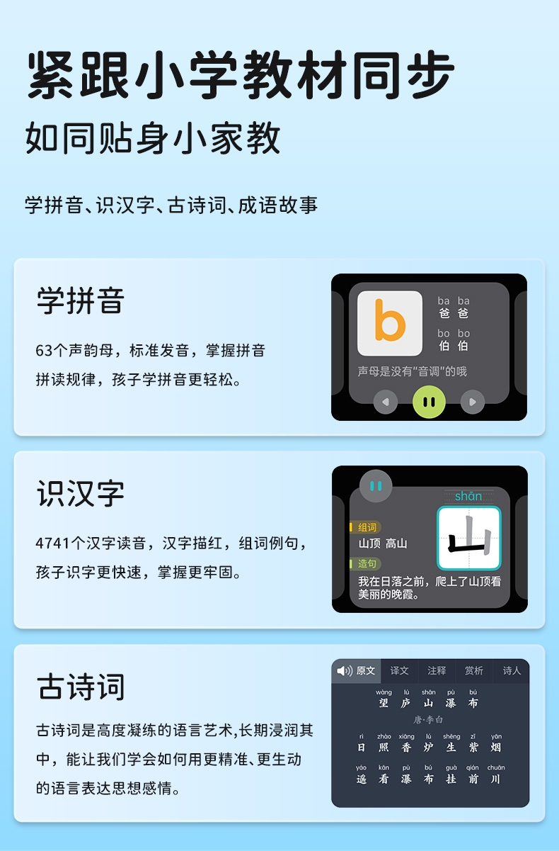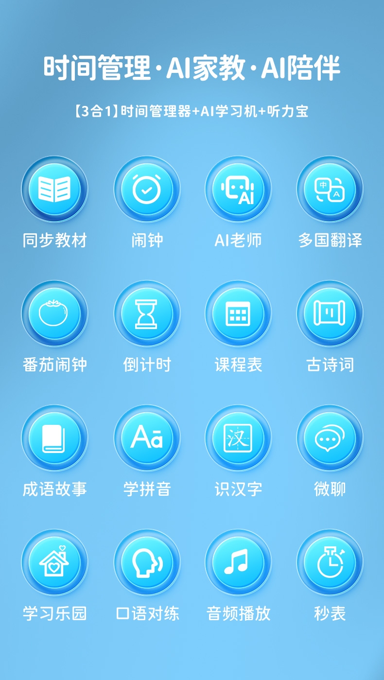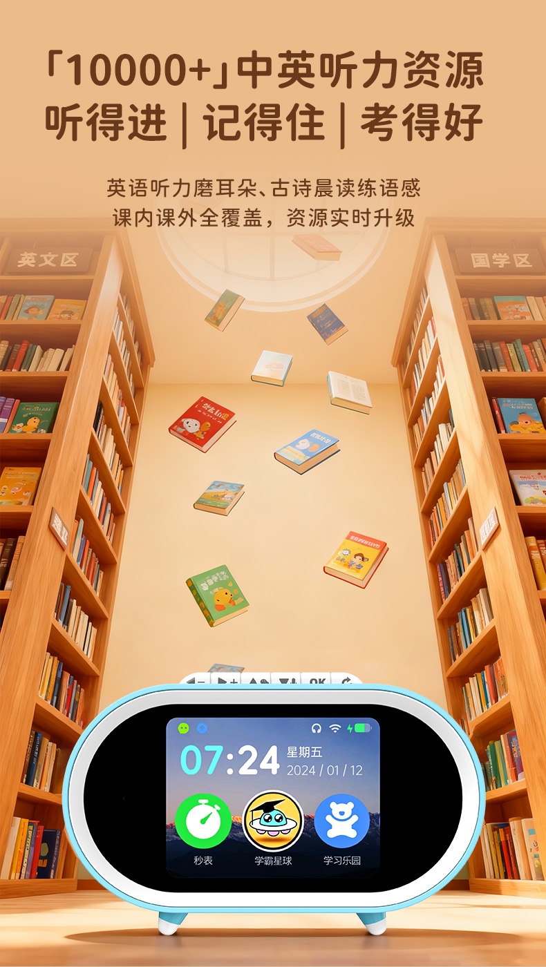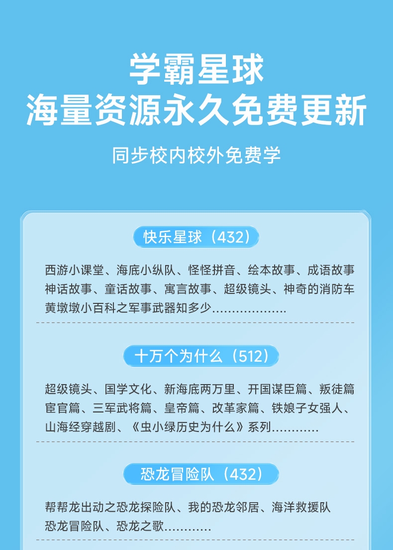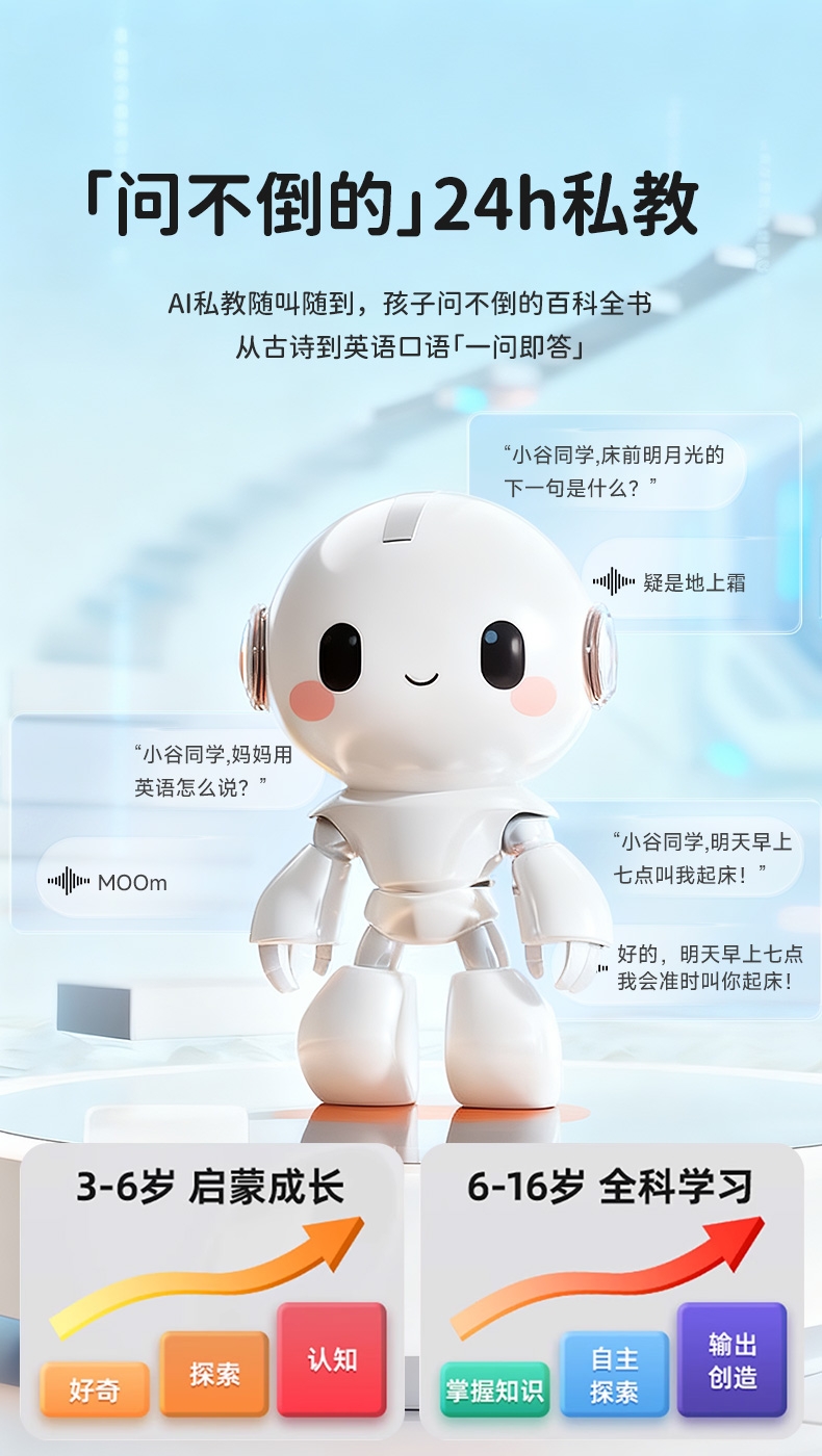 搭载京东和讯飞星火双模型,全语音控制;覆盖1-9年级同步教材,在家也能陪孩子一起学习成长;学霸星球,100万+海量正版免费内容,娱乐与学习兼